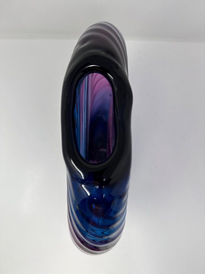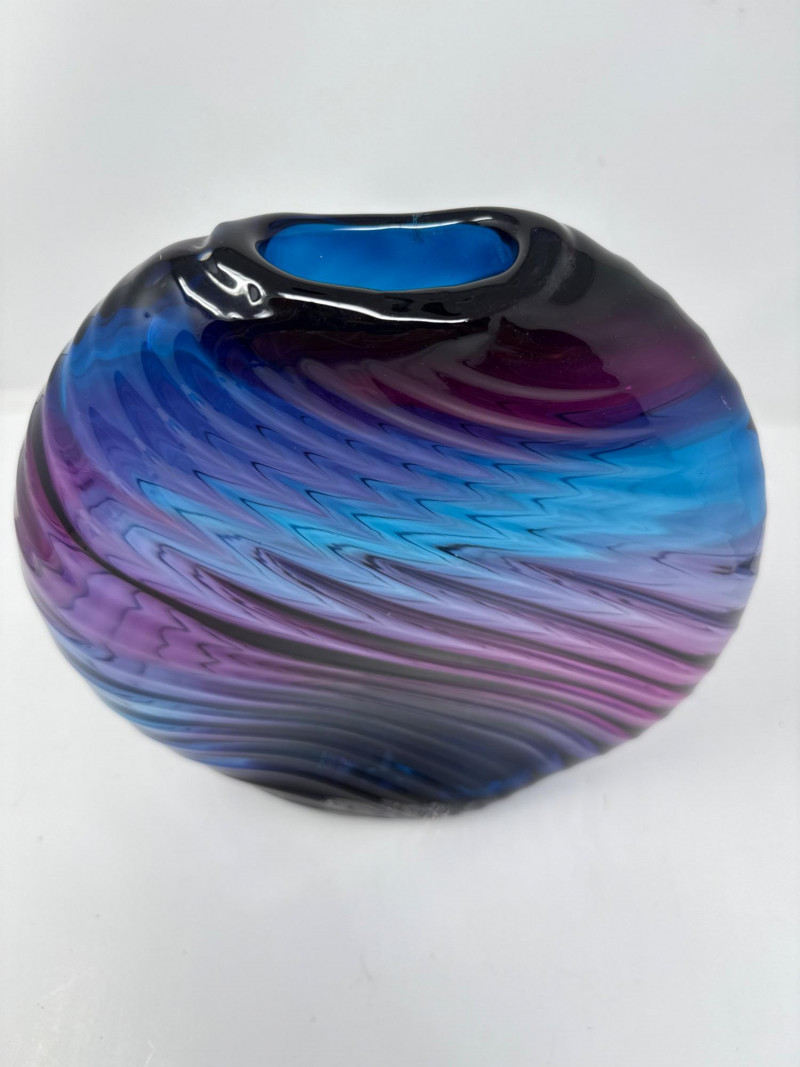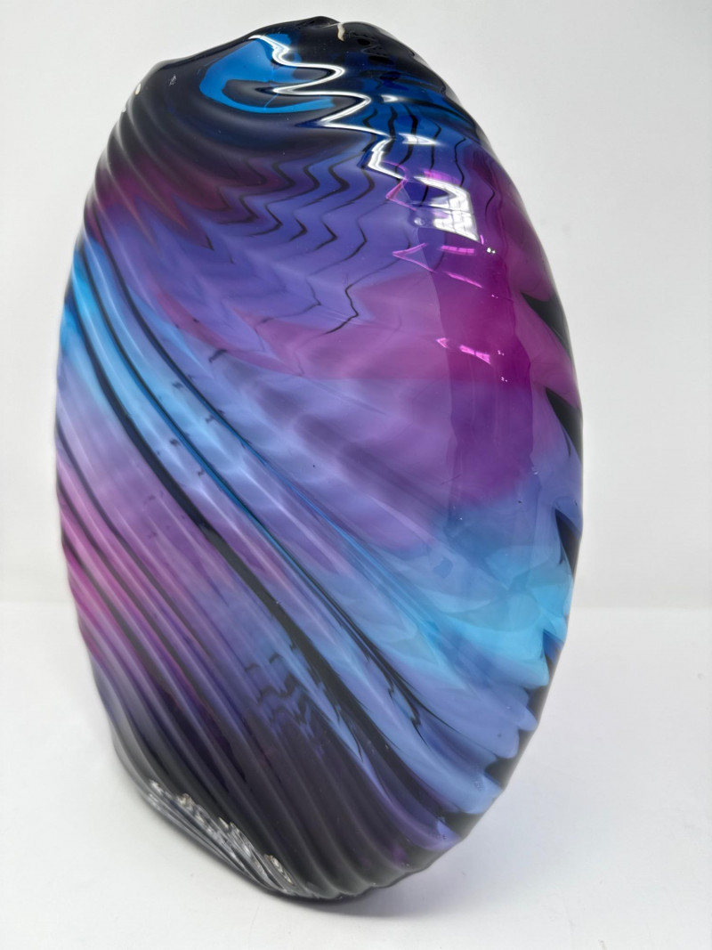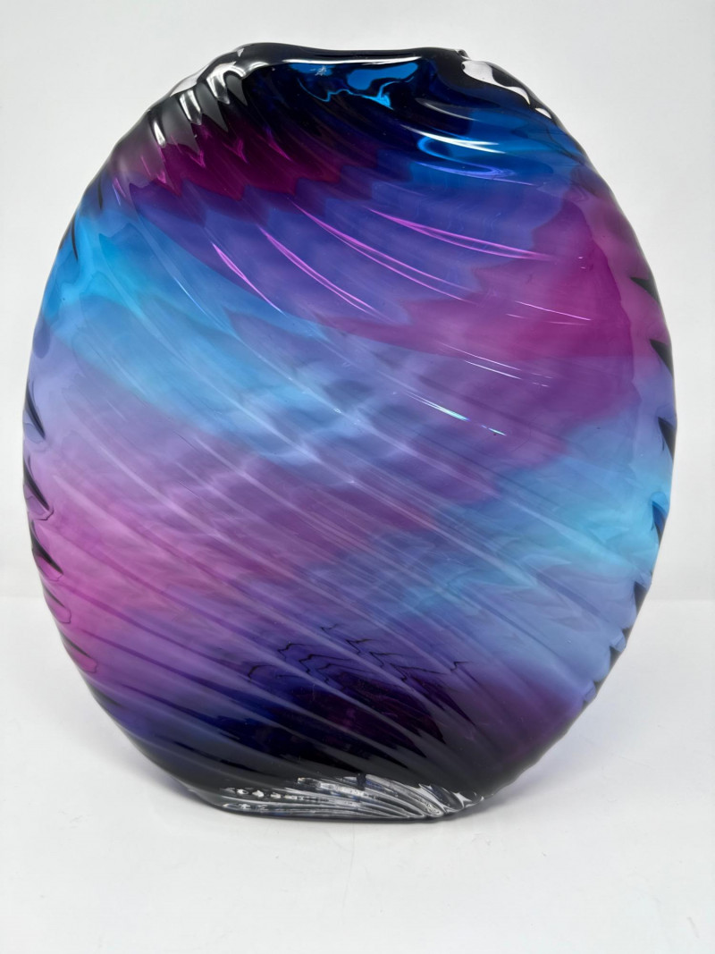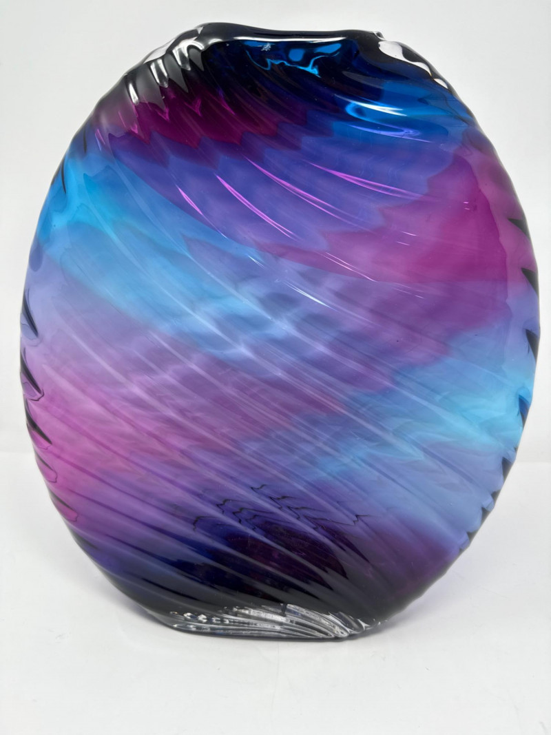 A striking example of contemporary studio glass, this signed Dan Bergman vase features a bold disc-shaped silhouette with a smooth, polished finish. The piece showcases a captivating gradient of deep blue and purple hues, enhanced by a swirling surface texture that adds movement and depth. Signed by the artist on the underside, this vase reflects Bergman's signature style—elegant, modern, and richly expressive. Details: Artist: Dan Bergman Signature: Signed on underside Dimensions: Approx. 11" length × 12.5" width Color: Gradient blend of blue and purple tones Form: Disc-shaped with wave-like surface texture