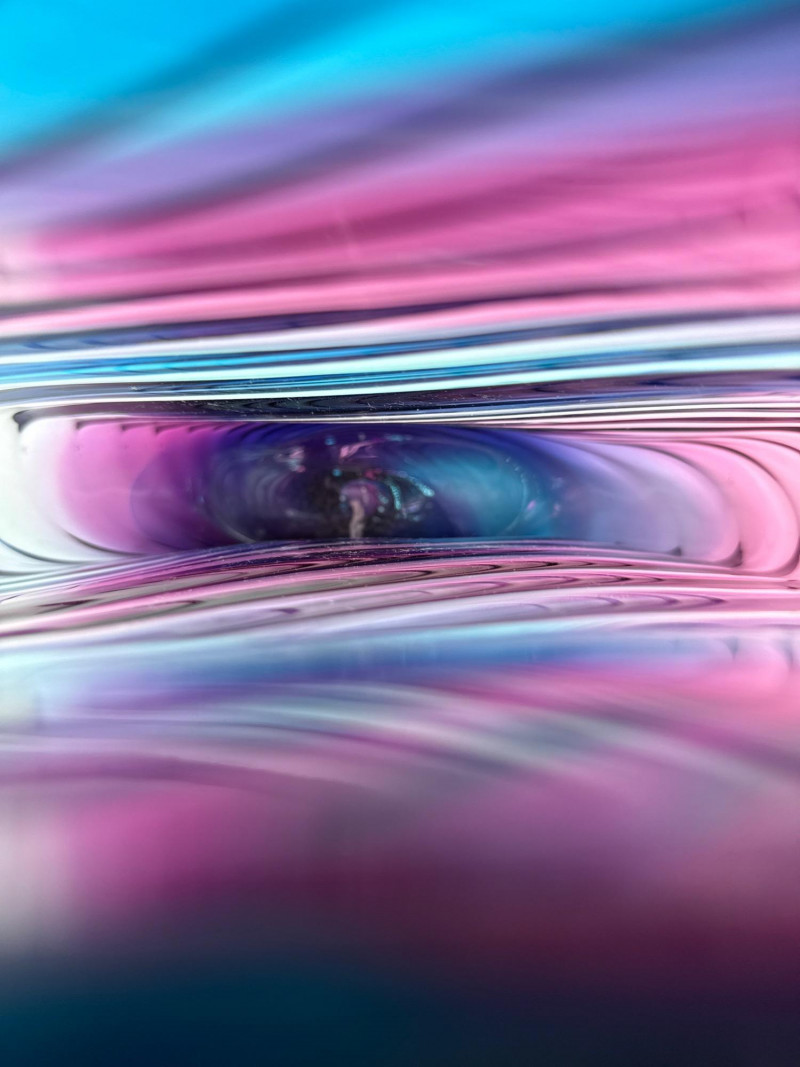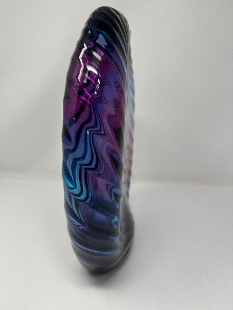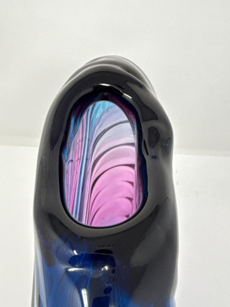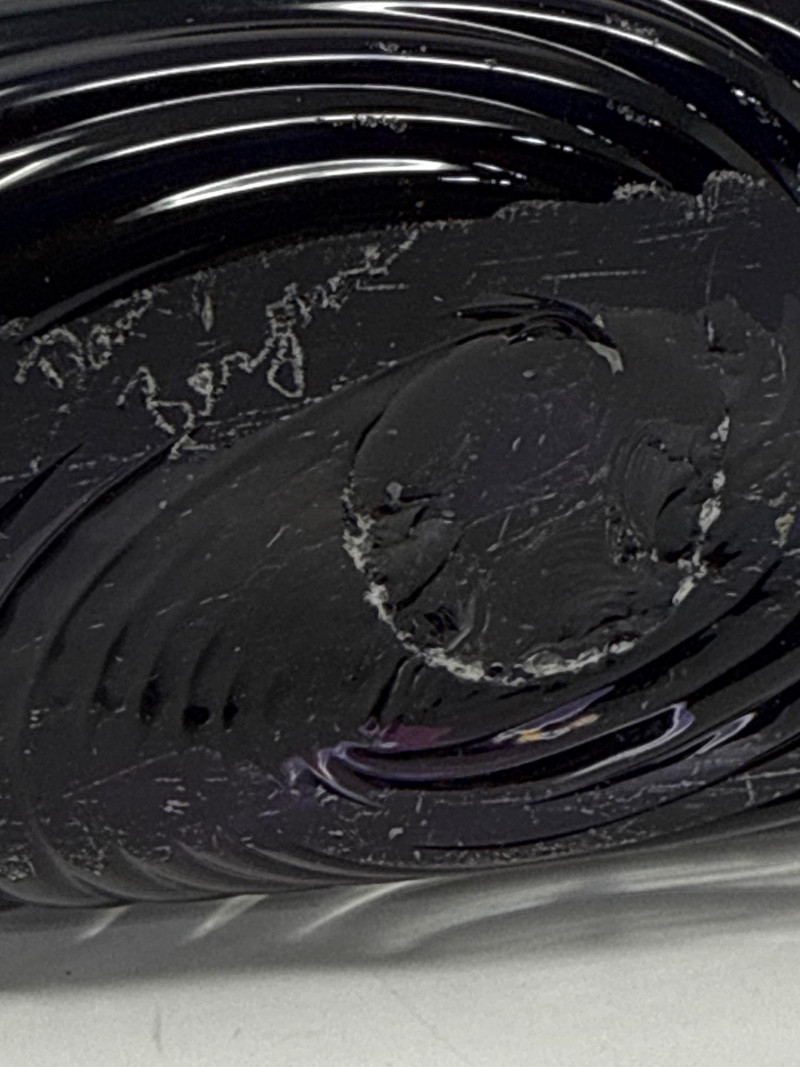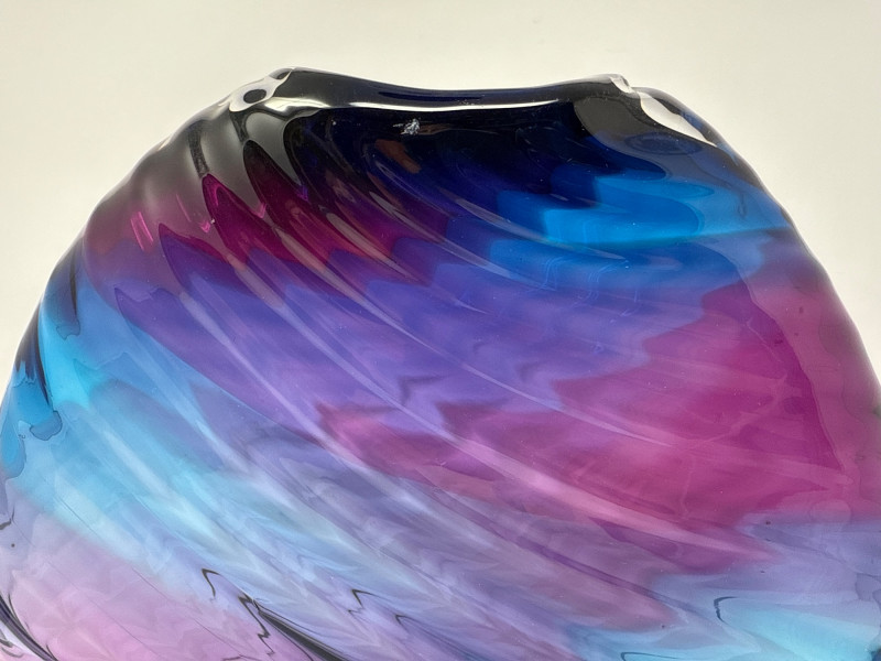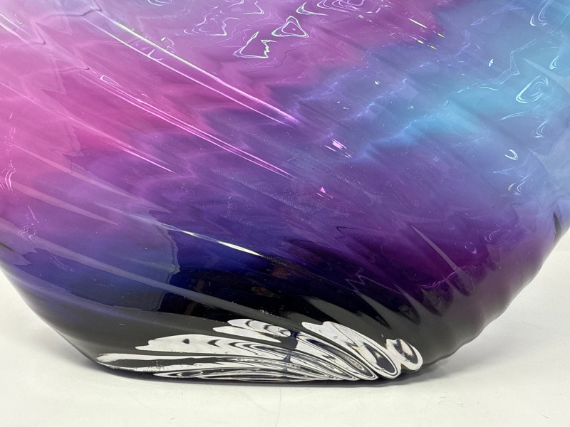 A striking example of contemporary studio glass, this signed Dan Bergman vase features a bold disc-shaped silhouette with a smooth, polished finish. The piece showcases a captivating gradient of deep blue and purple hues, enhanced by a swirling surface texture that adds movement and depth. Signed by the artist on the underside, this vase reflects Bergman's signature style—elegant, modern, and richly expressive. Details: Artist: Dan Bergman Signature: Signed on underside Dimensions: Approx. 11" length × 12.5" width Color: Gradient blend of blue and purple tones Form: Disc-shaped with wave-like surface texture