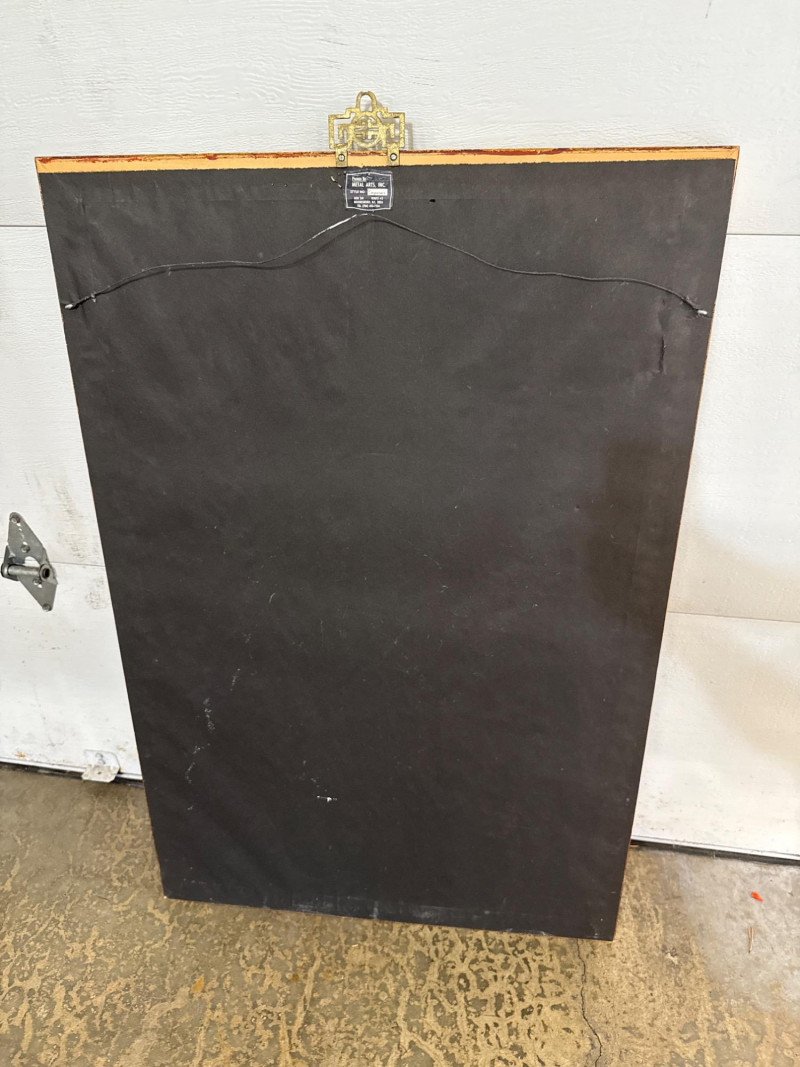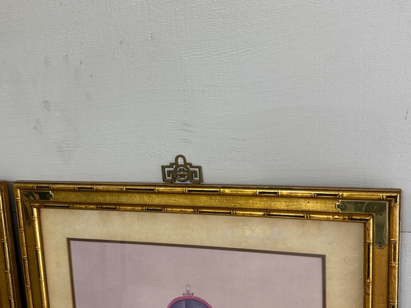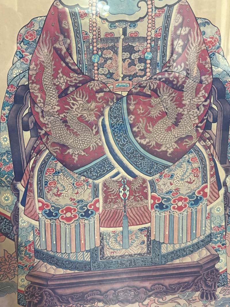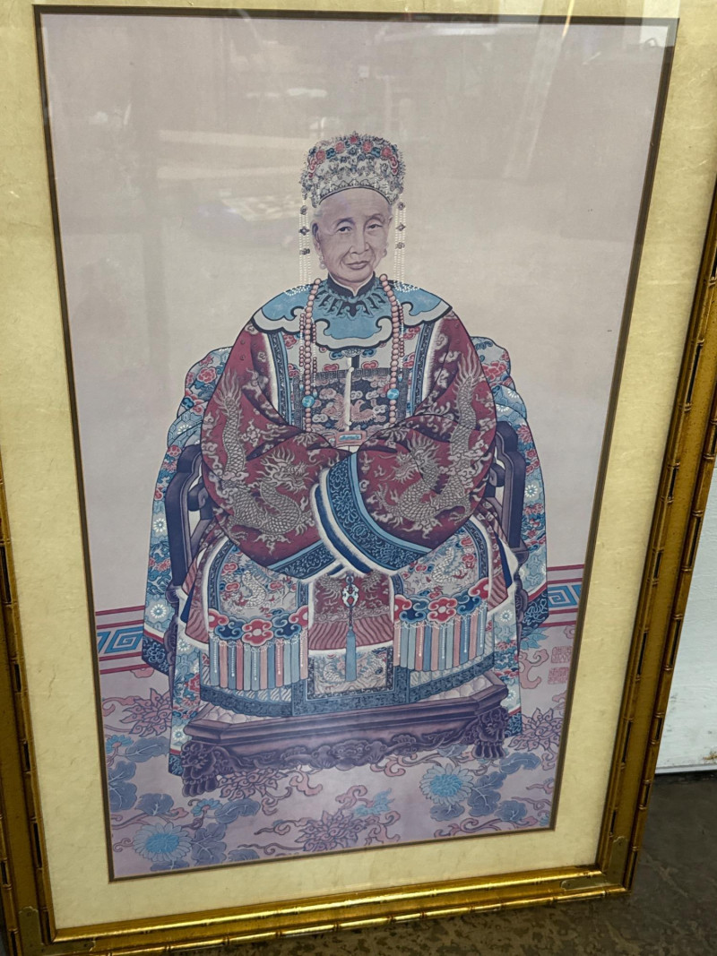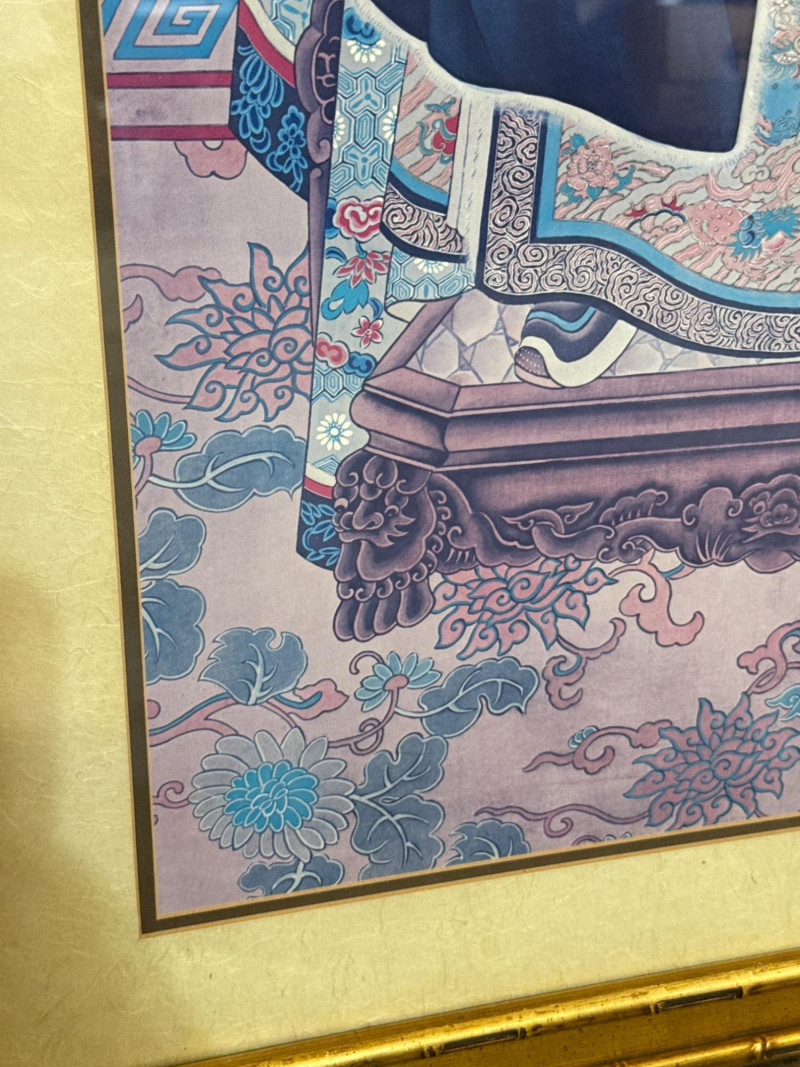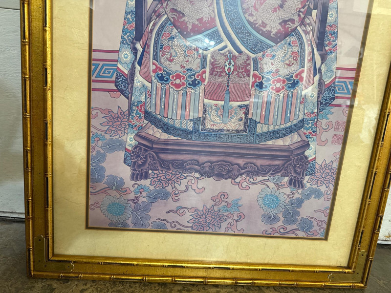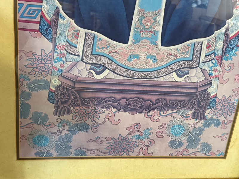 A pair of Chinese portrait prints depicting an emperor and empress in ceremonial court attire, each rendered with refined detail and cultural symbolism. The emperor is shown in a deep blue robe adorned with dragon medallions, while the empress wears a richly patterned red and blue gown with phoenix motifs. Both figures are seated in dignified posture, evoking traditional imperial portraiture. Medium: Color prints on paper (under glass) Frame Dimensions: Approx. 28" H × 44" W each Framing: Matching gold-tone wood frames with protective glass Style: Traditional Chinese imperial portraiture