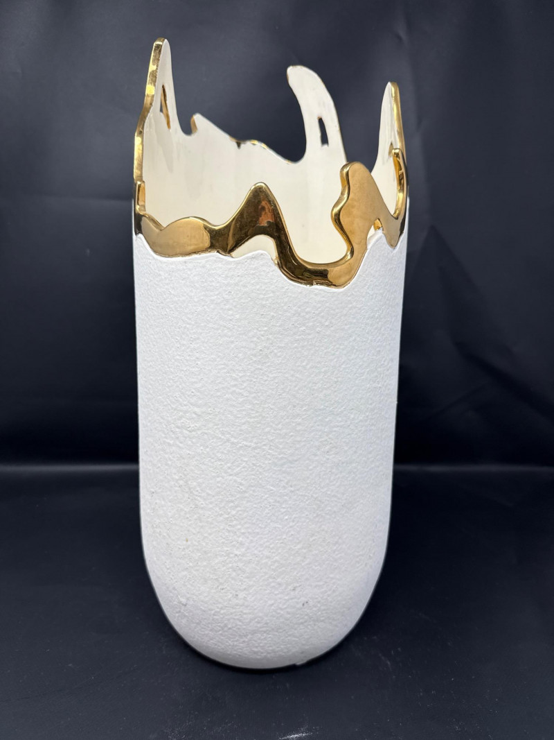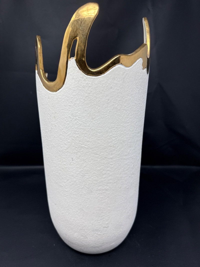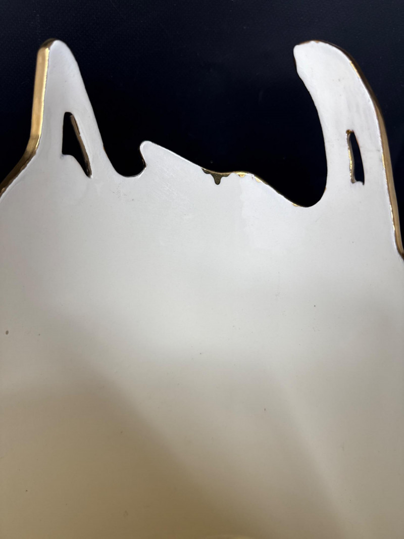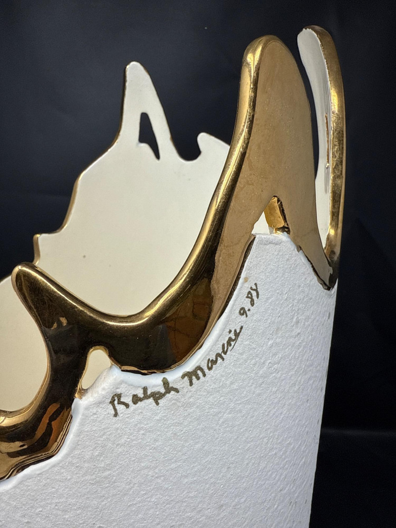Though little public biographical information is available on Ralph Majene, this signed vessel dated 1989 suggests a designer with a keen eye for sculptural form and contrast. His work here leans toward postmodern ceramic artistry—favoring texture, asymmetry, and metallic accenting over traditional symmetry or glaze uniformity. The name appears rarely in public auction records, which may indicate a regional or studio-based practice, adding intrigue and rarity to the piece. Vessel Overview- A visually arresting white and gold ceramic vessel, wide and shallow in profile, with a flame-like rim finished in reflective gold. The matte white body contrasts dramatically with the molten-edge effect, creating a piece that feels both organic and architectural. Dated 1989, it reflects late-20th-century decorative trends that embraced sculptural ceramics as standalone art objects. Specifications: Length: 7 inches Width: 16.5 inches Material: Ceramic (unconfirmed) Finish: White glaze with gold embellishment Profile: Wide and shallow—ideal for mantles, consoles, or gallery-style shelving Collector Notes: Vintage studio piece with bold visual impact Elegant neutral palette with luxury accents Lightweight and display-friendly Signed and dated, adding provenance appeal