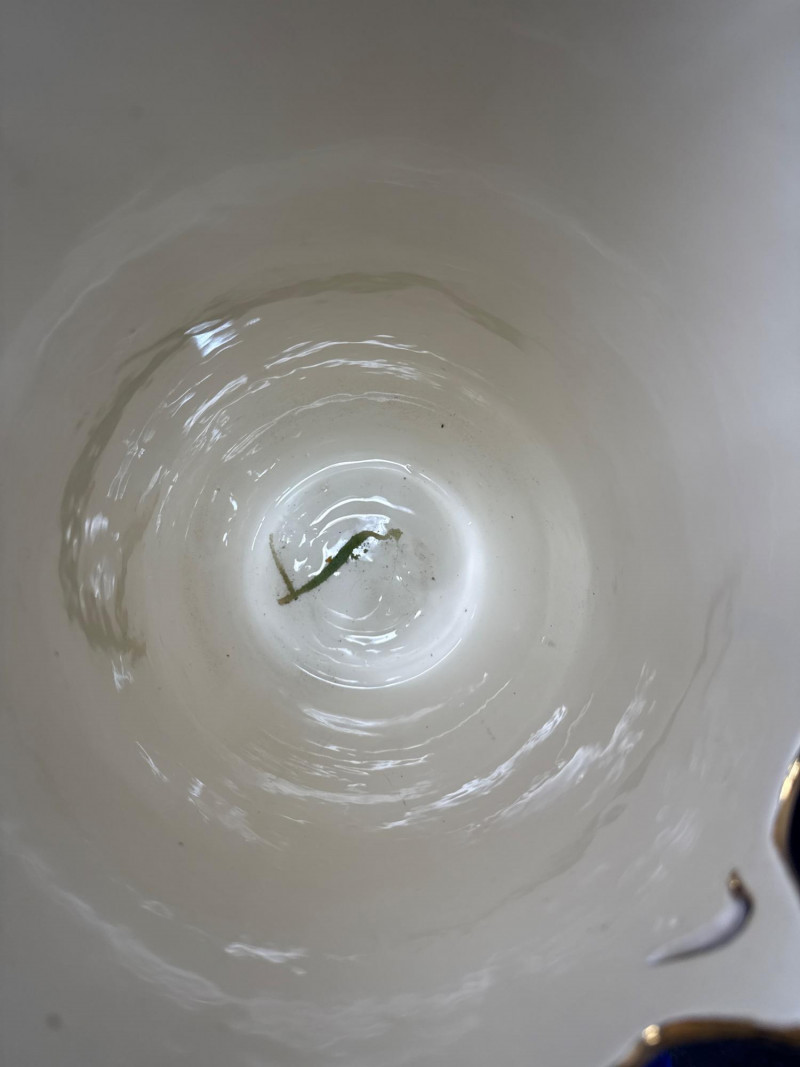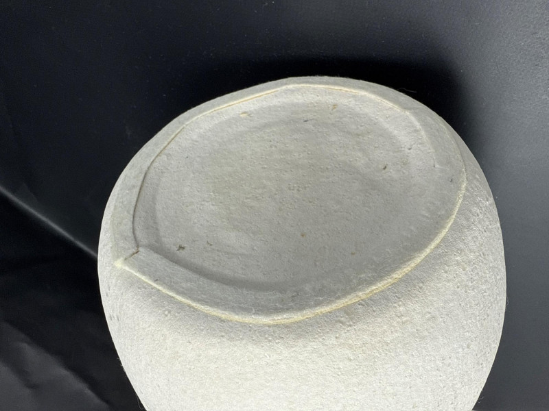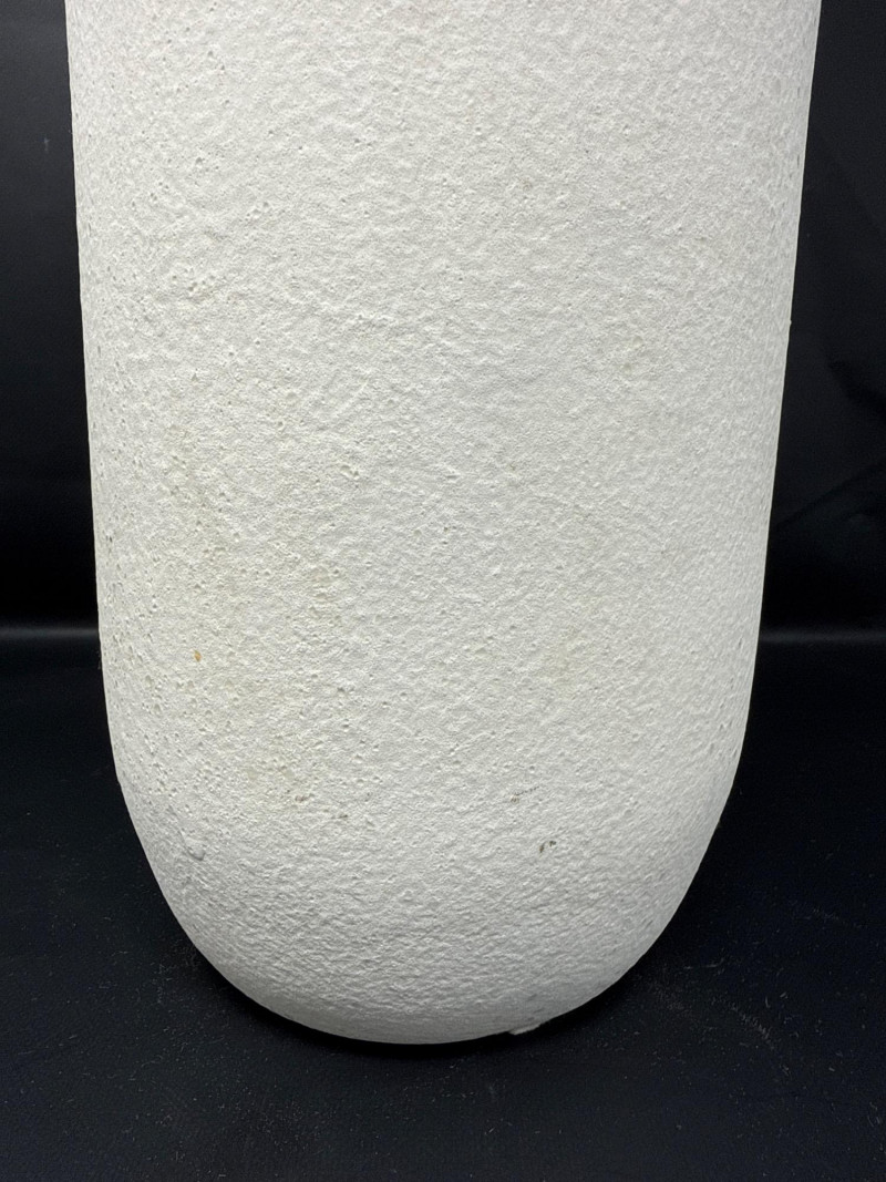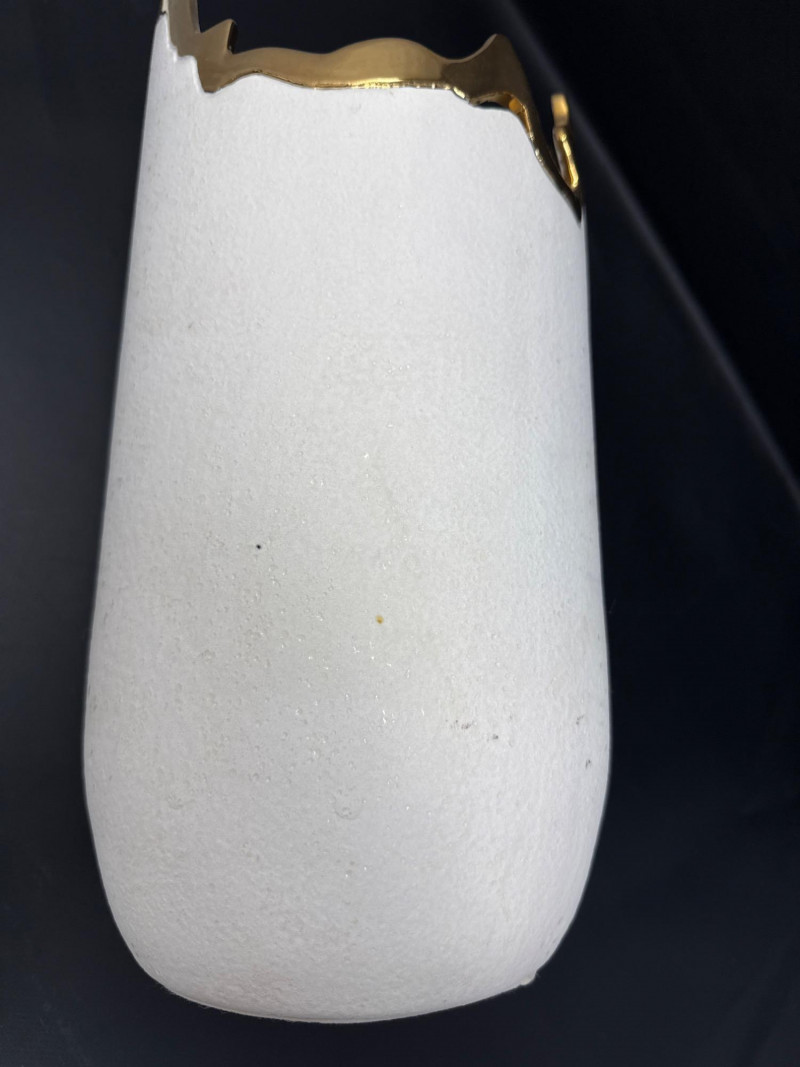 Though little public biographical information is available on Ralph Majene, this signed vessel dated 1989 suggests a designer with a keen eye for sculptural form and contrast. His work here leans toward postmodern ceramic artistry—favoring texture, asymmetry, and metallic accenting over traditional symmetry or glaze uniformity. The name appears rarely in public auction records, which may indicate a regional or studio-based practice, adding intrigue and rarity to the piece. Vessel Overview- A visually arresting white and gold ceramic vessel, wide and shallow in profile, with a flame-like rim finished in reflective gold. The matte white body contrasts dramatically with the molten-edge effect, creating a piece that feels both organic and architectural. Dated 1989, it reflects late-20th-century decorative trends that embraced sculptural ceramics as standalone art objects. Specifications: Length: 7 inches Width: 16.5 inches Material: Ceramic (unconfirmed) Finish: White glaze with gold embellishment Profile: Wide and shallow—ideal for mantles, consoles, or gallery-style shelving Collector Notes: Vintage studio piece with bold visual impact Elegant neutral palette with luxury accents Lightweight and display-friendly Signed and dated, adding provenance appeal
