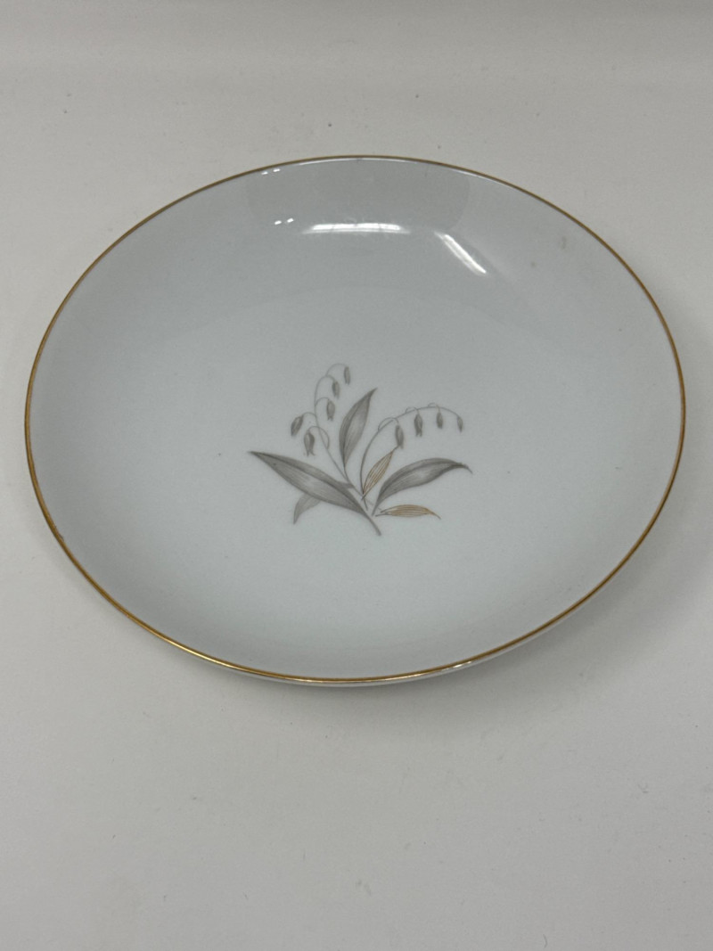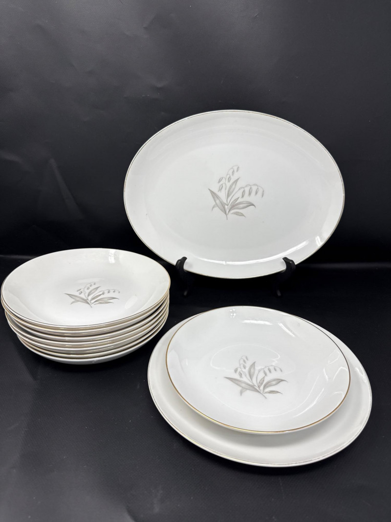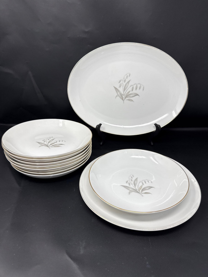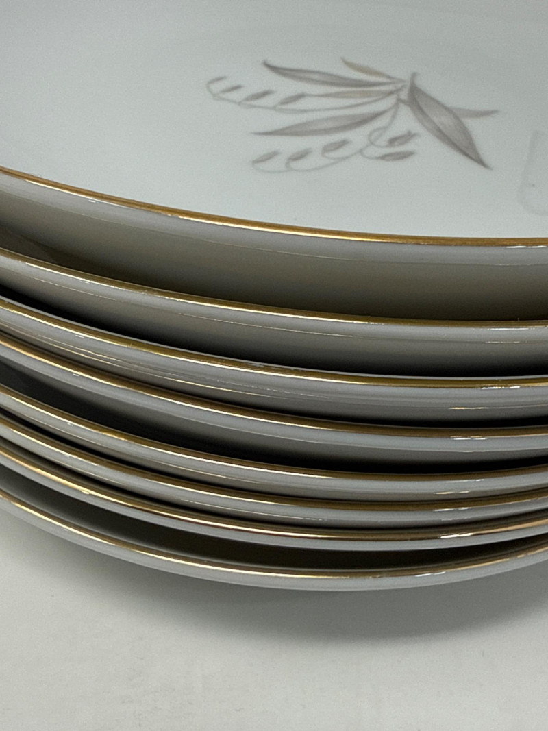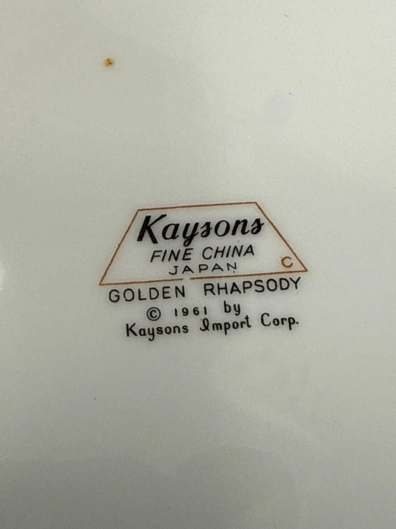 Elegant mid‑century Kaysons porcelain in the sought‑after Golden Rhapsody pattern, featuring delicate gold‑trimmed leaf motifs on bright white glaze. A versatile assortment perfect for both display and service. Contents: Salad Bowls (8) – 7¼″ diameter, gently flared rim, gold‑trim accents Dinner Plate (1) – 10¼″ diameter, matching border design Serving Platter (1) – 12″ length × 9″ width, oval form with wide decorative rim Dimensions: Platter: 12″ L × 9″ W Other pieces in standard pattern sizes for the set Pattern & Style: Maker: Kaysons Fine China Pattern: Golden Rhapsody (discontinued) Era: Mid‑20th century (c. 1960s) White porcelain with gold‑trimmed stylized leaf motif Condition: Very good vintage condition with minimal surface wear consistent with age No chips, cracks, or repairs observed Gold detailing remains bright Additional Notes: Backstamped with Kaysons hallmark Hand‑wash recommended to preserve gold detail