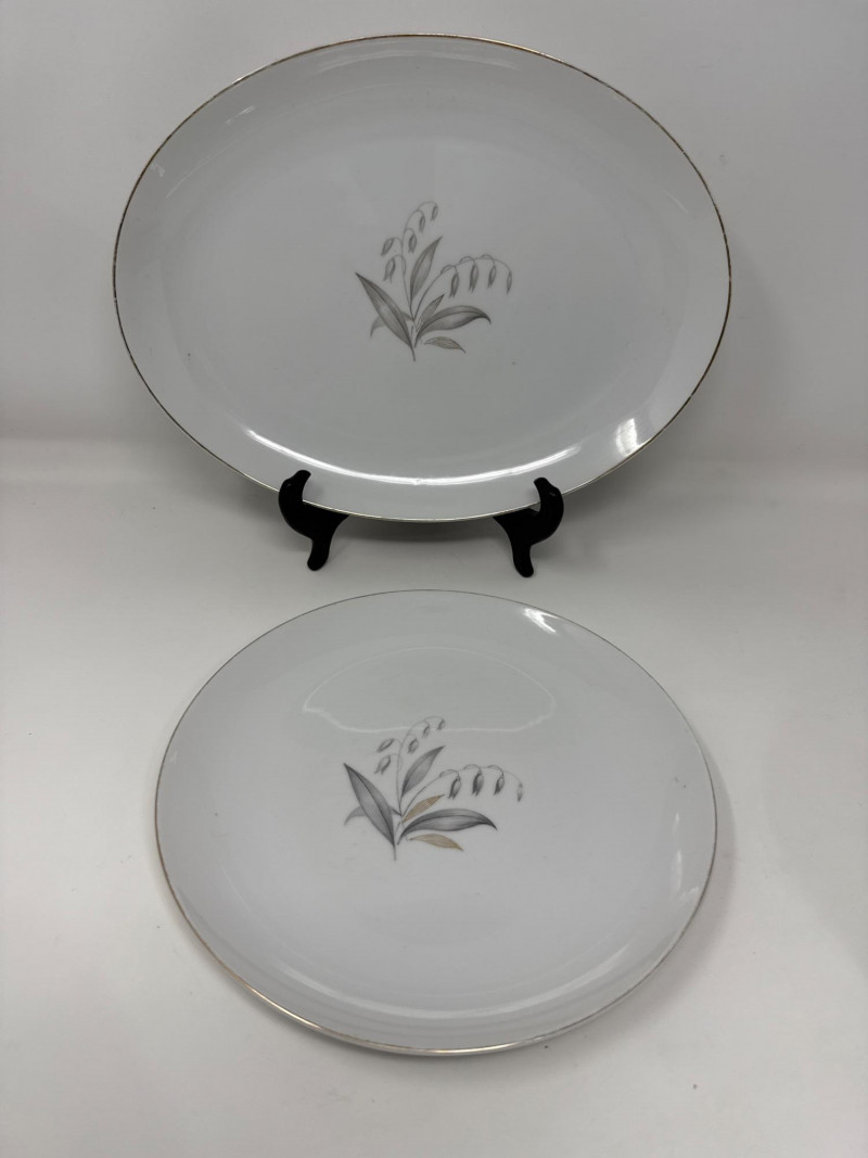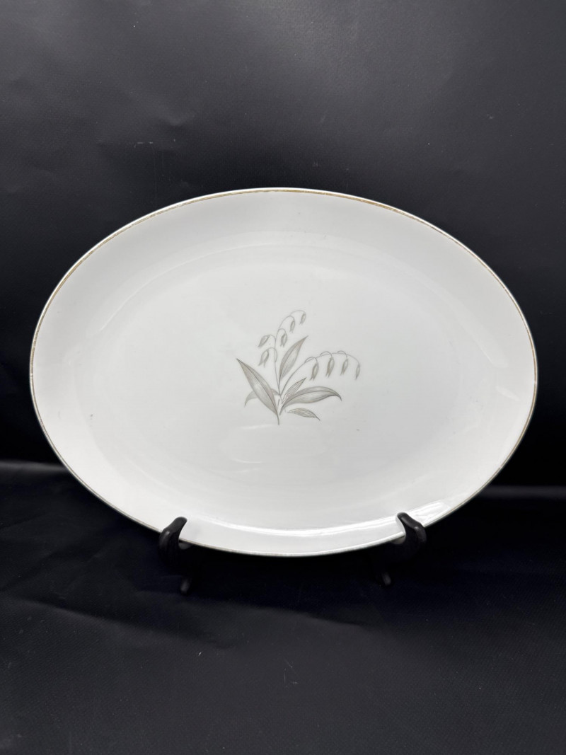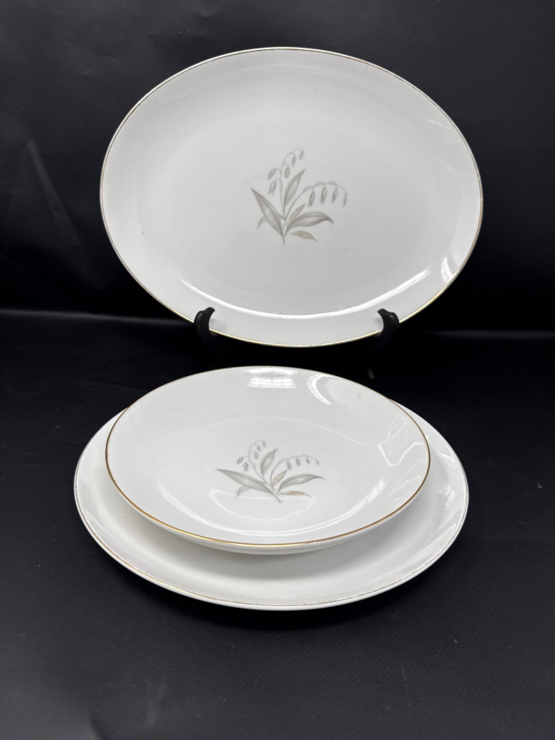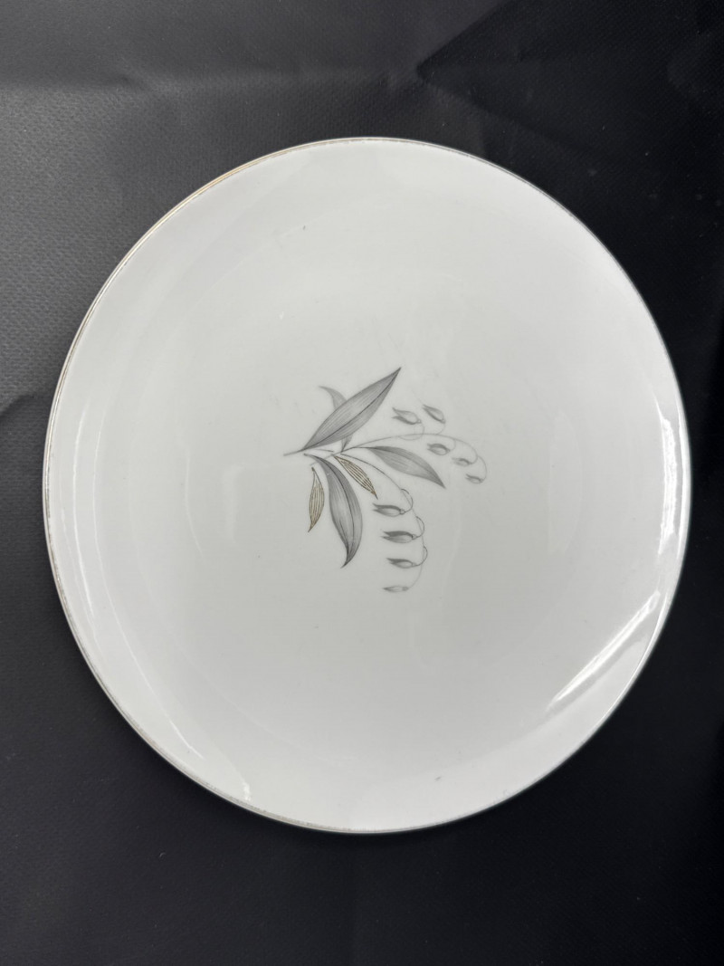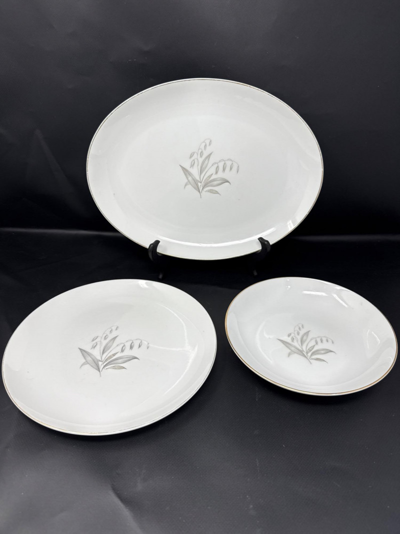 Elegant mid‑century Kaysons porcelain in the sought‑after Golden Rhapsody pattern, featuring delicate gold‑trimmed leaf motifs on bright white glaze. A versatile assortment perfect for both display and service. Contents: Salad Bowls (8) – 7¼″ diameter, gently flared rim, gold‑trim accents Dinner Plate (1) – 10¼″ diameter, matching border design Serving Platter (1) – 12″ length × 9″ width, oval form with wide decorative rim Dimensions: Platter: 12″ L × 9″ W Other pieces in standard pattern sizes for the set Pattern & Style: Maker: Kaysons Fine China Pattern: Golden Rhapsody (discontinued) Era: Mid‑20th century (c. 1960s) White porcelain with gold‑trimmed stylized leaf motif Condition: Very good vintage condition with minimal surface wear consistent with age No chips, cracks, or repairs observed Gold detailing remains bright Additional Notes: Backstamped with Kaysons hallmark Hand‑wash recommended to preserve gold detail
