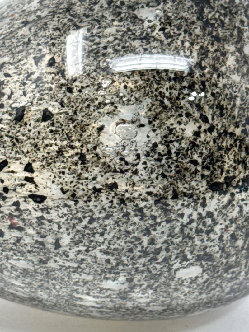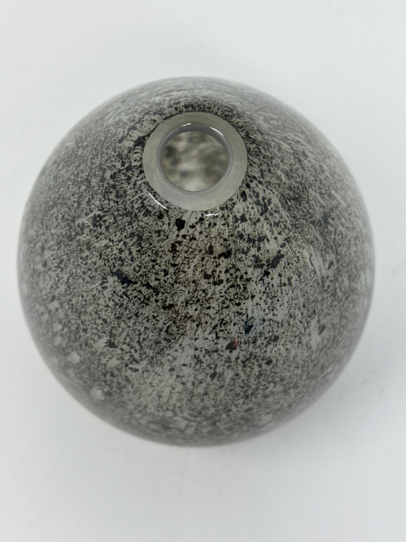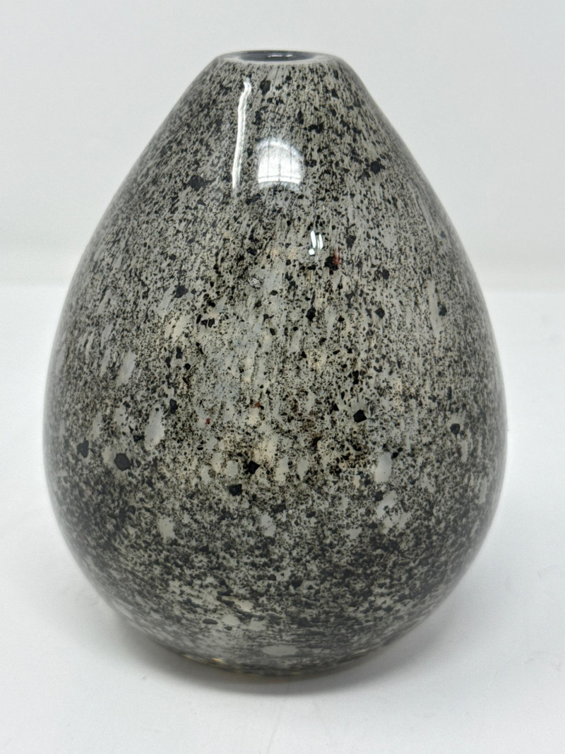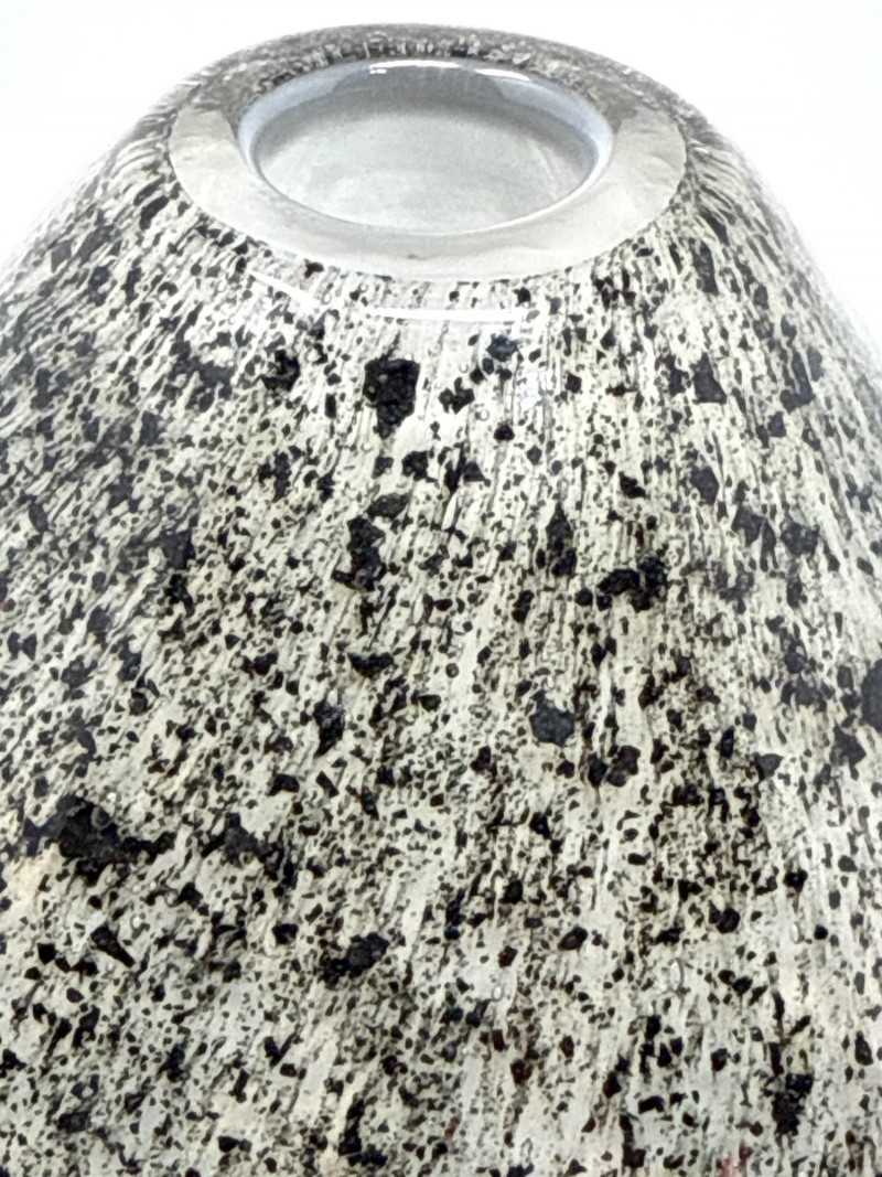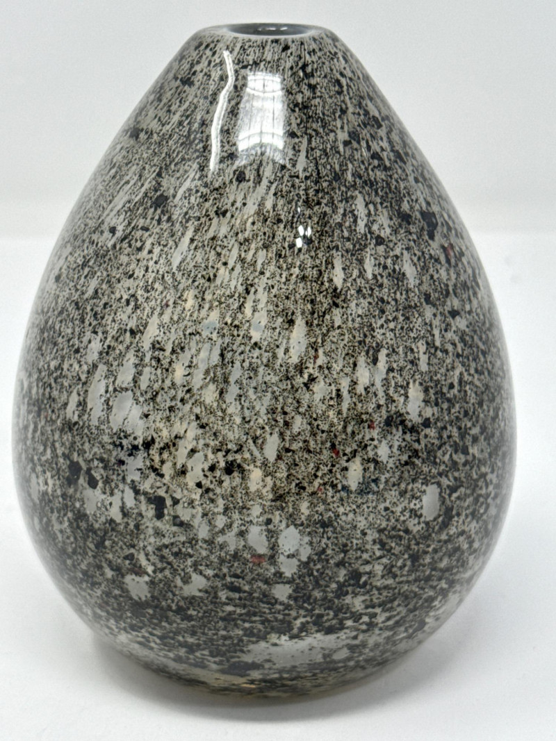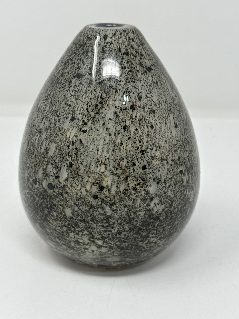 A decorative vase crafted in contrasting black and clear glass, enhanced by an evenly speckled surface pattern that lends depth and visual interest. The piece bears a signature, underscoring its authenticity and collector appeal. Width: 4 in (approx. 10.2 cm) Height: 5 in (approx. 12.7 cm) Signature: Yes (etched/engraved) Material: Hand‑blown art glass Color: Black with clear sections Design Feature: Deliberate speckled effect within the clear glass, enhancing texture and light play Influence: Mid‑Century Modern / Studio Glass tradition Era: Likely mid to late 20th century (confirmation strengthens provenance) Condition: Excellent – no chips, cracks, or repairs noted Finish: Smooth polished pontil; uniform form and symmetry Speckled art glass offers unique optical depth and texture prized by collectors. The signed base, contrasting tones, and intentional patterning make this vase an eye‑catching addition to a curated glass collection or modern interior.Dimensions: