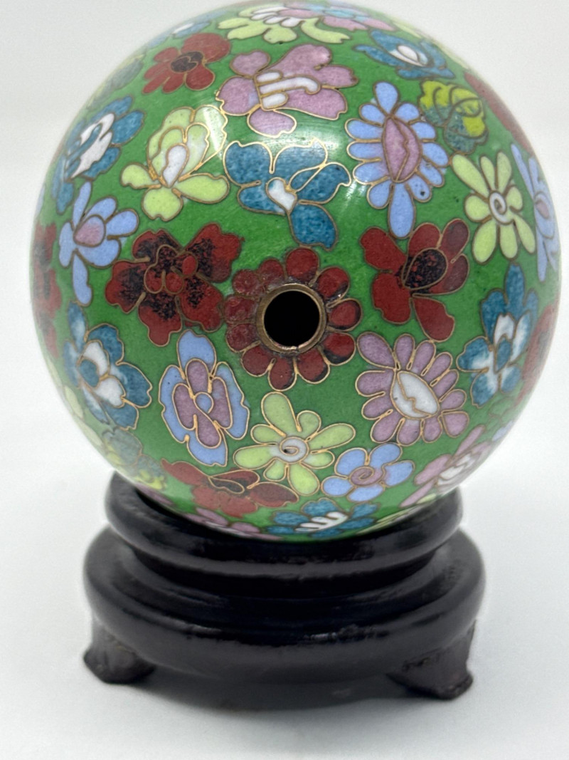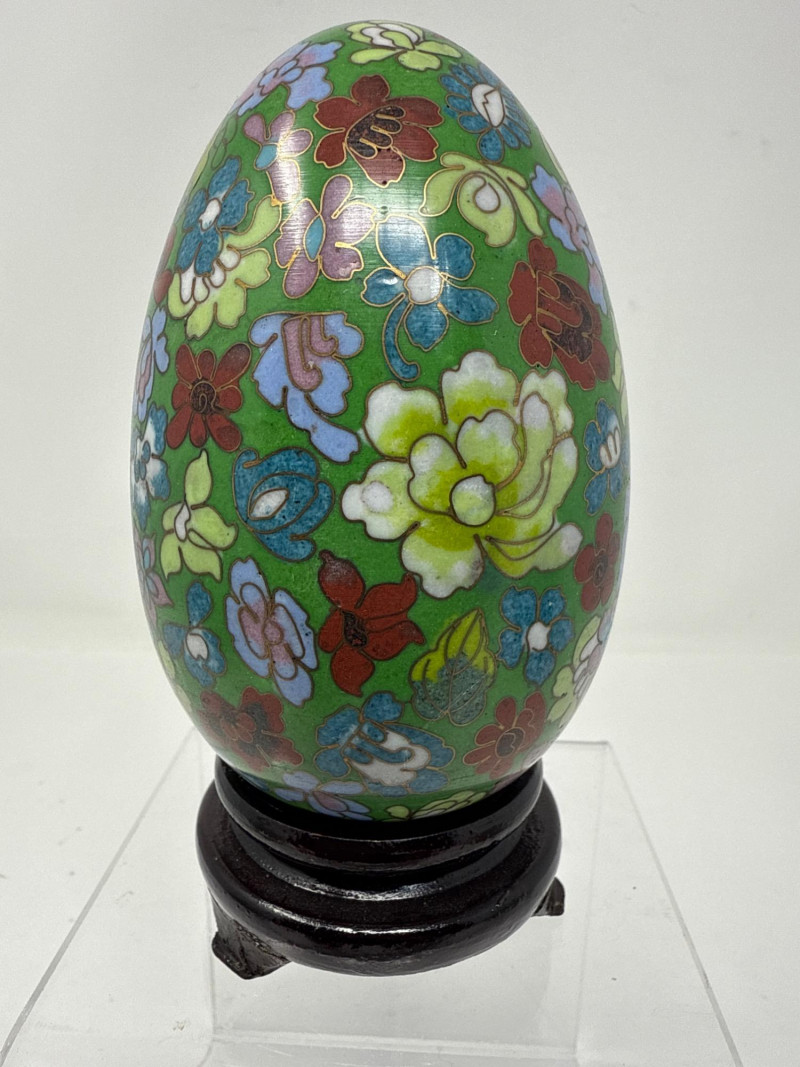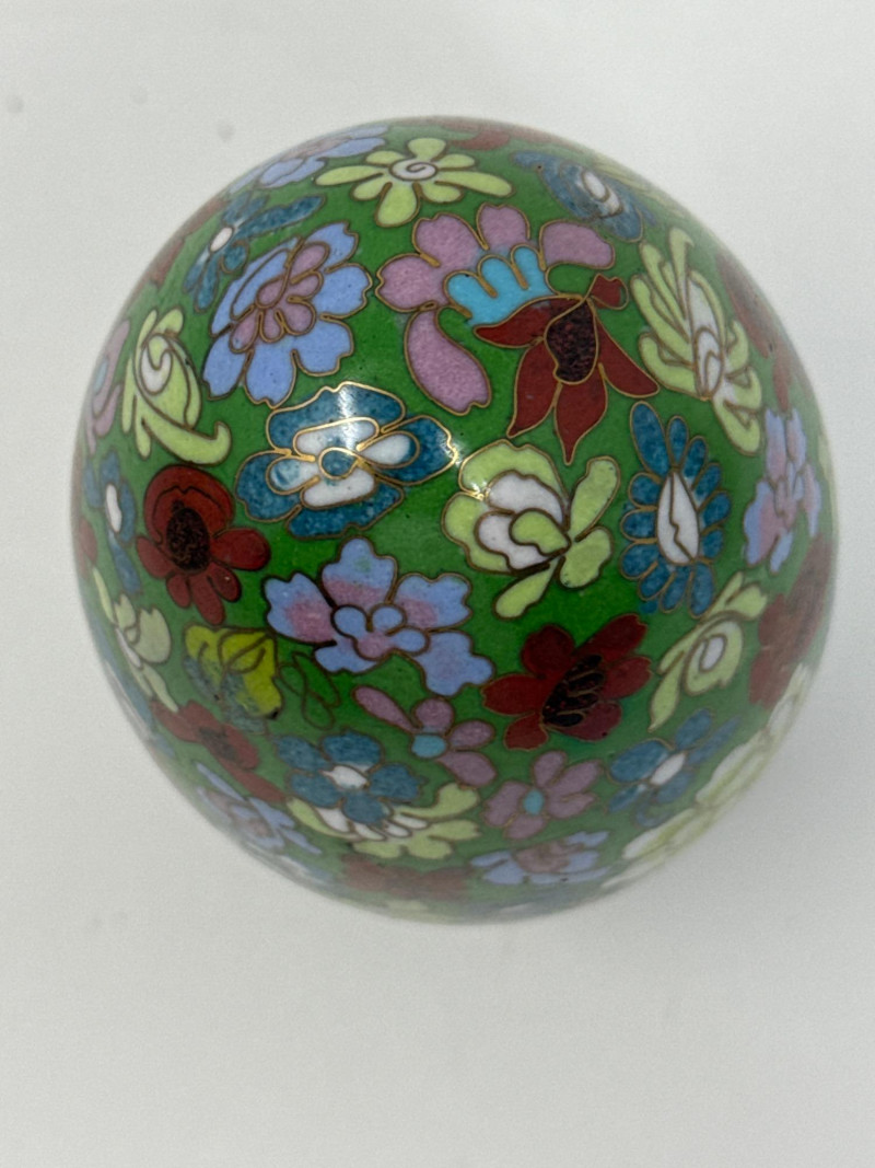 A decorative grouping featuring two Chinese Famille Rose porcelain ginger jars paired with a cloisonné enamel egg. The jars are hand-painted in the traditional Famille Rose palette, with floral sprays, auspicious motifs, and gilt accents rendered in fine brushwork. Each jar is globular with a domed lid, likely mid-20th century, and reflects the refined aesthetic associated with Jingdezhen porcelain. The accompanying cloisonné egg offers sculptural contrast, showcasing vibrant enamel over brass with intricate wire inlay, echoing the floral themes of the jars. Dimensions (Jars): Approx. 6 in. tall × 5 in. wide Dimensions (Egg): Approx. 4.5 in. tall × 4.5 in. wide Medium: Porcelain with enamel decoration (jars); brass with cloisonné enamel (egg) Origin: China, mid-20th century A cohesive trio ideal for collectors of Chinese decorative arts or vintage enamelware. Lucite display stands not included. Please refer to photos for detail.