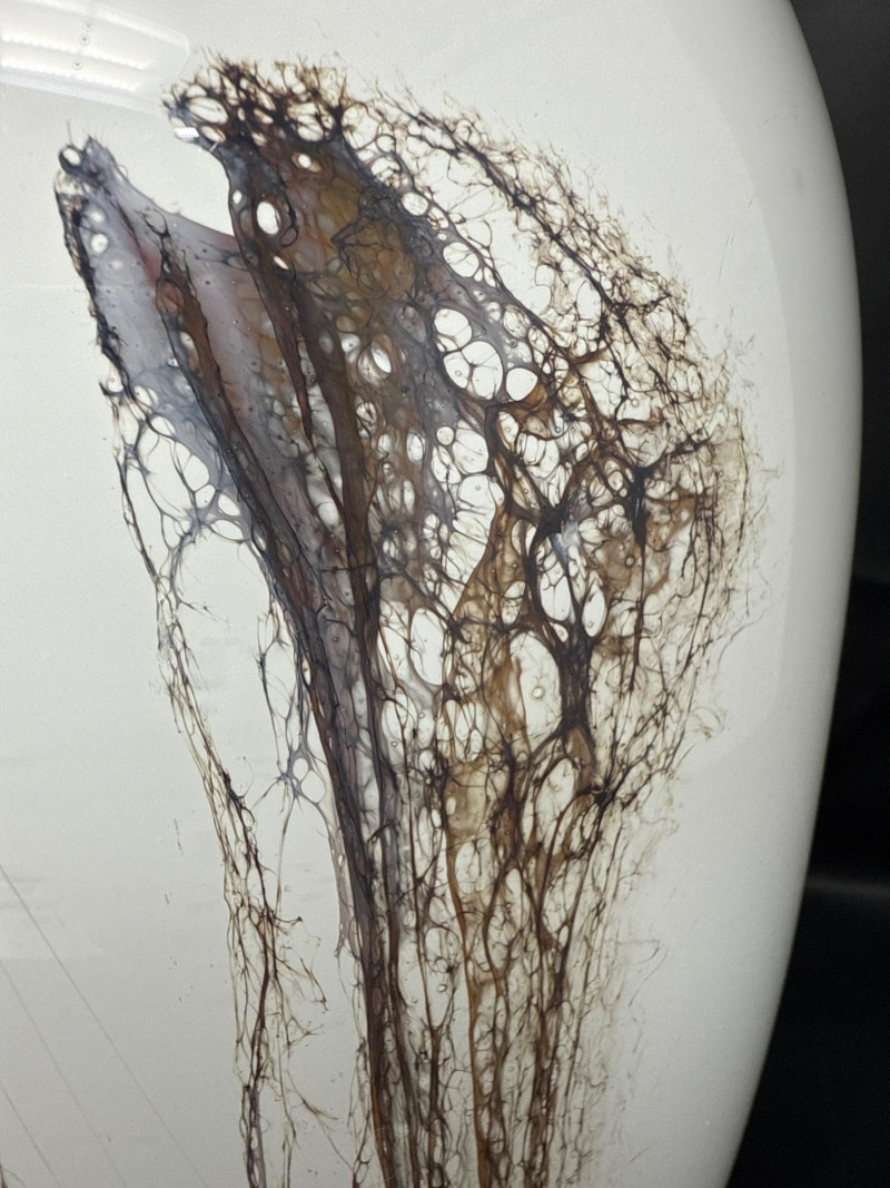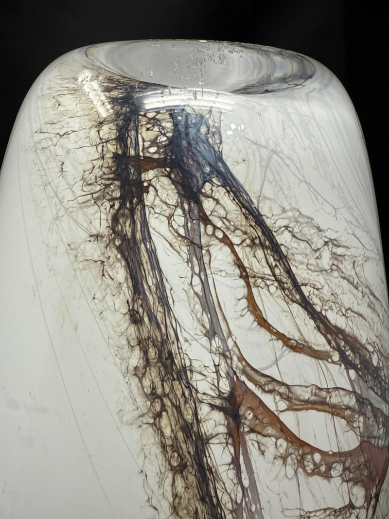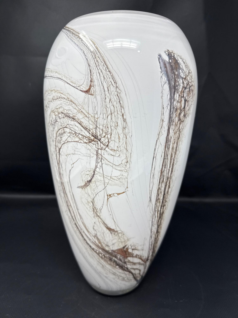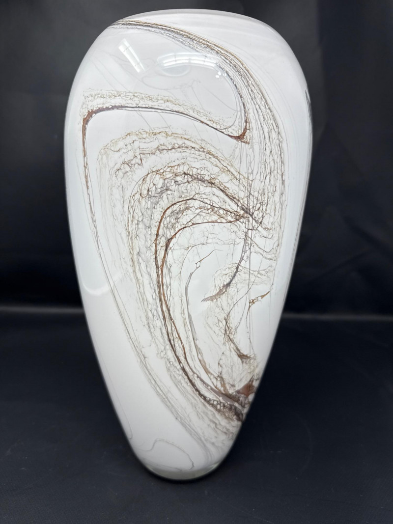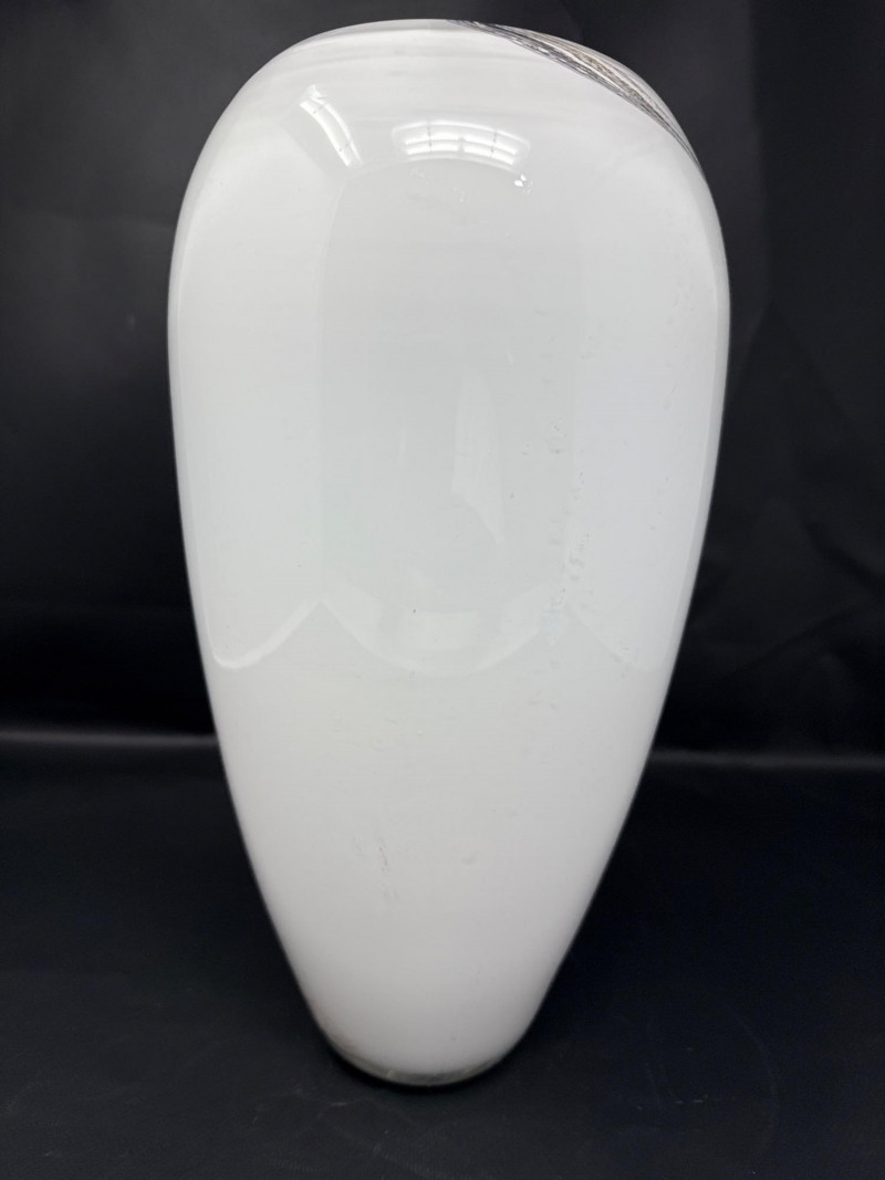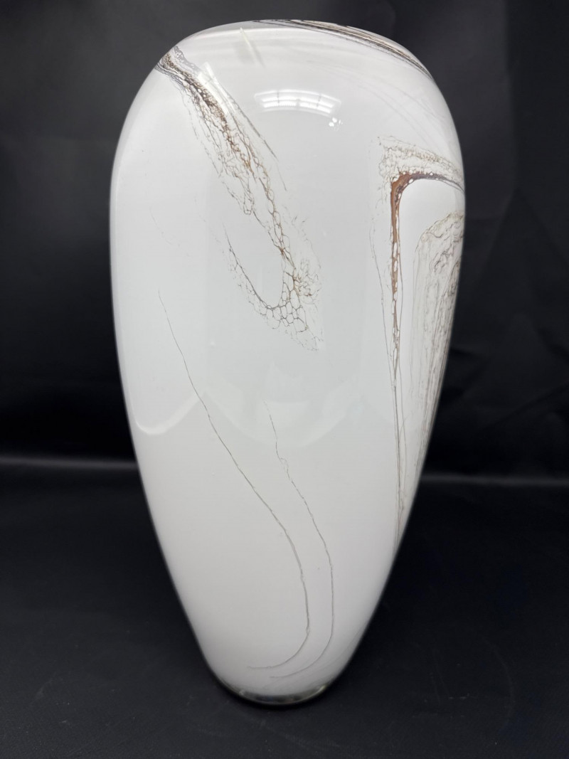 An exceptional work of modern studio glass, this tapered vase is signed by acclaimed glass artist Dan Bergsma, known for his elegant forms and mastery of color. The piece features a sleek, elongated silhouette with subtle curvature, emphasizing the clarity and craftsmanship of the hand-blown glass. Signature: Etched “Dan Bergsma” Material: Hand-blown art glass with a smooth, polished surface Coloration: Rich tonal gradients (please confirm exact palette from image) Condition: Appears excellent.