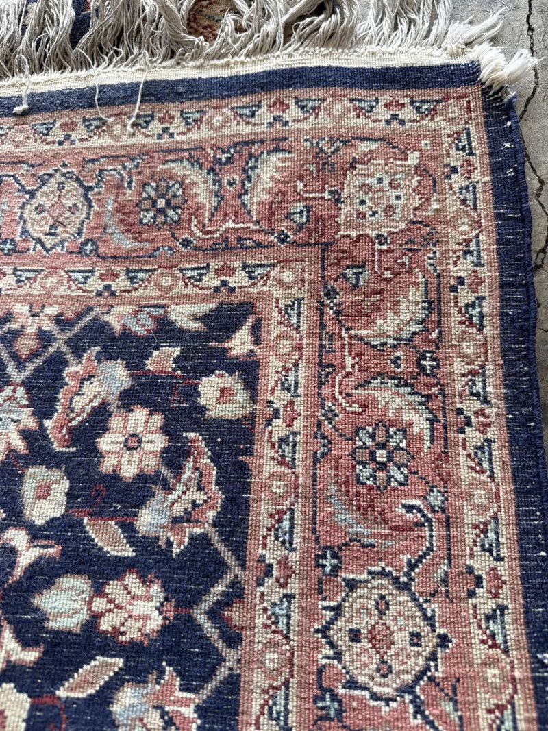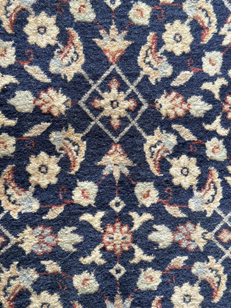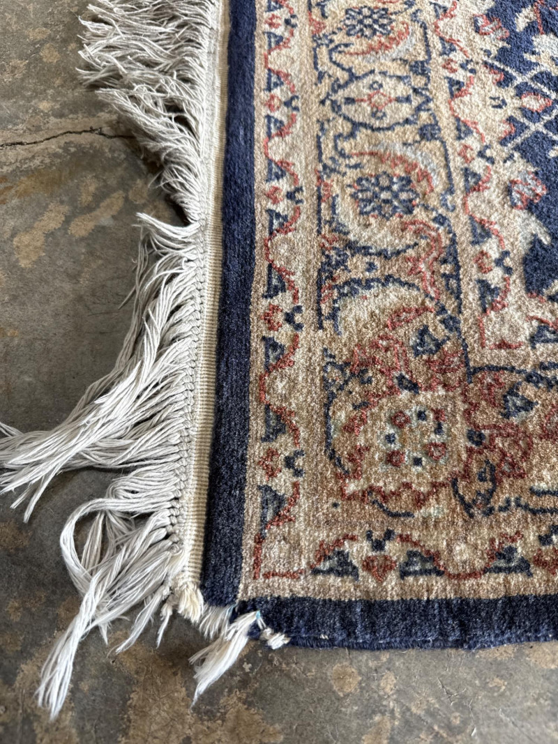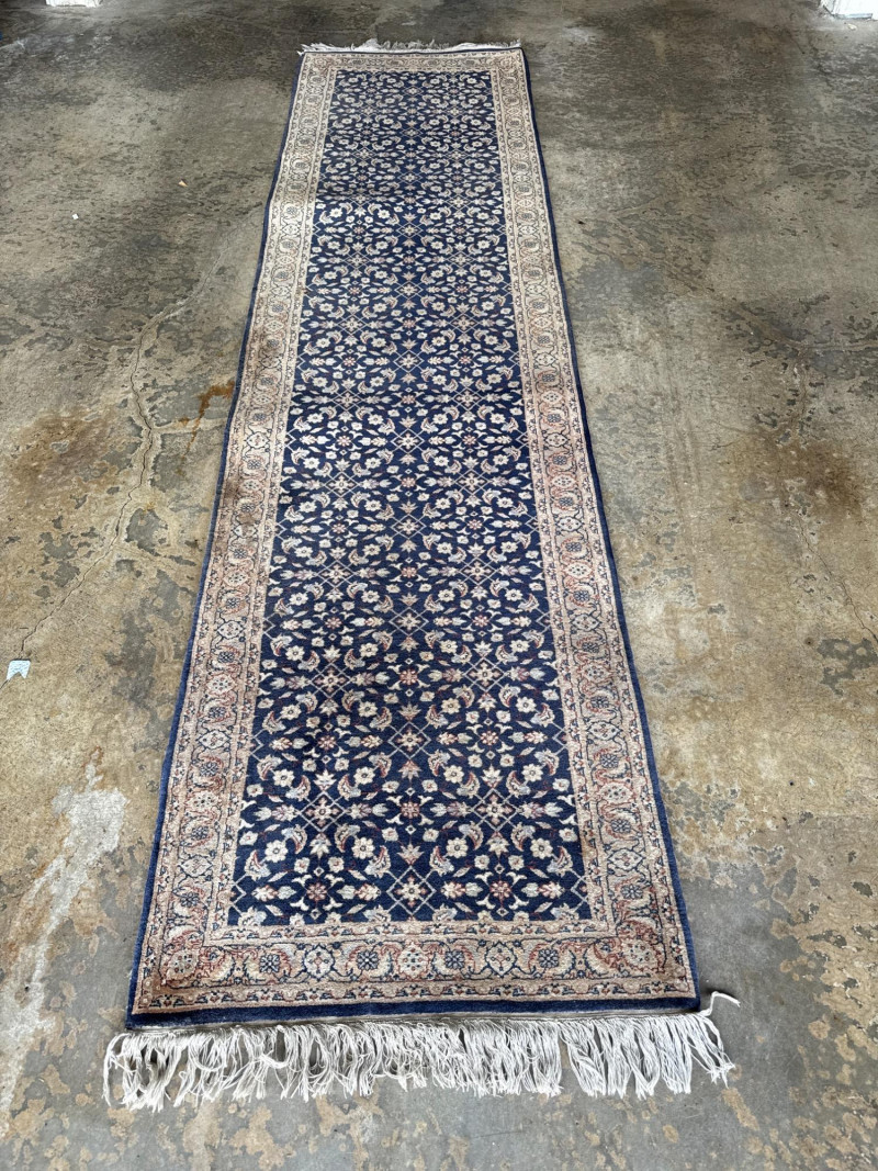 A hand-knotted wool runner rug, featuring a deep navy field with floral and vine motifs in cream and rose. The elongated format suits hallways or transitional spaces, while the medallion-style border adds timeless elegance. Dimensions: Approx. 128" L × 31.5" W Design: Central floral field with rose-accented medallion border Colorway: Navy, cream, muted rose, and pale blue Material: Wool (hand-knotted; fringe at one end confirms artisanal construction) Condition: Some subtle discoloration may be present, consistent with age and use. Pet hair and odor. No stains found. Recommend cleaning before use. Handling Note: Rug may require rolling or protective wrap for transport Provenance & Style Notes: