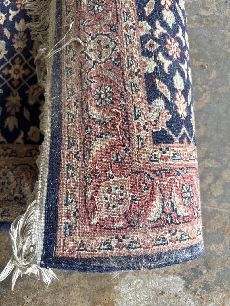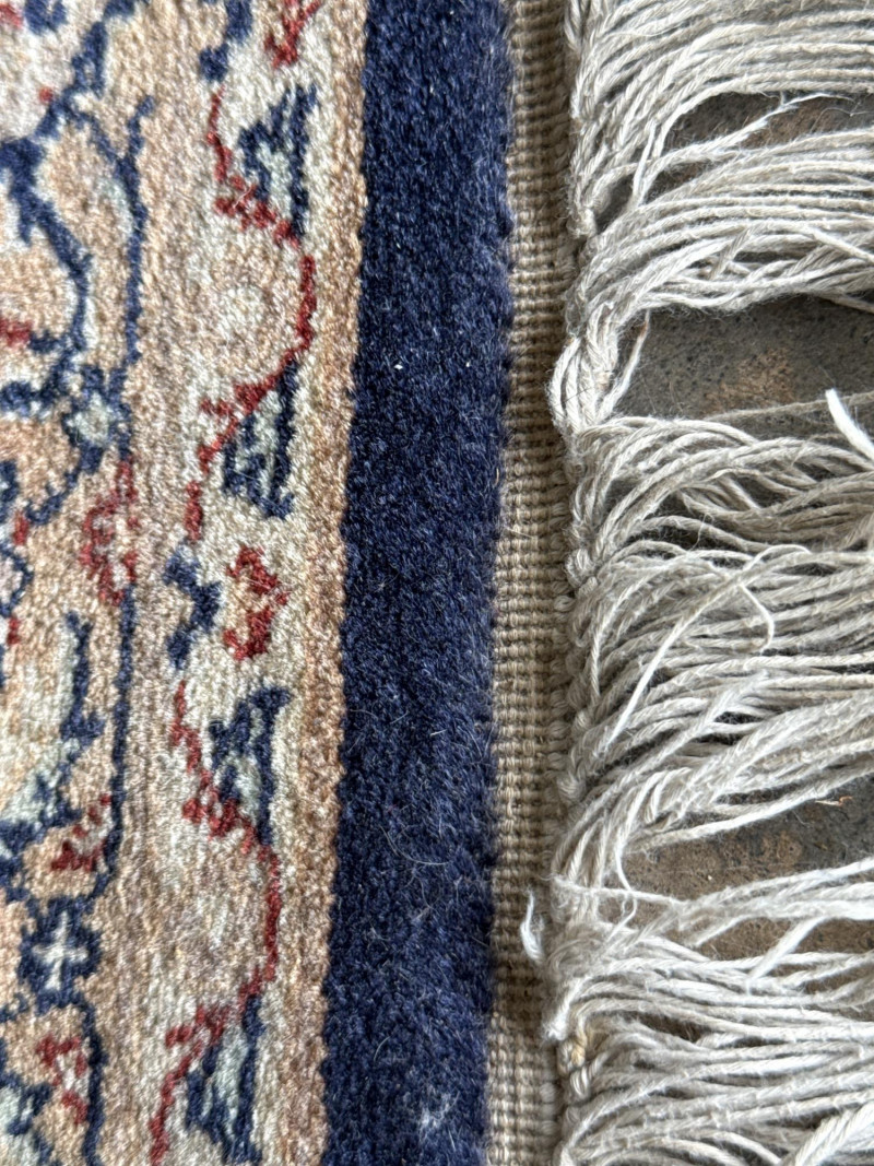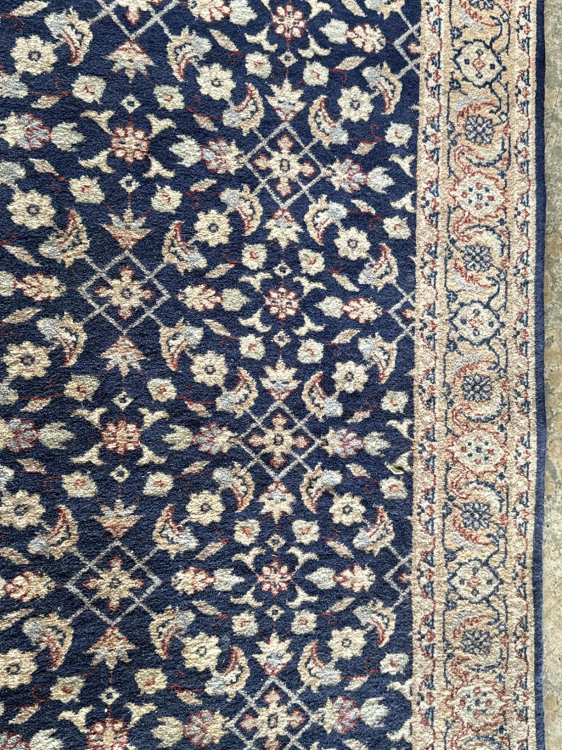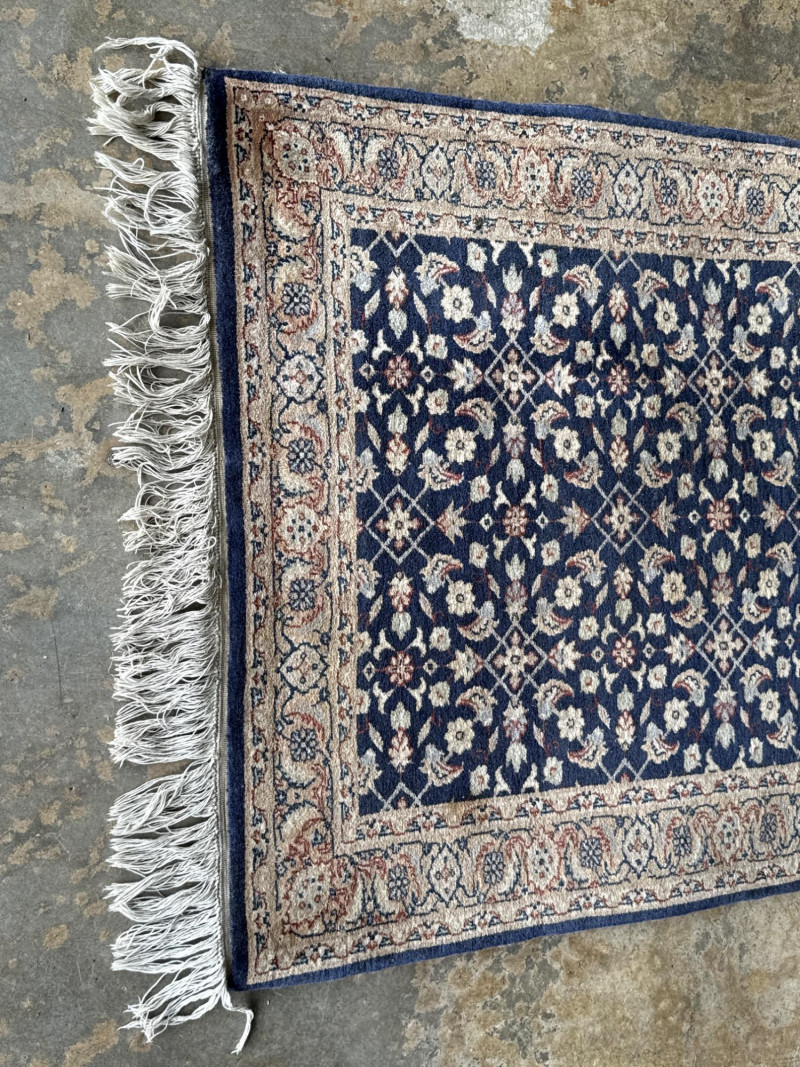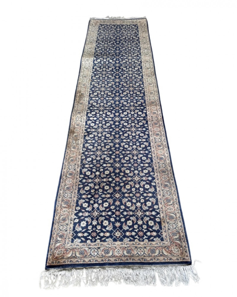 A hand-knotted wool runner rug, featuring a deep navy field with floral and vine motifs in cream and rose. The elongated format suits hallways or transitional spaces, while the medallion-style border adds timeless elegance. Dimensions: Approx. 128" L × 31.5" W Design: Central floral field with rose-accented medallion border Colorway: Navy, cream, muted rose, and pale blue Material: Wool (hand-knotted; fringe at one end confirms artisanal construction) Condition: Some subtle discoloration may be present, consistent with age and use. Pet hair and odor. No stains found. Recommend cleaning before use. Handling Note: Rug may require rolling or protective wrap for transport Provenance & Style Notes: