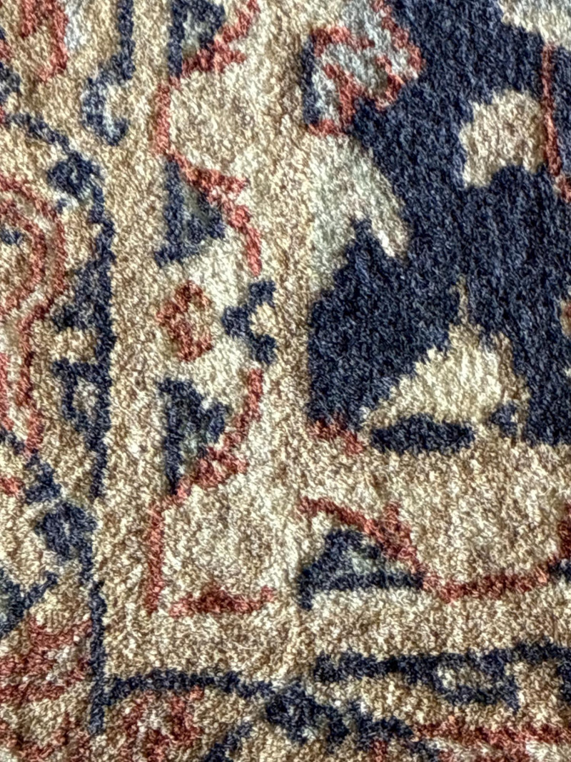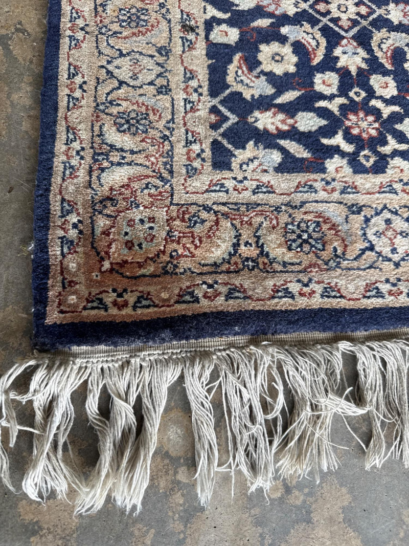 While the exact origin is unconfirmed, the rug bears strong resemblance to Kashan or Nain region Persian patterns, known for their floral medallion repeats and muted, classical color schemes. These styles traditionally feature high knot density and balanced curvilinear motifs, often woven in wool with cotton foundations Please Note: As with all pre-owned items, this rug may require cleaning prior to use. The specific environment from which it originated is unknown. By placing a bid, you acknowledge that you are purchasing a used item sold as-is, without guarantees or the option for refund.