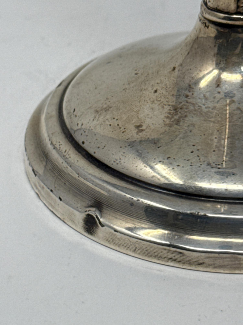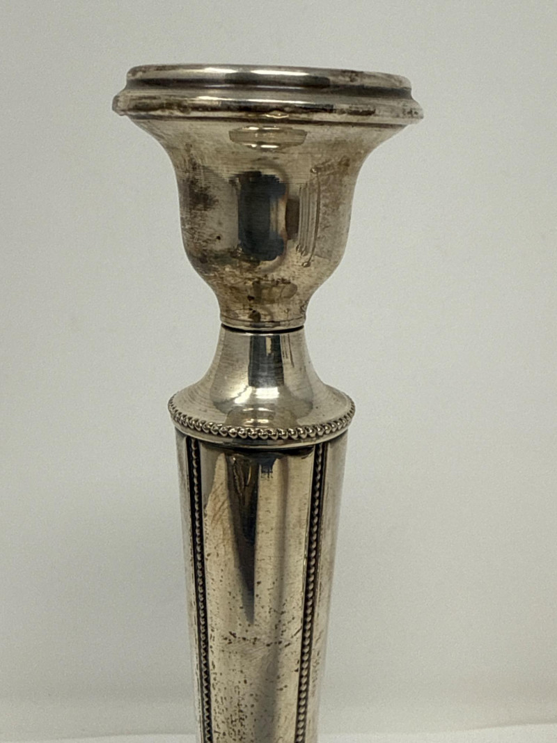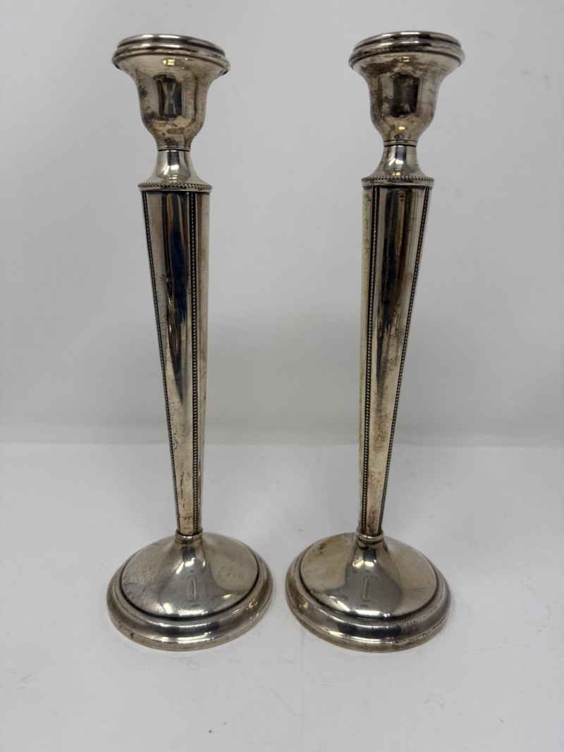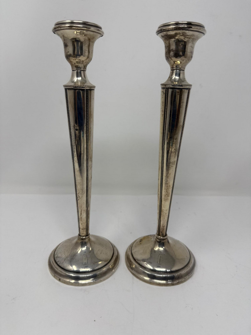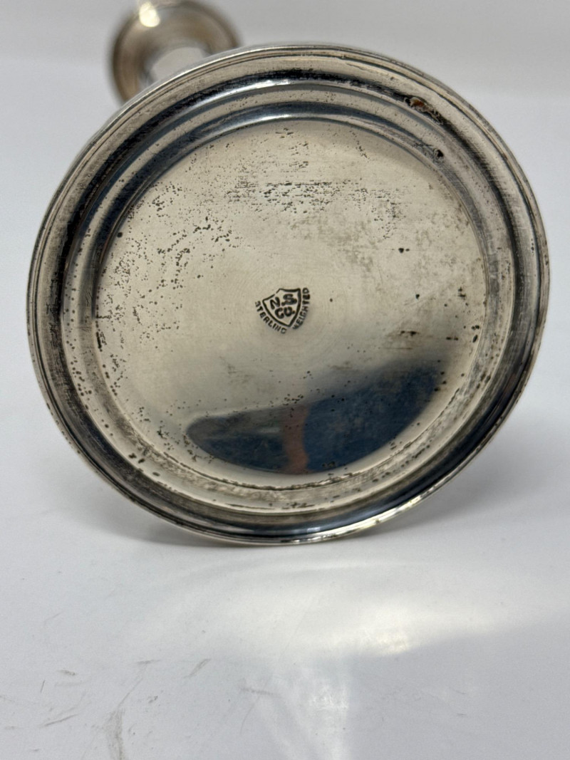A pair of elegant sterling silver candlesticks by N.S Co, each hallmarked and stamped Sterling with weighted bases for stability. The classic silhouette features a flared lip and smooth shaft, offering timeless style suitable for both display and functional use. Dimensions: Approx. 10 in (H) × 3 in (Base Diameter) Material: Solid sterling silver, weighted Marks: N.S Co maker’s mark; stamped Sterling Weight is 25.6 ounces