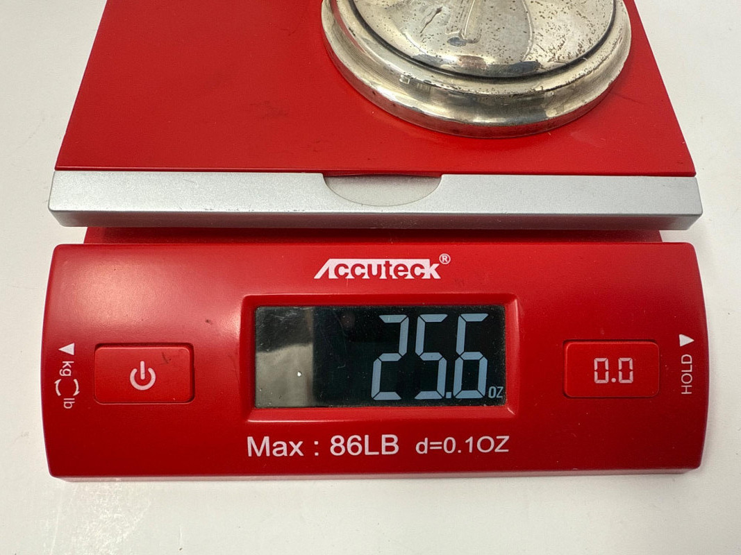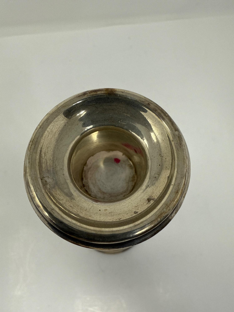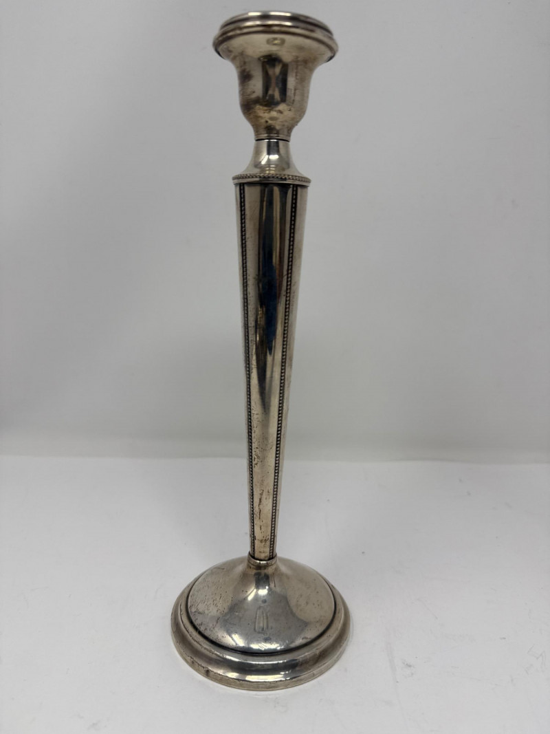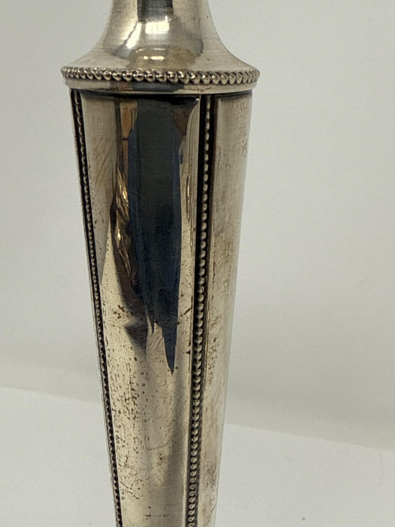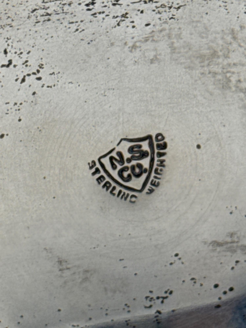 A pair of elegant sterling silver candlesticks by N.S Co, each hallmarked and stamped Sterling with weighted bases for stability. The classic silhouette features a flared lip and smooth shaft, offering timeless style suitable for both display and functional use. Dimensions: Approx. 10 in (H) × 3 in (Base Diameter) Material: Solid sterling silver, weighted Marks: N.S Co maker’s mark; stamped Sterling Weight is 25.6 ounces