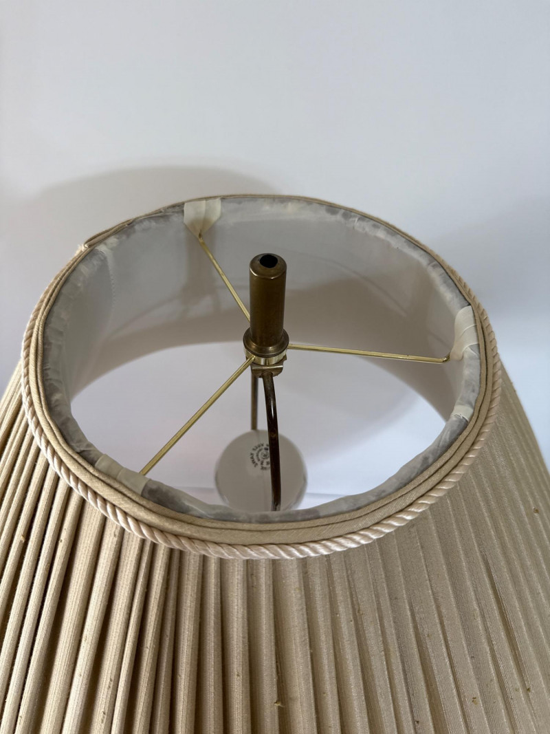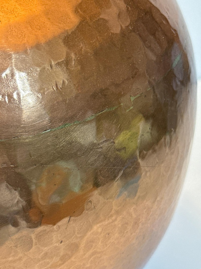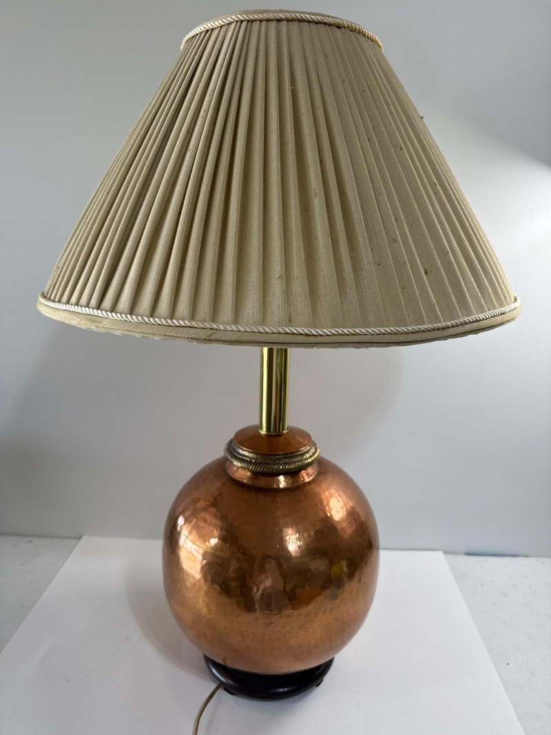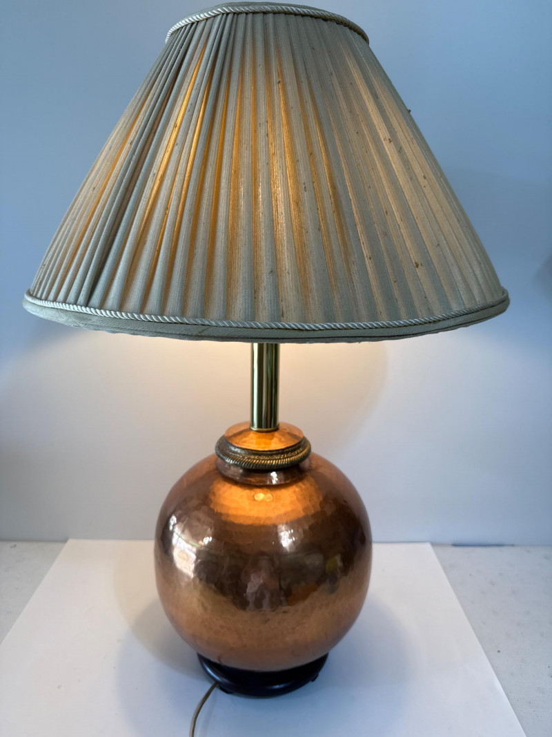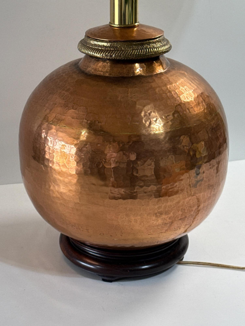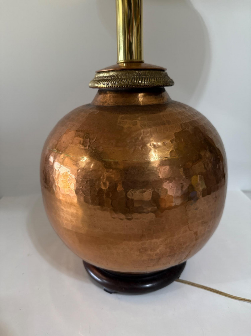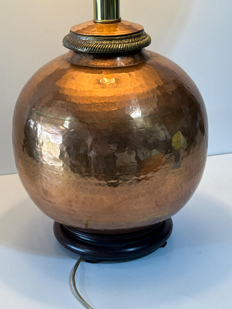 A fully functional vintage table lamp featuring a rounded, hand-hammered copper body with a rich, naturally aged patina. The surface showcases artisanal texture, complemented by a polished brass collar at the neck. The lamp is mounted on a circular wooden base with a dark stained finish, providing visual grounding and stability. Height: 32.2 inches Diameter (widest point): 20 inches Body: Hammered copper with natural oxidation Accent: Polished brass collar Base: Solid wood Lamp is in working condition; tested and operationalDimensions