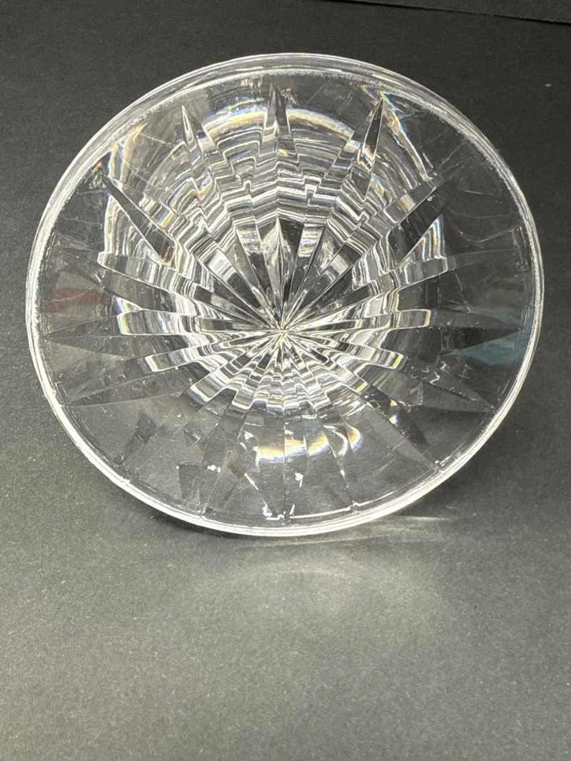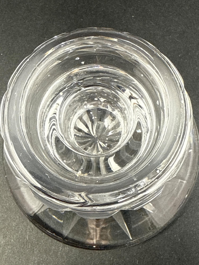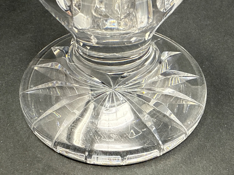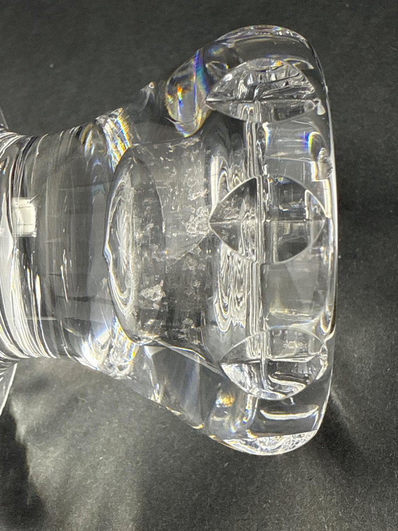 A vintage Waterford clear crystal candlestick holder, notable for its compact stature and substantial form. Crafted with thick, faceted crystal walls, this piece exemplifies Waterford’s renowned clarity and weight. The broad base ensures stability, while the short profile lends itself to layered table settings or intimate lighting arrangements. Material: Lead crystal Design: Classic cut pattern with a wide, grounded base Condition: No cracks or chips Era: Likely 1980s production Use: Ideal for taper candles; suitable for formal or vintage-inspired décor This candlestick holder offers timeless elegance and collectible appeal, perfect for connoisseurs of fine crystal or those curating refined home accents.
