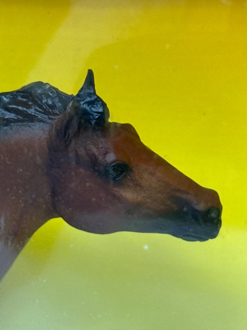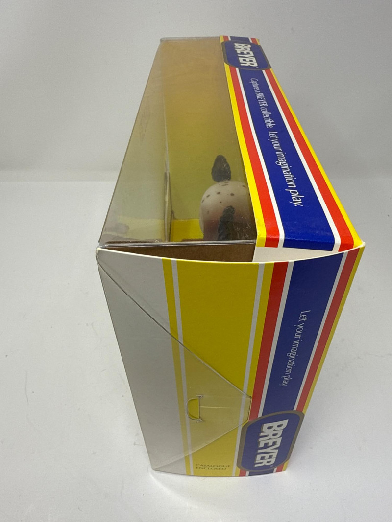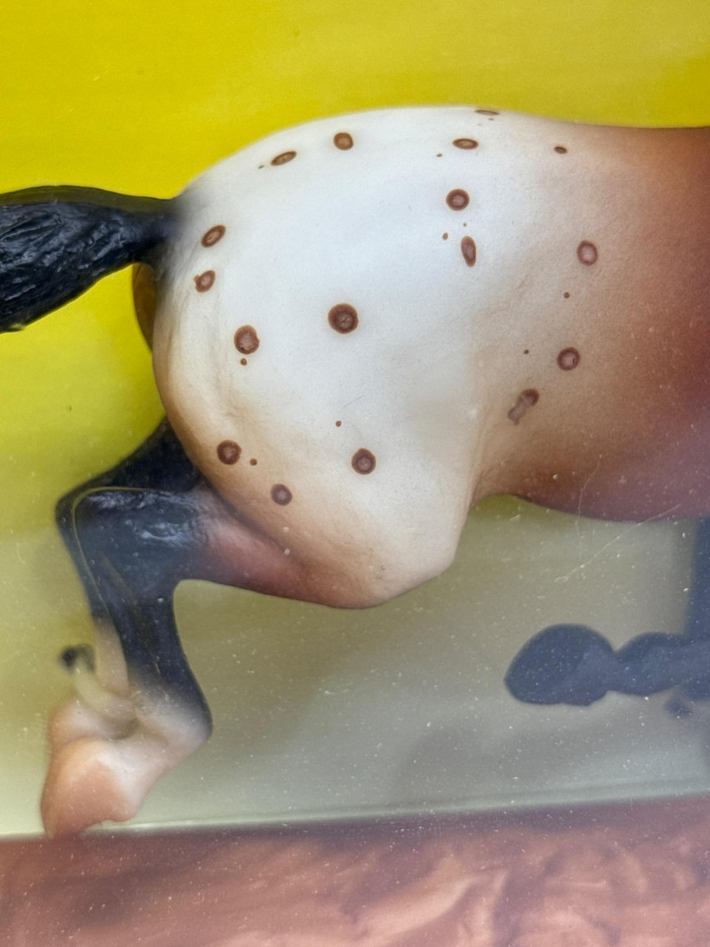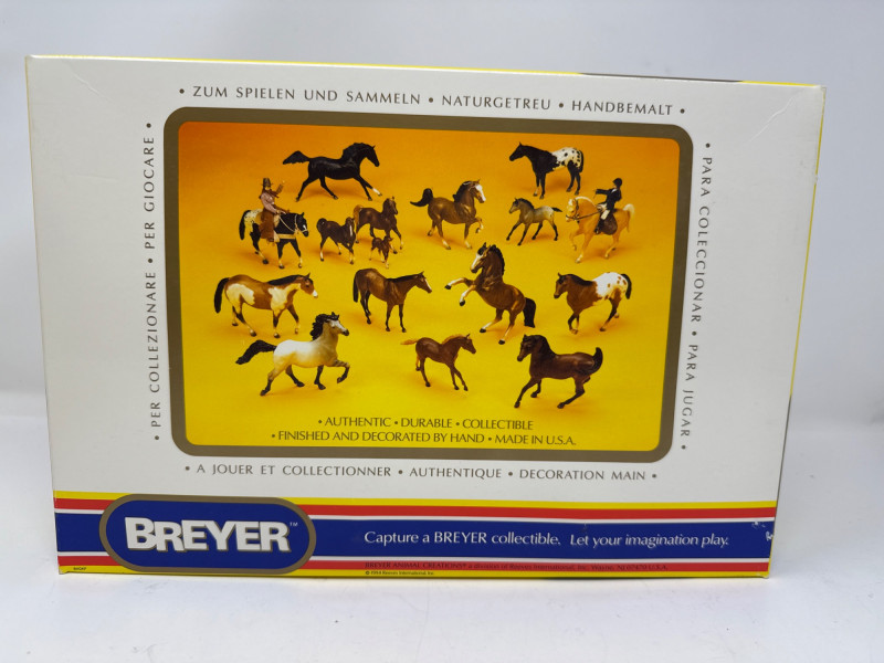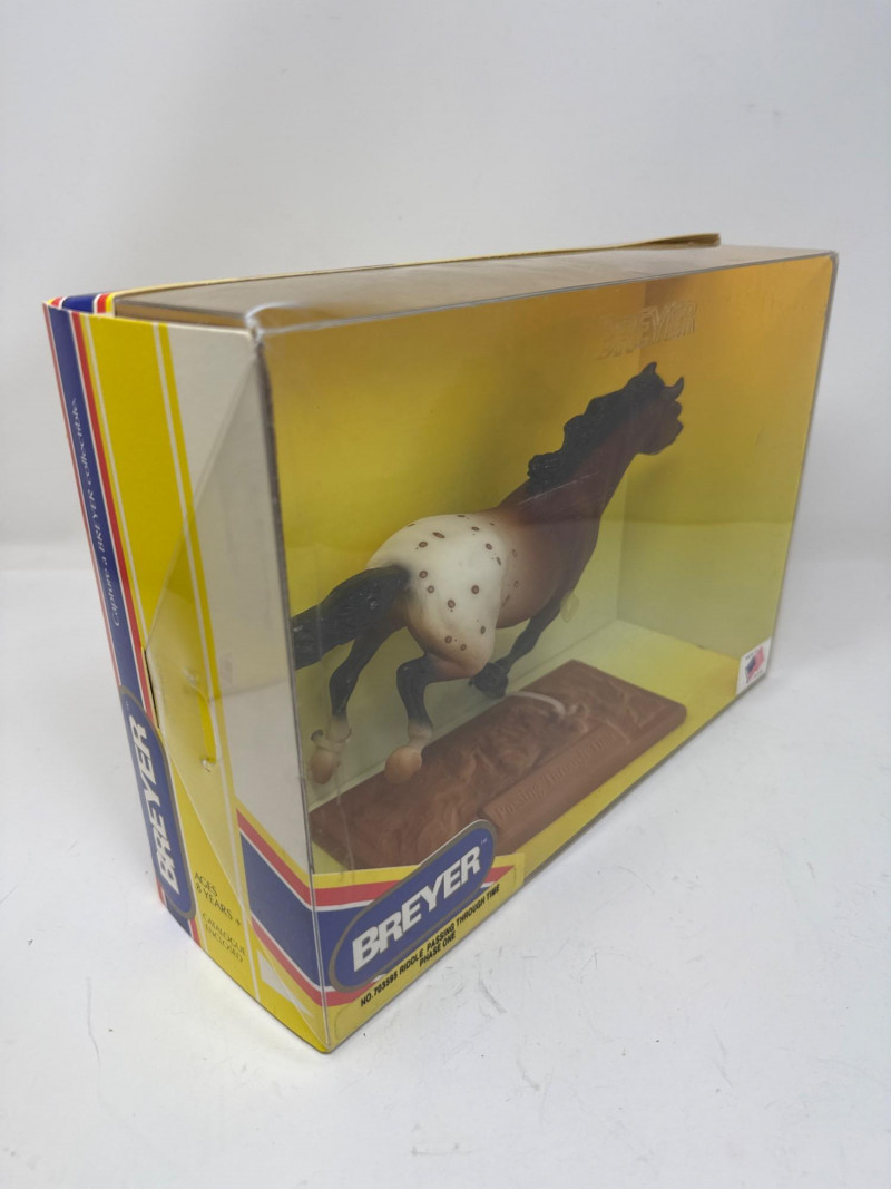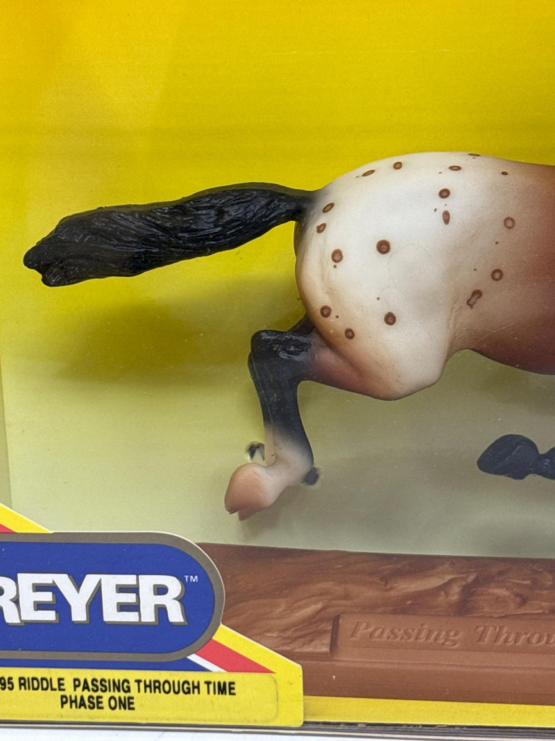 A figure from Breyer’s “Passing Through Time” series, Riddle Phase I captures the essence of transformation in motion. Sculpted by Chris Hess, this Classic-sized model features a striking Appaloosa pattern in bay/brown tones with a matte finish, evoking the timeless energy of a horse galloping through eras. Model Number: 703595 Color: Appaloosa – Bay/Brown, Misc Finish: Matte Year of Release: 1995 Edition Size: 3,800 produced Series: Limited Edition Material: Cellulose Acetate Plastic Maker’s Mark: Round Breyer Molding Co stamp Accessories: Includes original stand/base Condition: Excellent; no visible flaws, retains original paint and form Provenance: From a curated single-owner collection of vintage Breyer models This piece is ideal for collectors of Breyer horses, equine sculpture, or Americana. With its limited production run and sculptural finesse, Riddle stands as a testament to Breyer’s legacy of craftsmanship and storytelling.