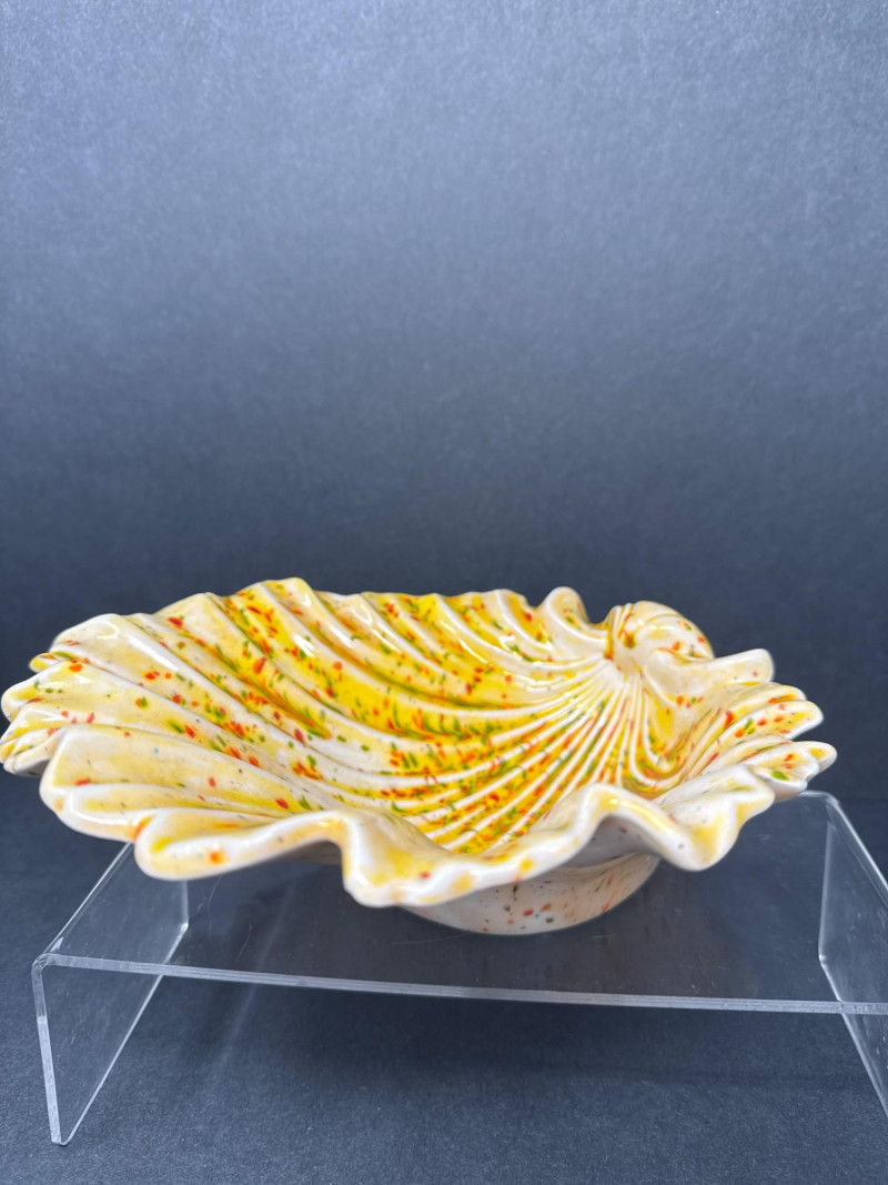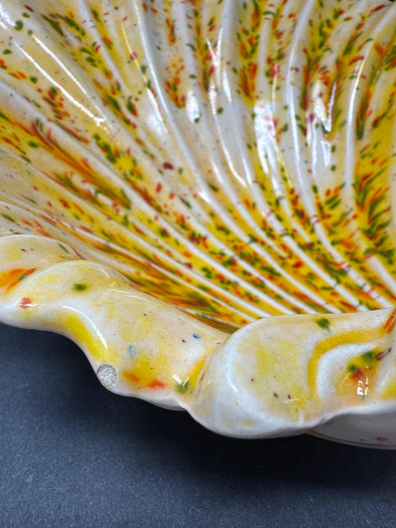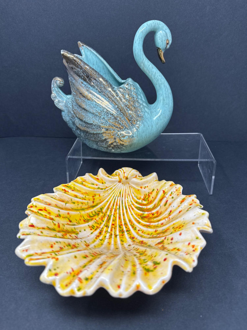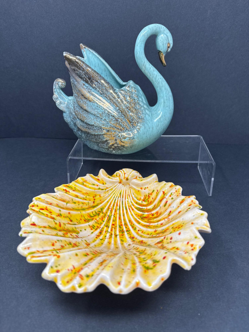 A vibrant mid-century ceramic duo featuring: Swan Planter: Approx. 9" L x 6" H. Stylized swan form with a speckled splatter glaze in soft white and green tones. Designed as a planter or centerpiece. No visible cracks or repairs. Shell Dish: Approx. 8½" x 8" x 2½" H. Ribbed ceramic dish with scalloped edges and a bold orange/green/white speckled glaze. One small chip noted on rim (see photos). Both pieces reflect 1960s studio pottery aesthetics, with playful forms and textured finishes typical of the atomic-era decorative arts. Ideal for collectors or retro-inspired interiors. Condition: Minor chip on shell dish.
