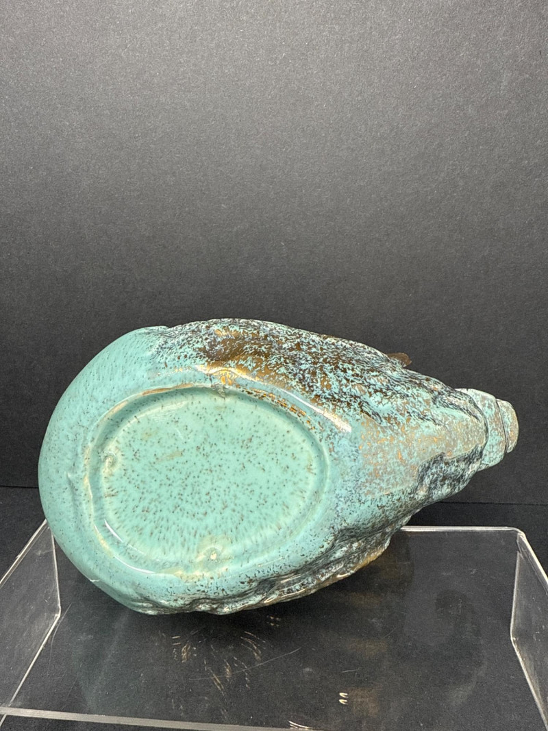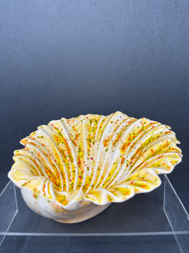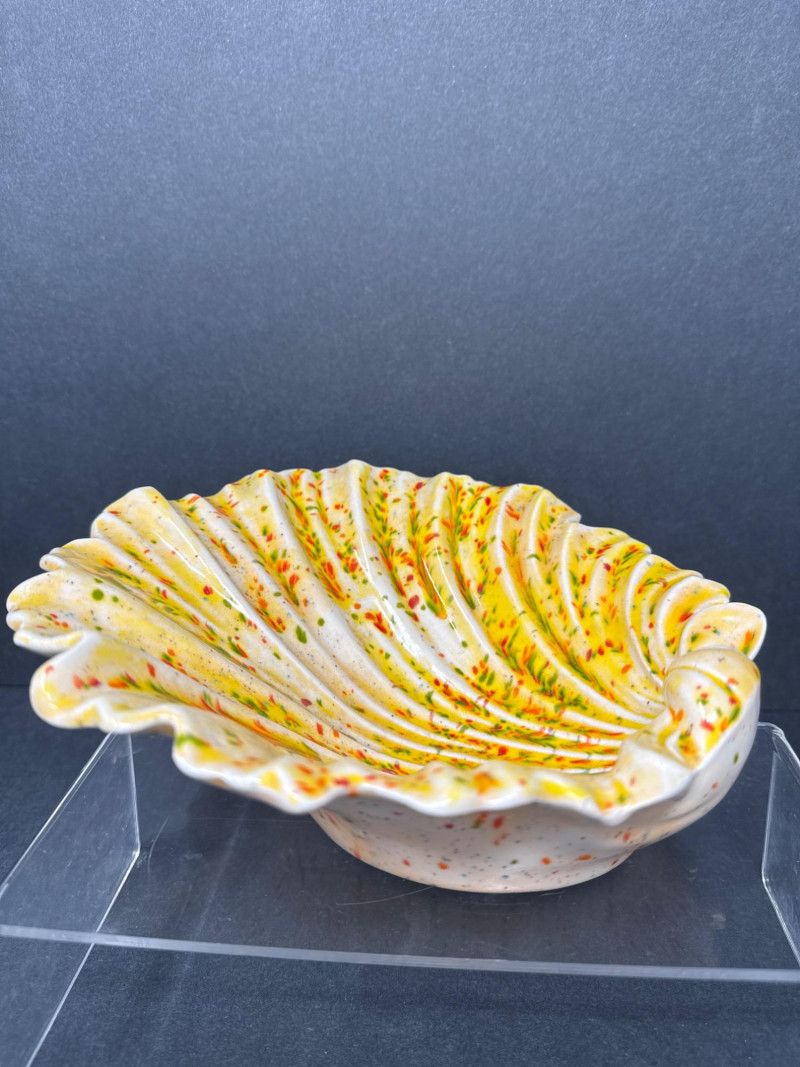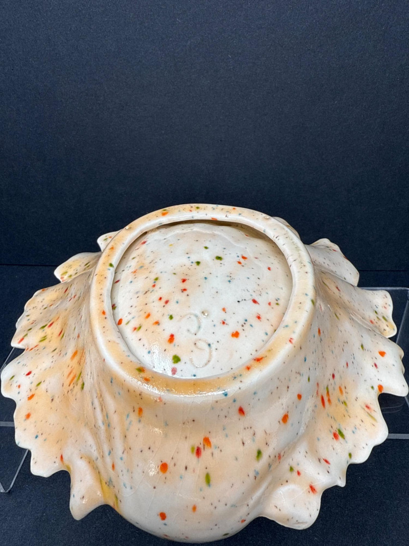 A vibrant mid-century ceramic duo featuring: Swan Planter: Approx. 9" L x 6" H. Stylized swan form with a speckled splatter glaze in soft white and green tones. Designed as a planter or centerpiece. No visible cracks or repairs. Shell Dish: Approx. 8½" x 8" x 2½" H. Ribbed ceramic dish with scalloped edges and a bold orange/green/white speckled glaze. One small chip noted on rim (see photos). Both pieces reflect 1960s studio pottery aesthetics, with playful forms and textured finishes typical of the atomic-era decorative arts. Ideal for collectors or retro-inspired interiors. Condition: Minor chip on shell dish.