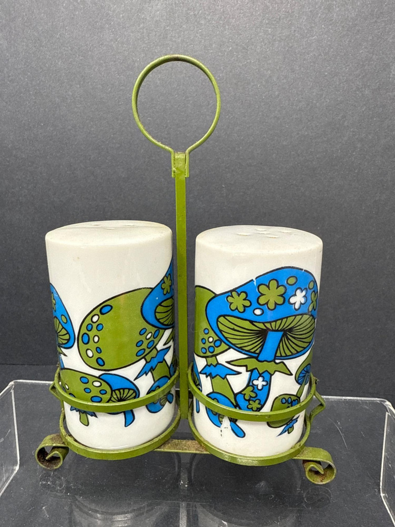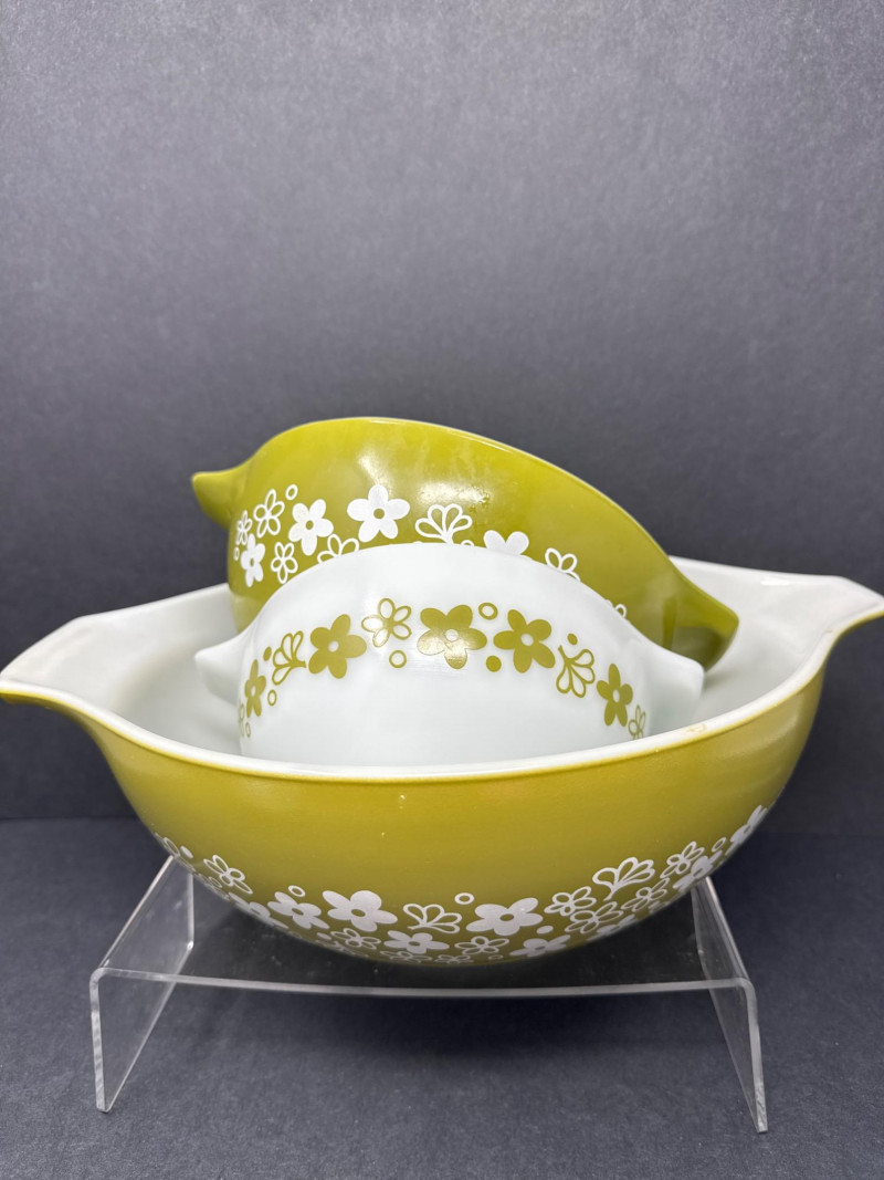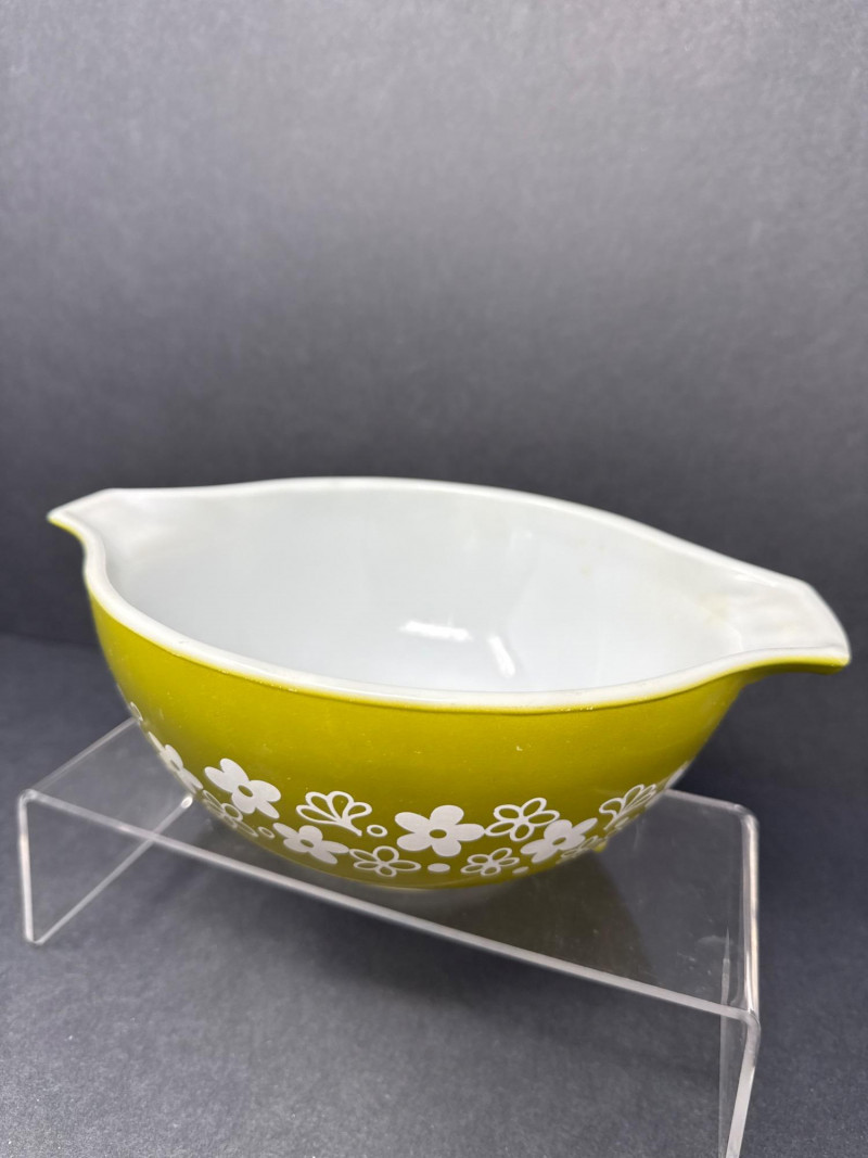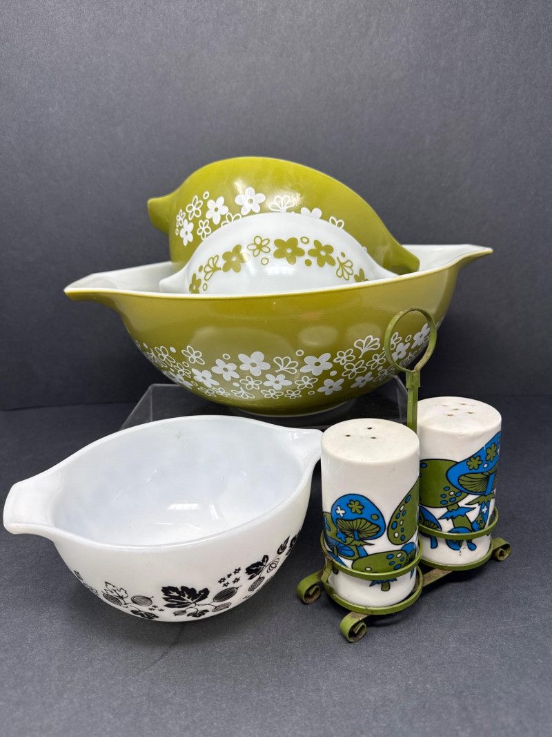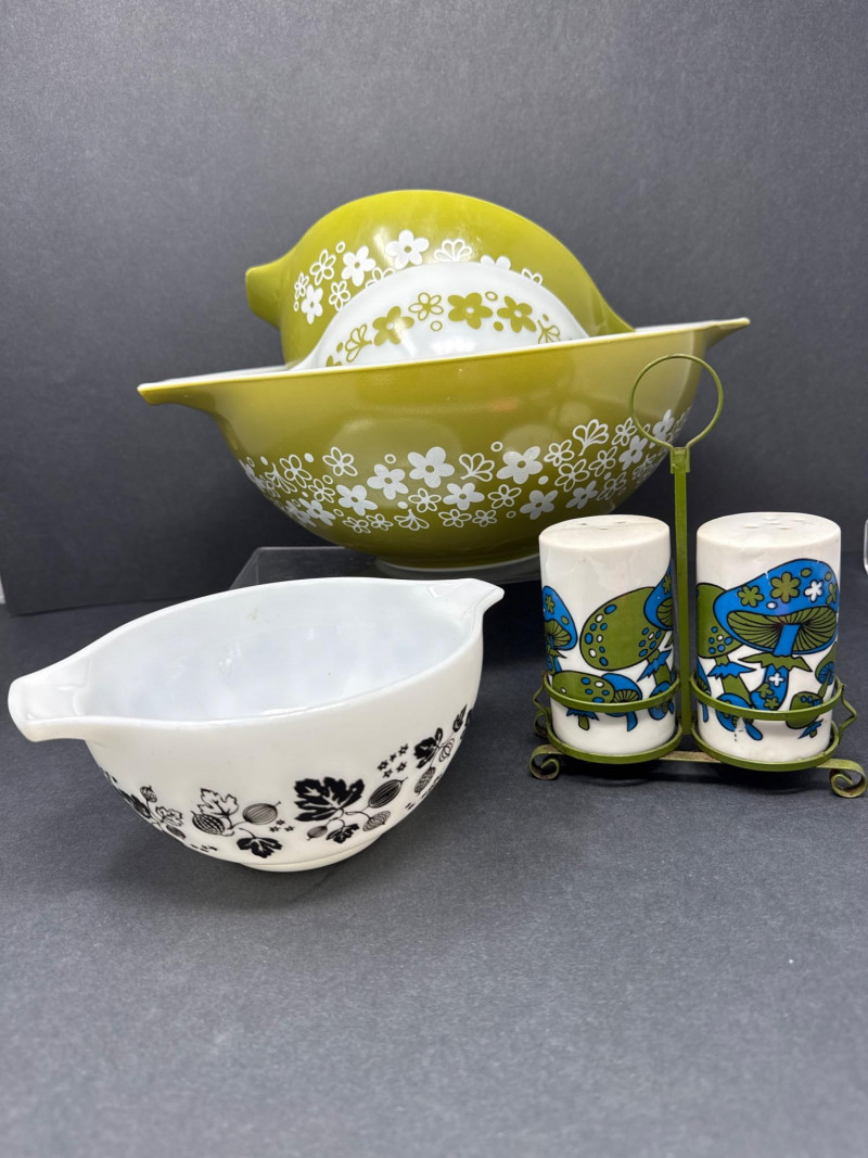 A vibrant collection of vintage kitchenware featuring iconic Pyrex patterns and oversized salt & pepper shake Pyrex Spring Blossom Green (Crazy Daisy) Sizes: 4 Qt, 1.5 Qt, and 1.5 Pt Era: 1970s Features: Classic green floral motif on opal glass; part of the 400 Series Pyrex Gooseberry (Black on White) Size: 1.5 Pt Era: Late 1950s Features: Rare black-on-white variant from the Cinderella Bowl series Collectability: Highly sought after for its early printed pattern and bold contrast Vintage Salt & Pepper Shakers Dimensions: Approx. 7" tall x 4.5" wide Style: Oversized mid-century form with whimsical charm Material: Ceramic