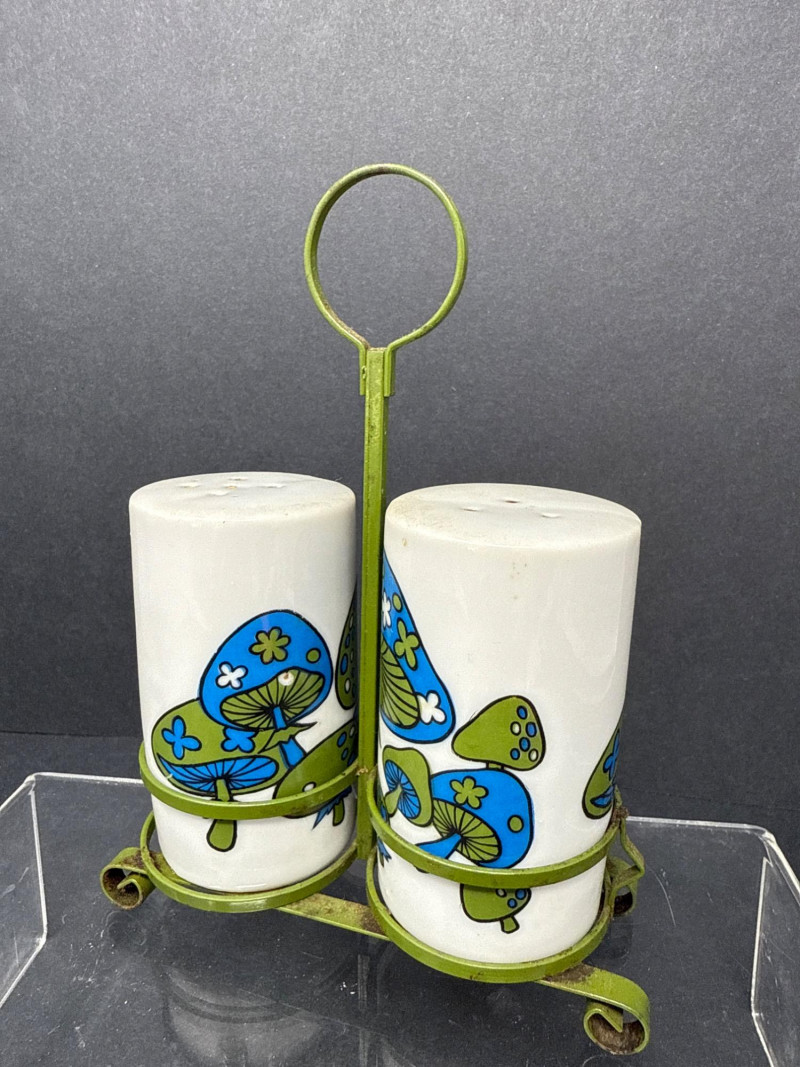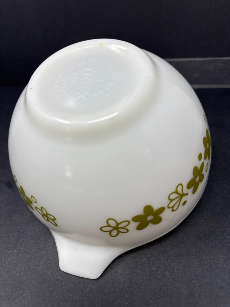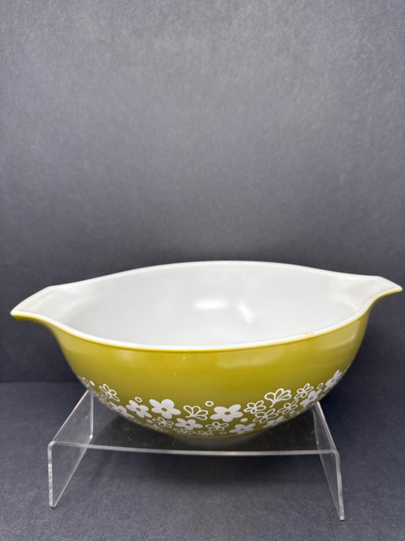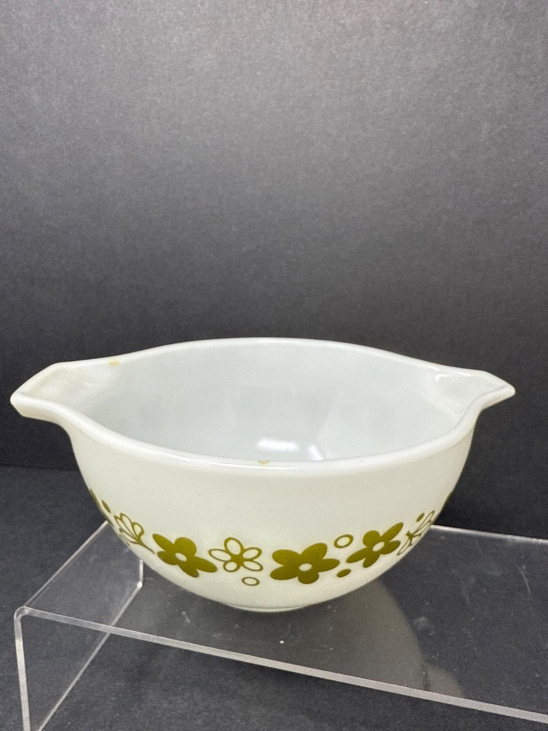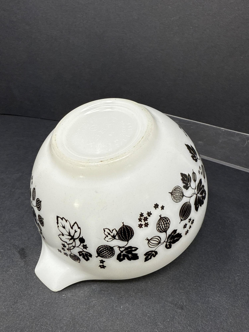 A vibrant collection of vintage kitchenware featuring iconic Pyrex patterns and oversized salt & pepper shake Pyrex Spring Blossom Green (Crazy Daisy) Sizes: 4 Qt, 1.5 Qt, and 1.5 Pt Era: 1970s Features: Classic green floral motif on opal glass; part of the 400 Series Pyrex Gooseberry (Black on White) Size: 1.5 Pt Era: Late 1950s Features: Rare black-on-white variant from the Cinderella Bowl series Collectability: Highly sought after for its early printed pattern and bold contrast Vintage Salt & Pepper Shakers Dimensions: Approx. 7" tall x 4.5" wide Style: Oversized mid-century form with whimsical charm Material: Ceramic