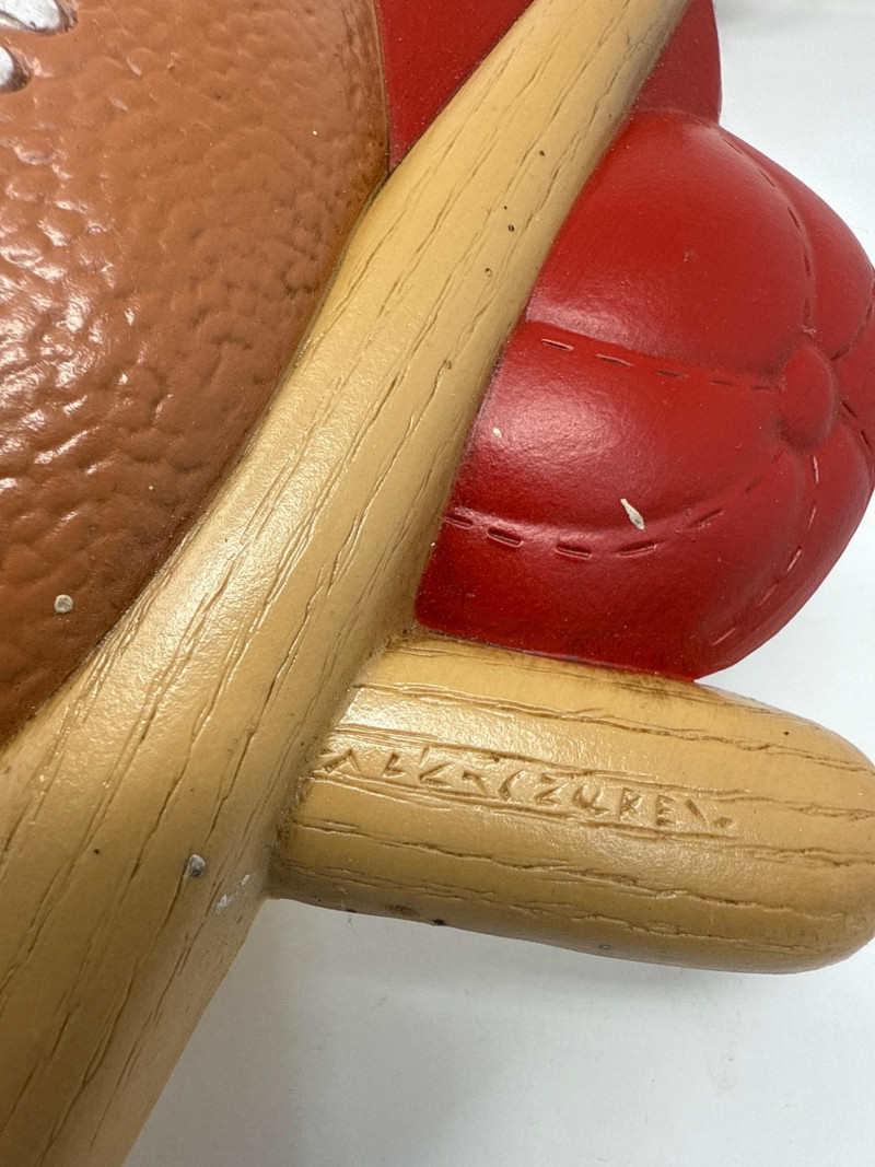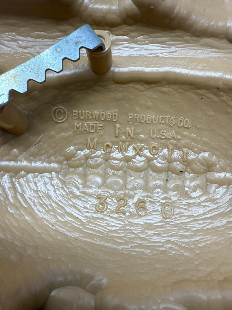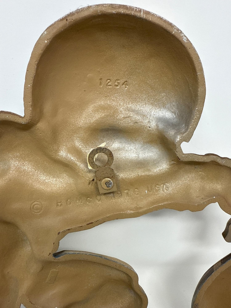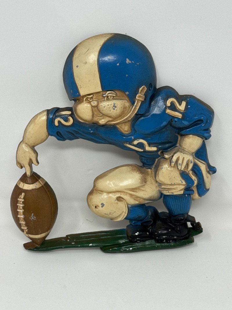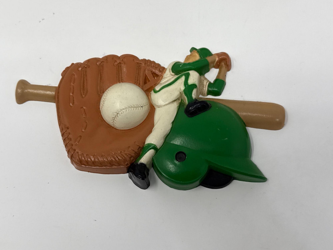 A cohesive five-piece set of vintage wall plaques celebrating classic youth sports. Four are molded plastic by Burwood Products Co., dated between 1990–1992. The football player is cast metal by Homco, dated 1976. Together, they offer nostalgic charm and cross-sport appeal. Includes: Football Player – Cast metal figure by Homco, stamped “1254” and “© Hong Kong, USA.” Dated 1976. Depicts a blue-uniformed player in motion. Basketball Slam Dunk – Molded plastic plaque by Burwood, marked “© BURWOOD PROD. CO., MADE IN U.S.A., MCMXCII, 3213 12.” Features a stylized player dunking into an oversized basketball hoop. Baseball Scene – Molded plastic plaque by Burwood, marked “© BURWOOD PROD. CO., MADE IN U.S.A., MCMXCI, 3213/2.” Includes a glove, bat, cleat, and ball in a dynamic arrangement. High-Top Sneaker – Molded plastic plaque by Burwood, marked “© BURWOOD 1991.” Depicts a black-and-white high-top athletic shoe with sporty flair. Baseball Player with Gear – Molded plastic plaque by Burwood, marked “© BURWOOD PROD. CO., MADE IN U.S.A., MCMXCI.” Features a green-helmeted baseball player in mid-swing, surrounded by a glove, bat, and ball. Ideal For: Kids’ room décor, sports-themed interiors, or collectors of nostalgic wall art. The full five-piece set offers cohesive display value and cross-sport appeal.