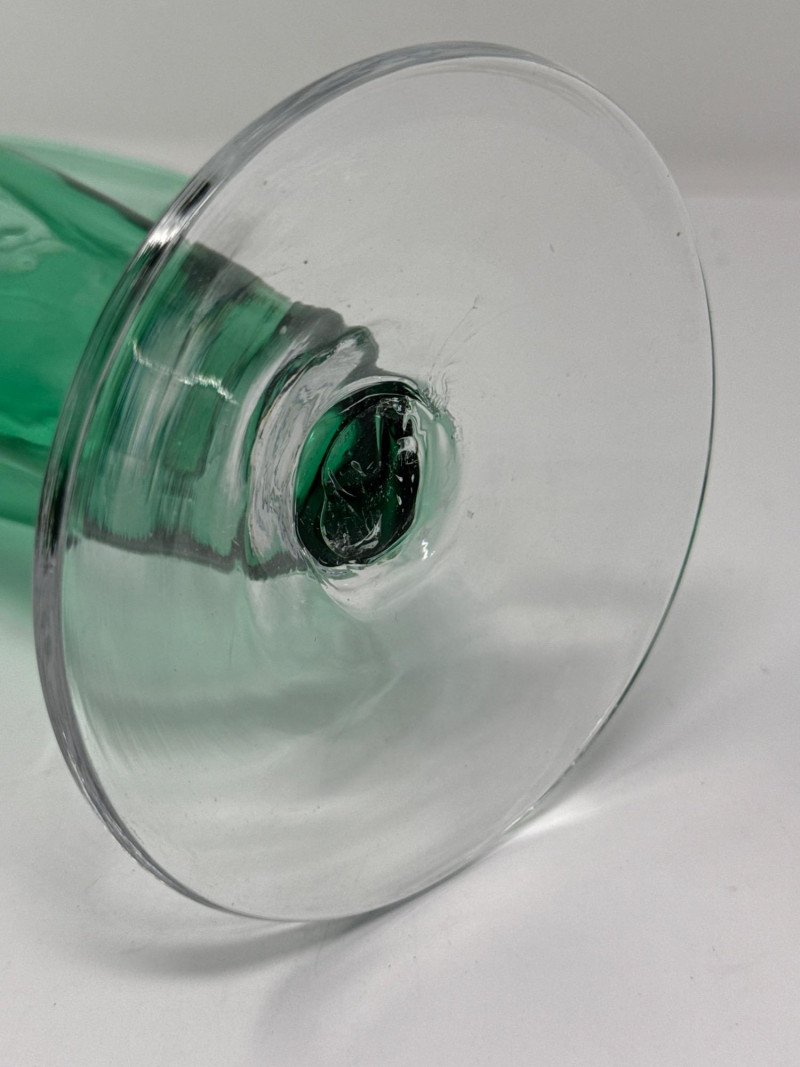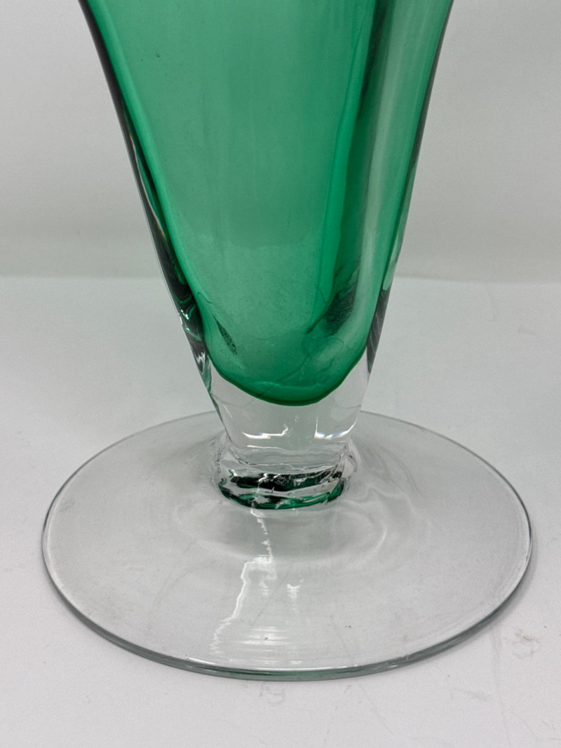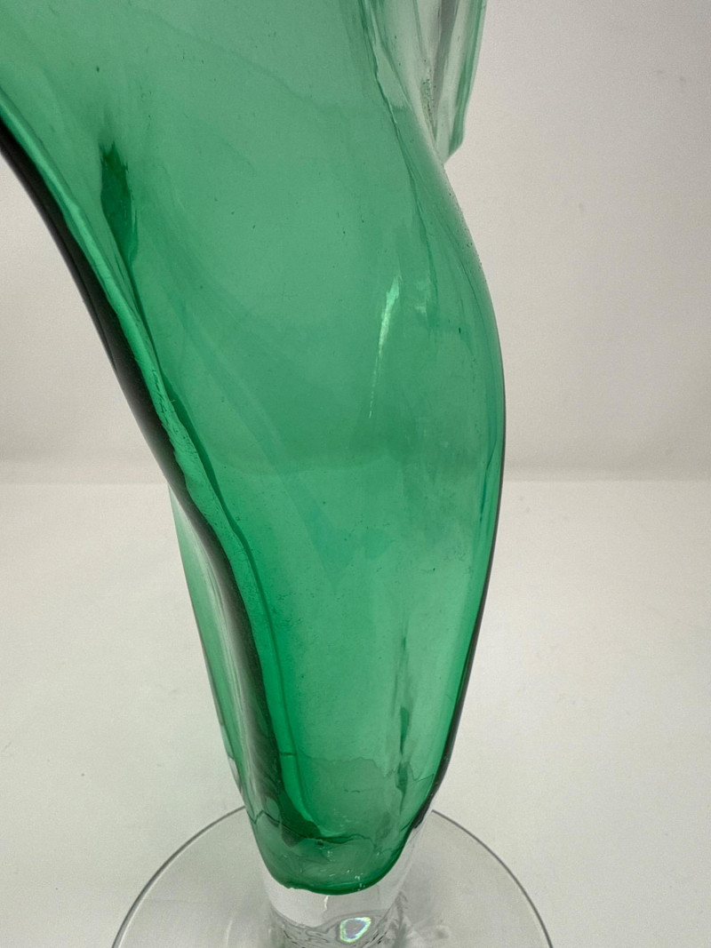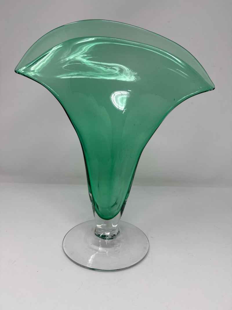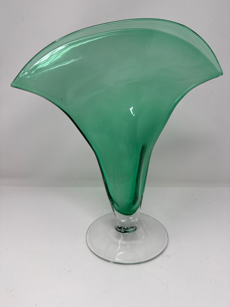 A visually compelling duo of vintage glassware, this lot includes: Blenko Mint Fan Vase – Sculptural and vibrant, this hand-blown fan-form vase in translucent mint green is attributed to Blenko Glass. Measures 11.5" H × 10" L × 5" W. Features fluid contours and a polished pontil base, characteristic of Blenko’s mid-century production. noted. Enesco Swirl Vase – A molded glass vase with dynamic swirl patterning in clear and frosted finishes. Stands 8.2" tall with a 2.5" base diameter. Retains original Enesco label; likely 1980s production. Excellent clarity and form.