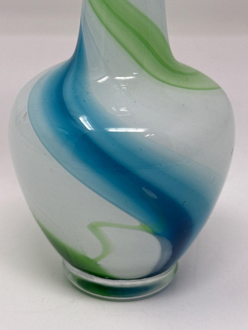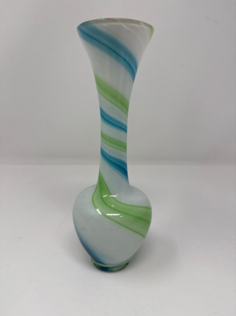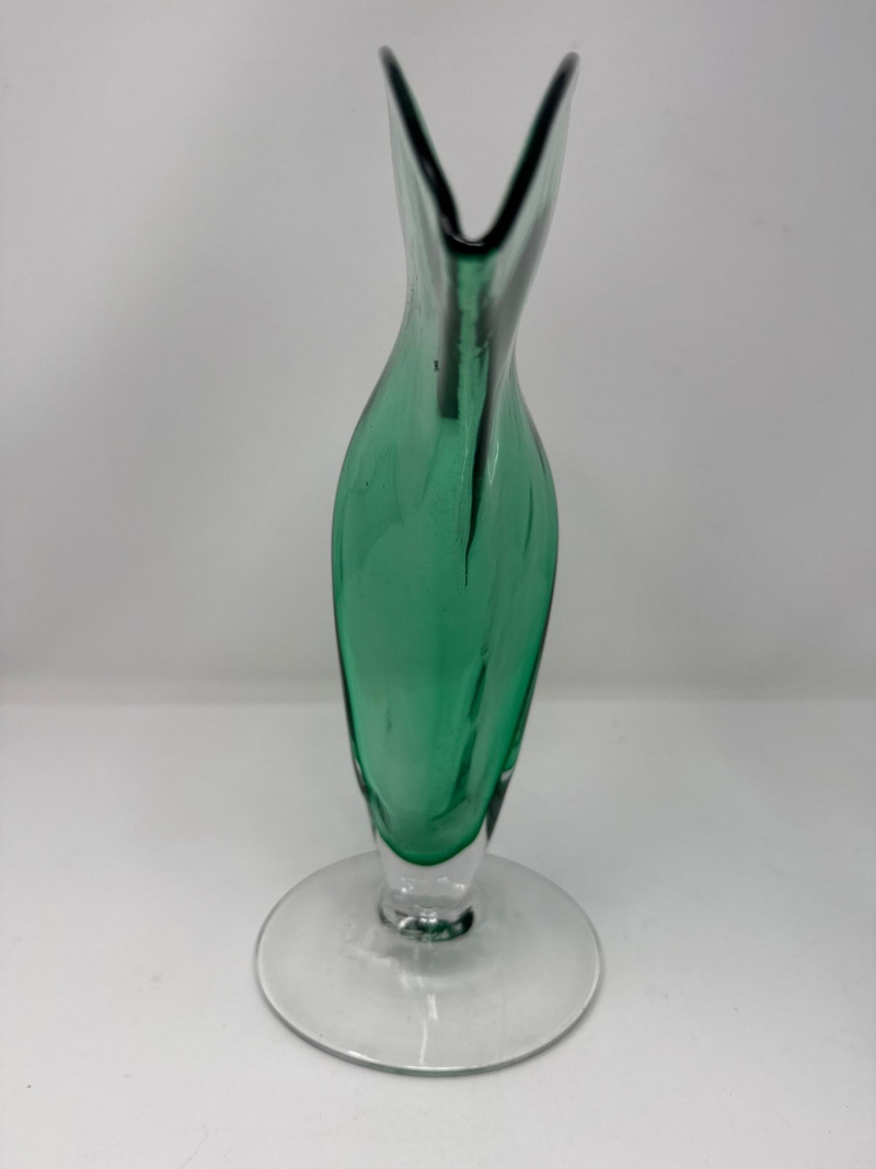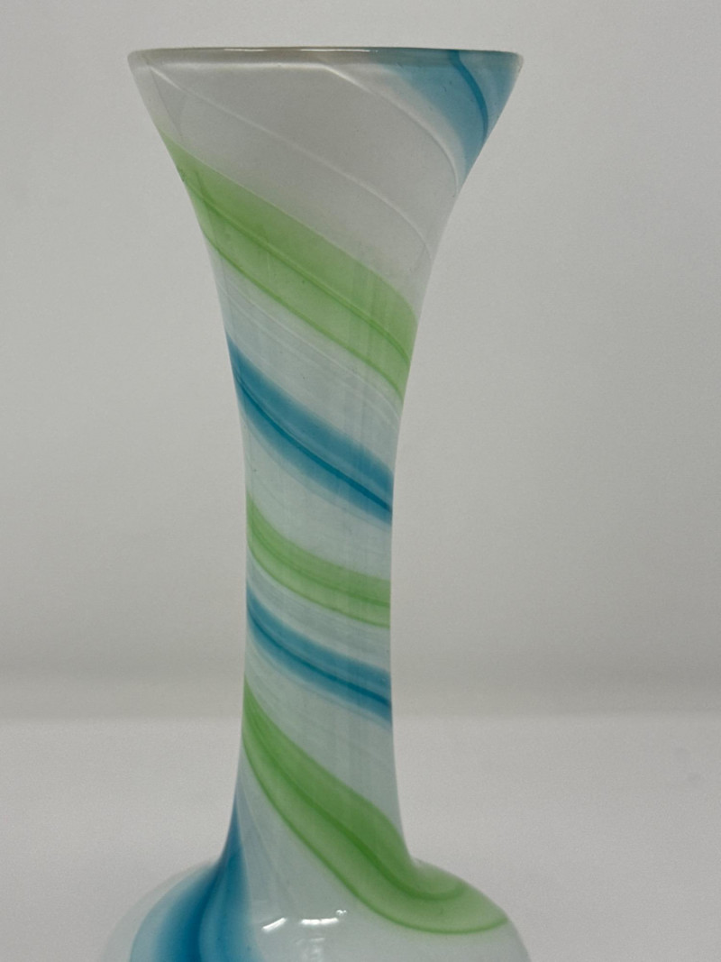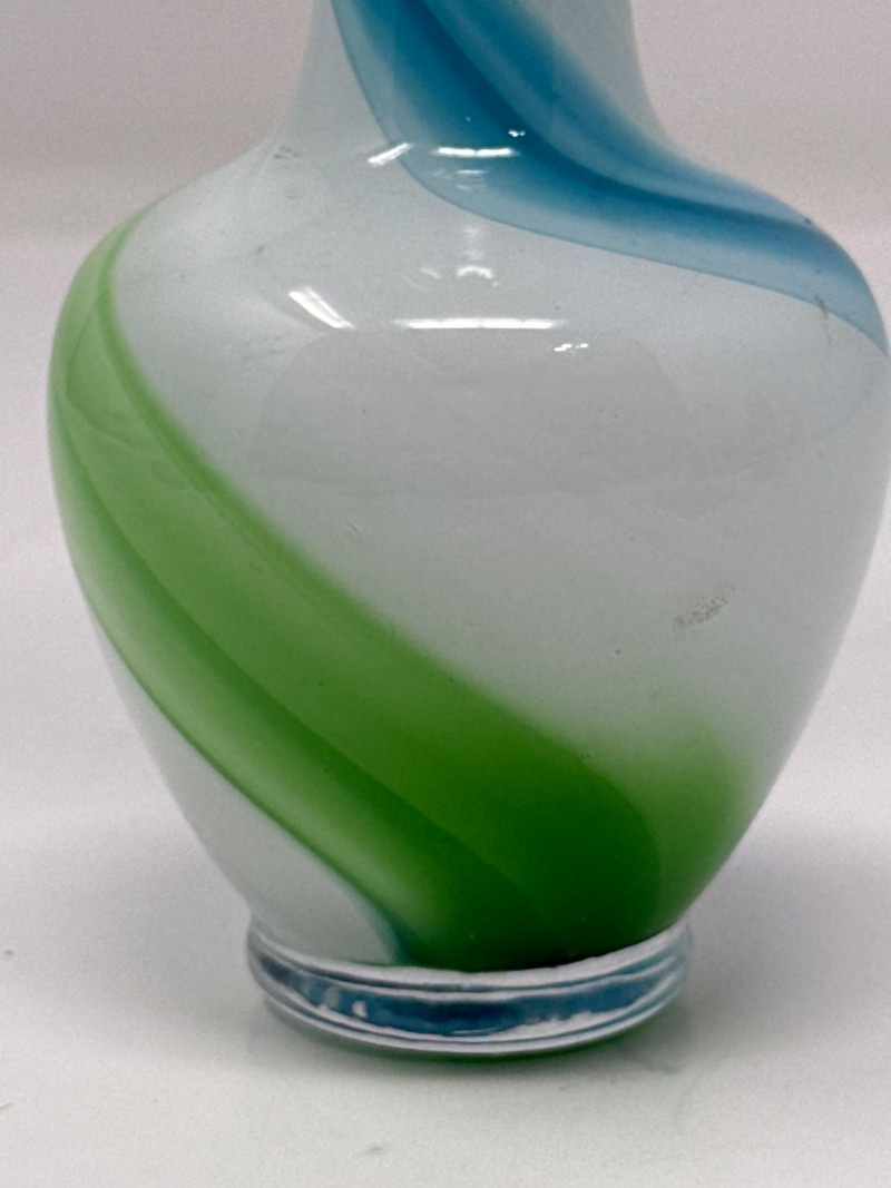 A visually compelling duo of vintage glassware, this lot includes: Blenko Mint Fan Vase – Sculptural and vibrant, this hand-blown fan-form vase in translucent mint green is attributed to Blenko Glass. Measures 11.5" H × 10" L × 5" W. Features fluid contours and a polished pontil base, characteristic of Blenko’s mid-century production. noted. Enesco Swirl Vase – A molded glass vase with dynamic swirl patterning in clear and frosted finishes. Stands 8.2" tall with a 2.5" base diameter. Retains original Enesco label; likely 1980s production. Excellent clarity and form.