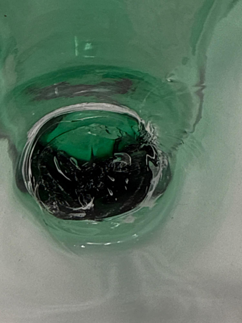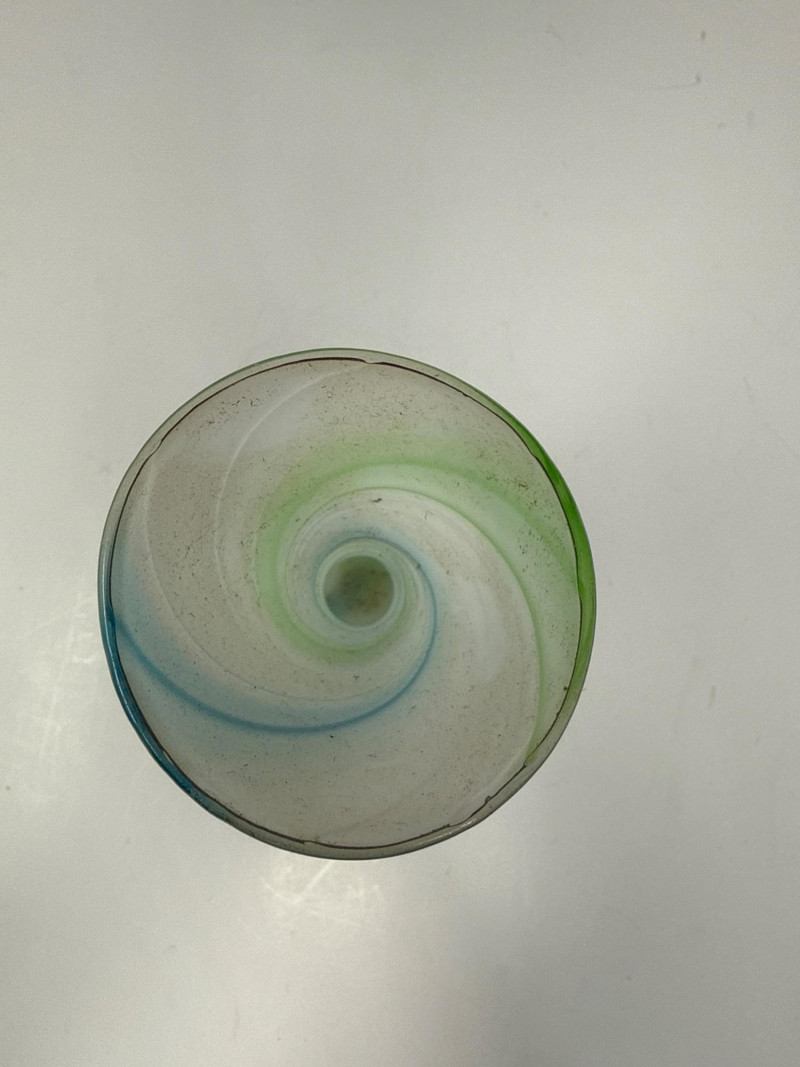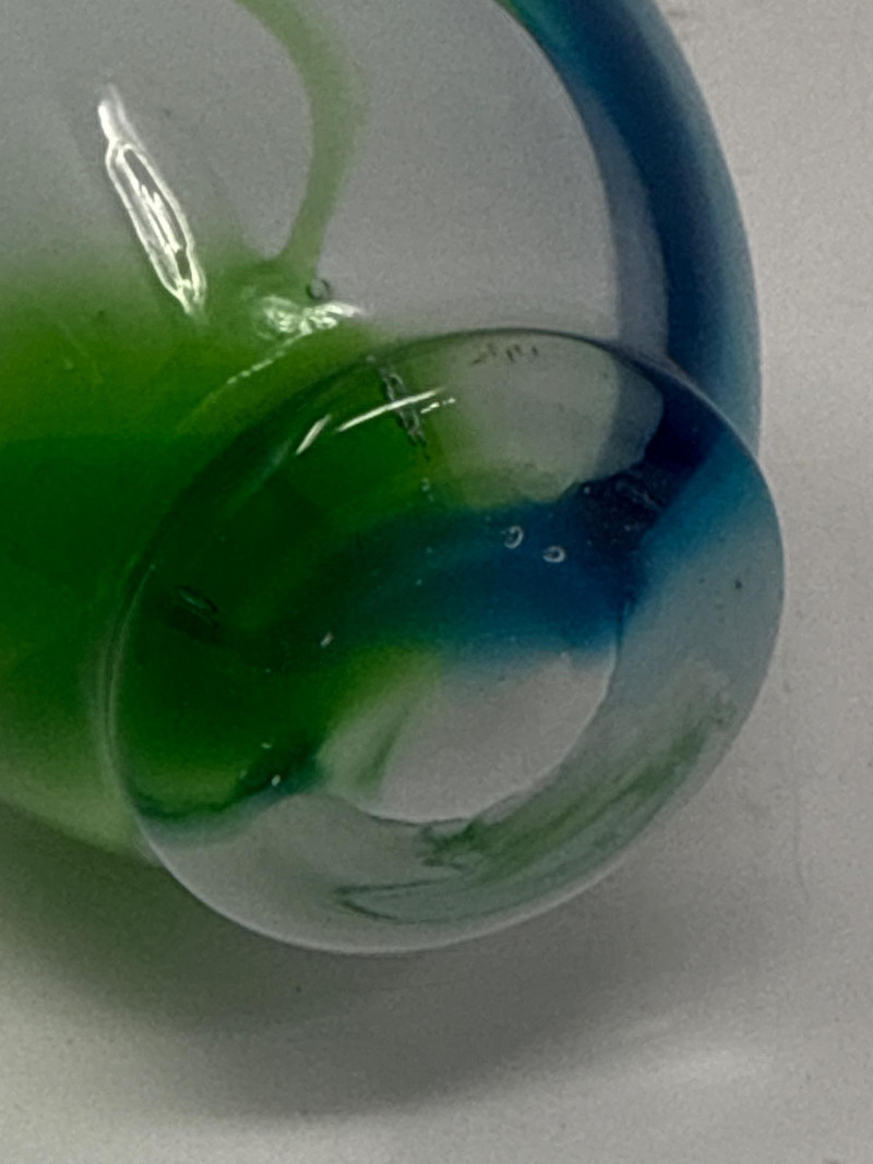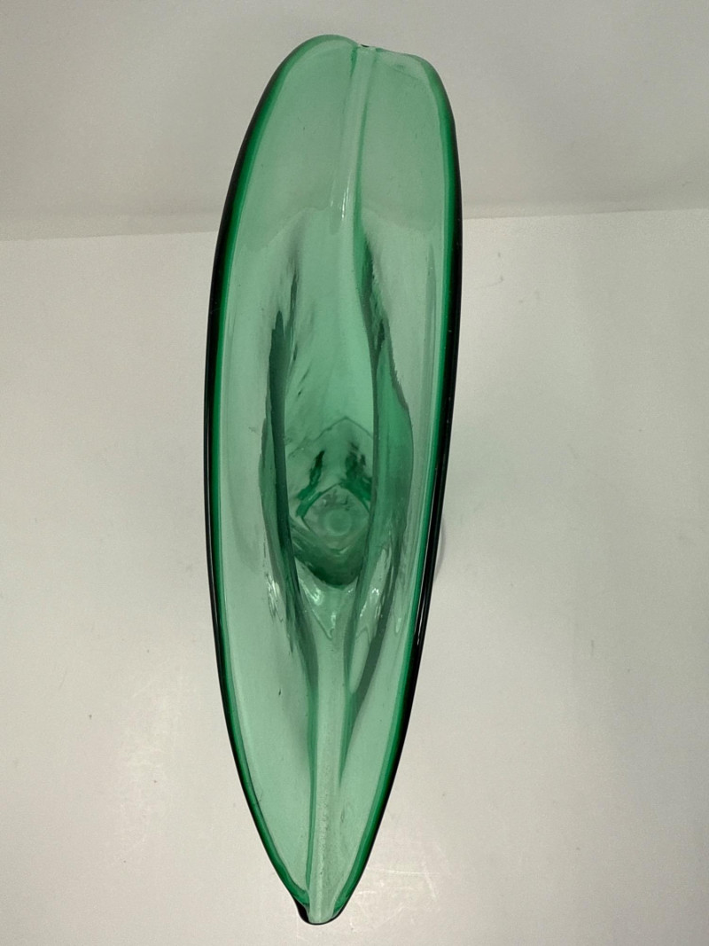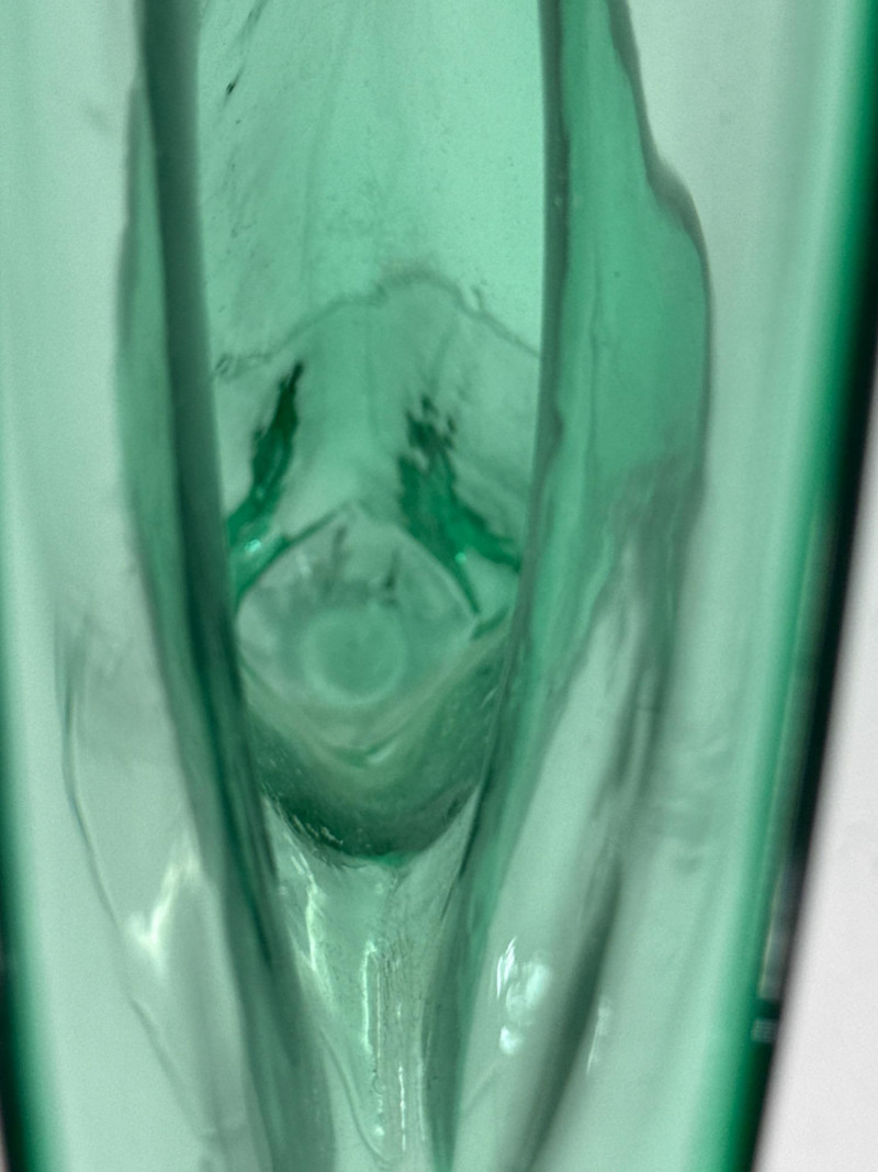 A visually compelling duo of vintage glassware, this lot includes: Blenko Mint Fan Vase – Sculptural and vibrant, this hand-blown fan-form vase in translucent mint green is attributed to Blenko Glass. Measures 11.5" H × 10" L × 5" W. Features fluid contours and a polished pontil base, characteristic of Blenko’s mid-century production. noted. Enesco Swirl Vase – A molded glass vase with dynamic swirl patterning in clear and frosted finishes. Stands 8.2" tall with a 2.5" base diameter. Retains original Enesco label; likely 1980s production. Excellent clarity and form.