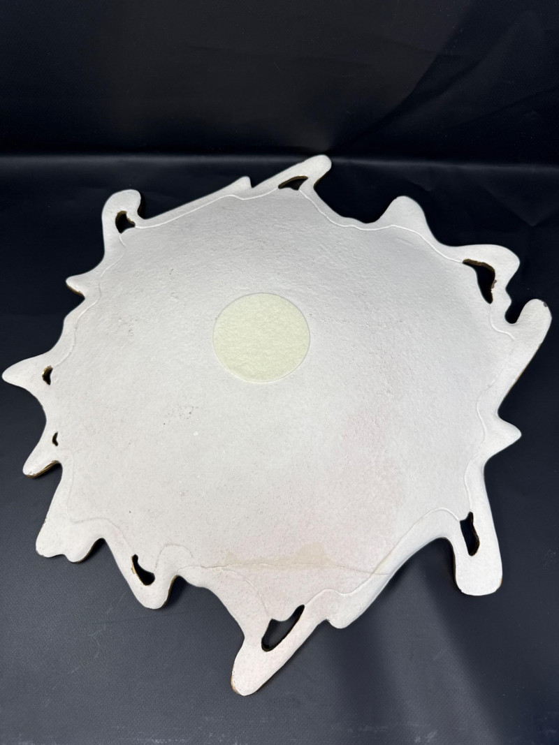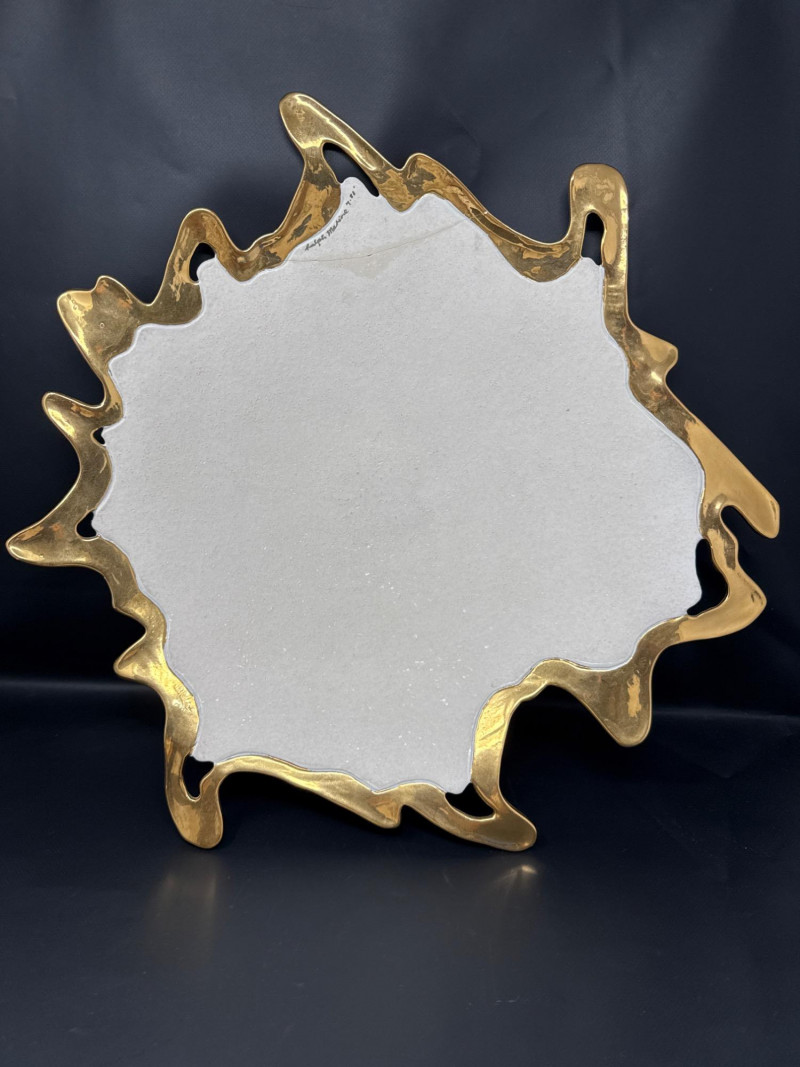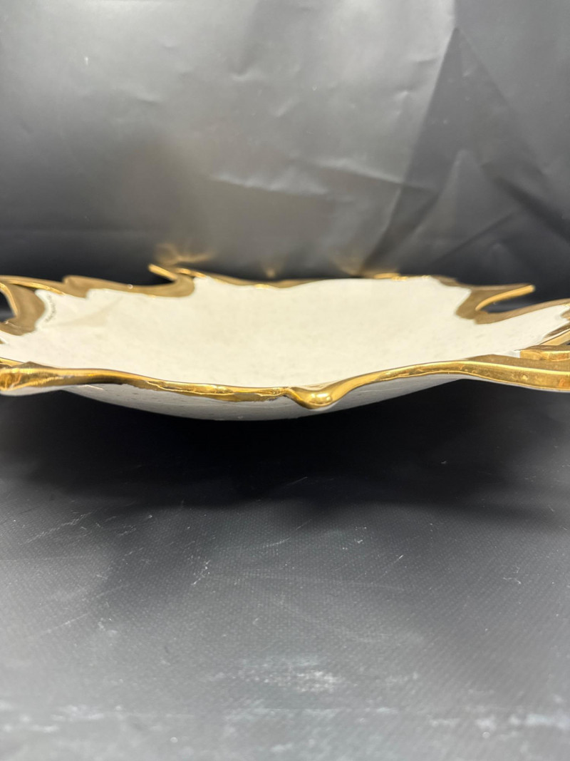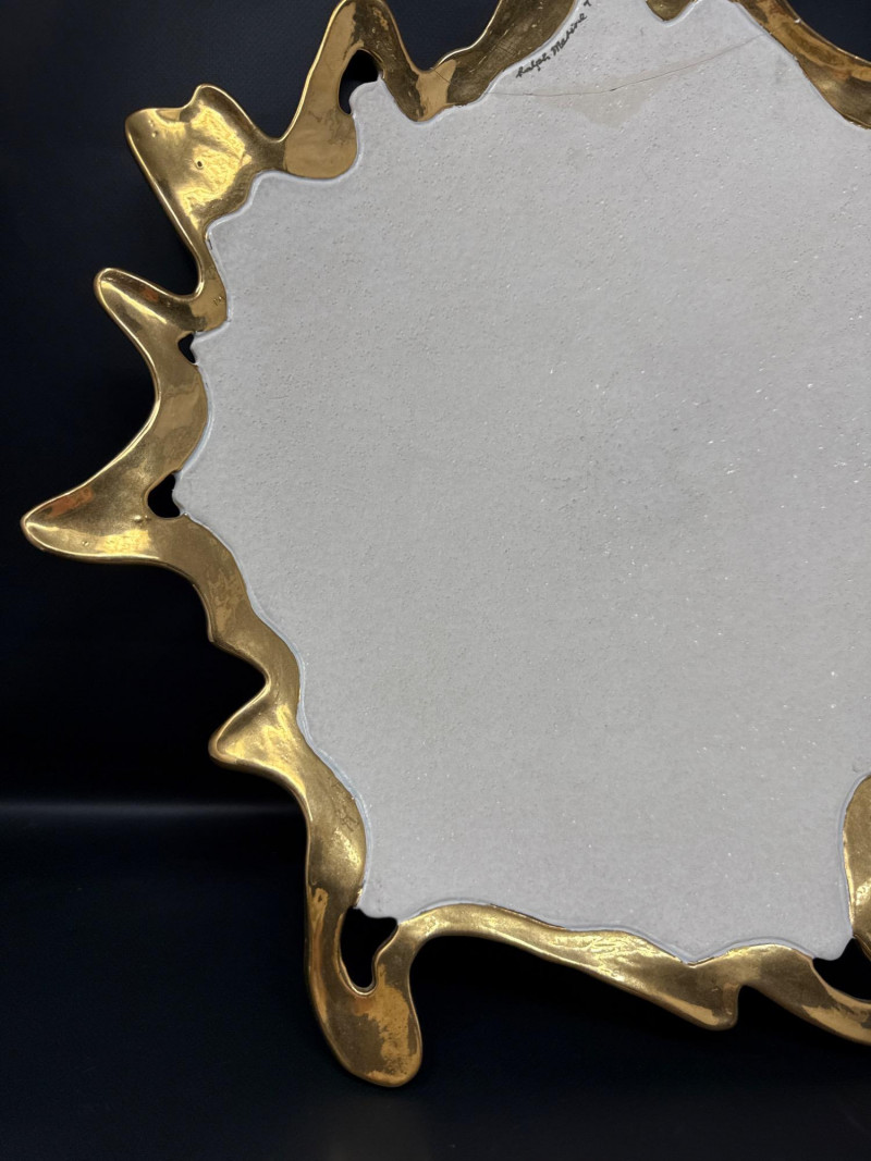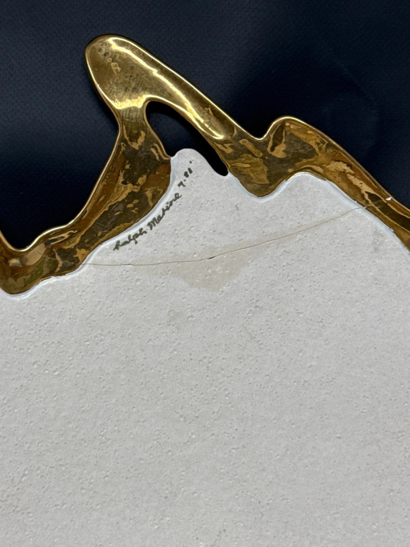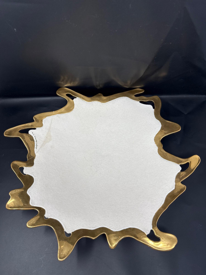 An elegant ceramic bowl by postmodern studio artist Ralph Majene, signed and dated 9.88 in green ink on the underside. This piece exemplifies Majene’s molten-edge aesthetic, featuring a jagged, flame-like rim finished in reflective gold that contrasts dramatically with the smooth ivory-glazed basin. The asymmetrical silhouette and bold palette reflect his fusion of organic movement and architectural precision. Artist: Ralph Majene’s ceramic works from the late 1980s reflect a bold postmodern sensibility, characterized by molten-edge rims, asymmetrical silhouettes, and a dramatic interplay of metallic luster and matte glaze. Though not widely documented in academic or museum circles, Majene’s pieces suggest a studio practice rooted in sculptural experimentation and decorative innovation. Artist Signature: Hand-signed “Ralph Majene 9.88” on the underside. Materials: High-fired ceramic with matte exterior and glossy interior white glaze and metallic gold embellishment; gold appears to be luster-glazed or electroplated. Dimensions: Approx. 20 inches wide. Style Notes: Late-1980s postmodern studio piece; ideal for collectors of sculptural ceramics, decorative arts, or signed vintage vessels. Bring packaging material for transport.A repaired crack that was very nicely done.