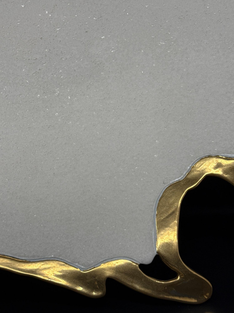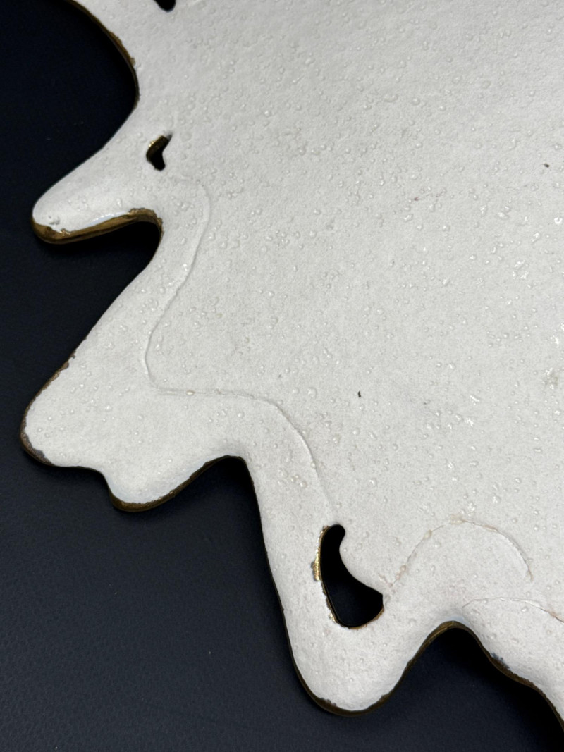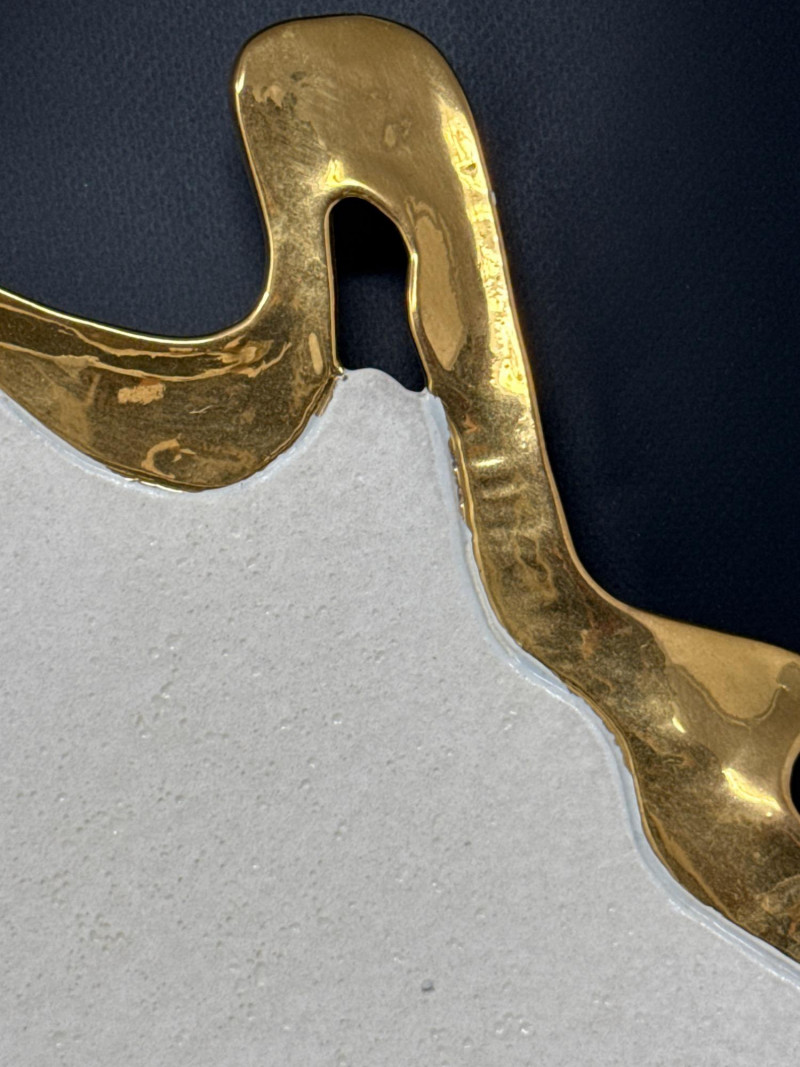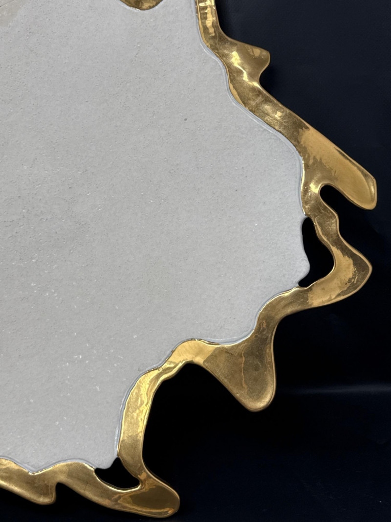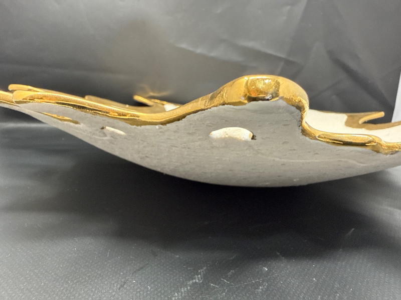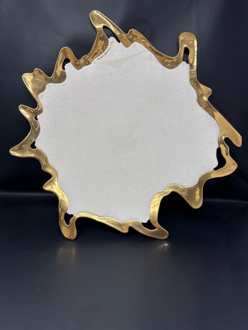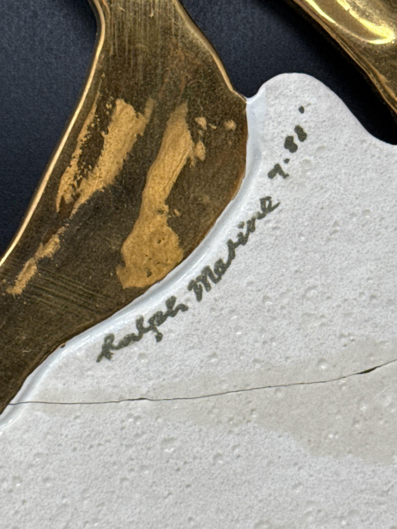 An elegant ceramic bowl by postmodern studio artist Ralph Majene, signed and dated 9.88 in green ink on the underside. This piece exemplifies Majene’s molten-edge aesthetic, featuring a jagged, flame-like rim finished in reflective gold that contrasts dramatically with the smooth ivory-glazed basin. The asymmetrical silhouette and bold palette reflect his fusion of organic movement and architectural precision. Artist: Ralph Majene’s ceramic works from the late 1980s reflect a bold postmodern sensibility, characterized by molten-edge rims, asymmetrical silhouettes, and a dramatic interplay of metallic luster and matte glaze. Though not widely documented in academic or museum circles, Majene’s pieces suggest a studio practice rooted in sculptural experimentation and decorative innovation. Artist Signature: Hand-signed “Ralph Majene 9.88” on the underside. Materials: High-fired ceramic with matte exterior and glossy interior white glaze and metallic gold embellishment; gold appears to be luster-glazed or electroplated. Dimensions: Approx. 20 inches wide. Style Notes: Late-1980s postmodern studio piece; ideal for collectors of sculptural ceramics, decorative arts, or signed vintage vessels. Bring packaging material for transport.A repaired crack that was very nicely done.