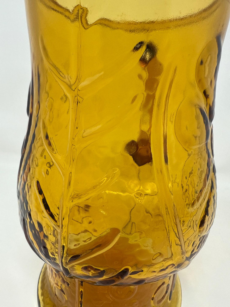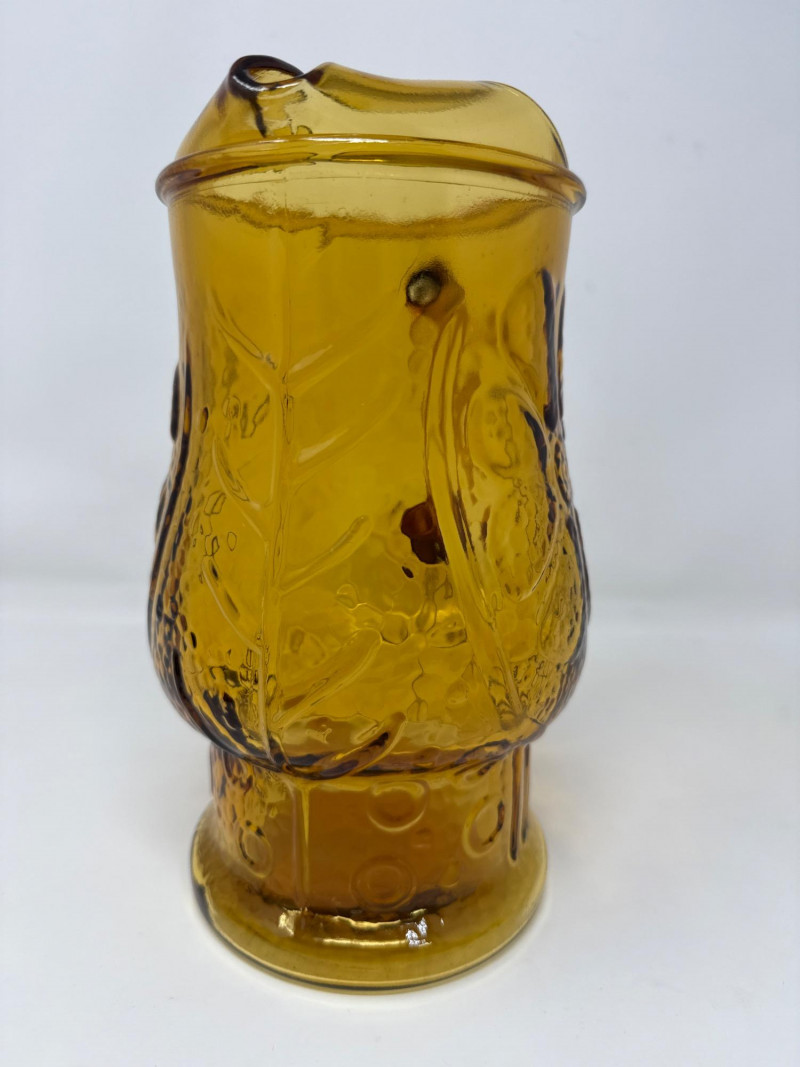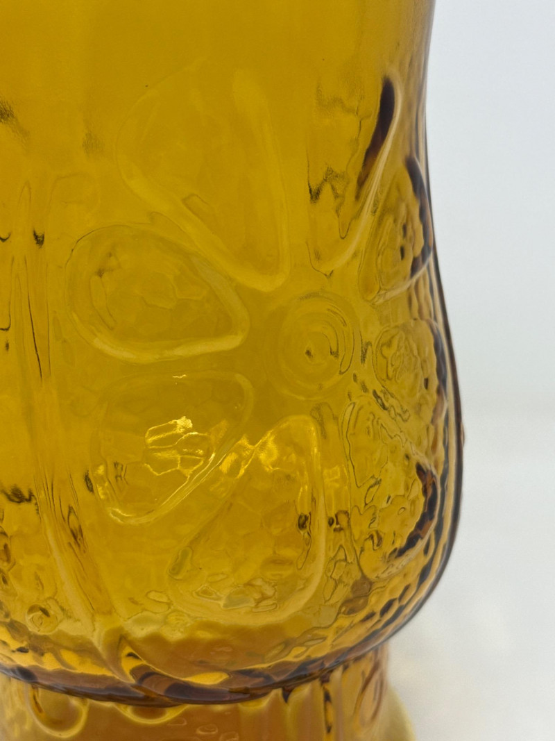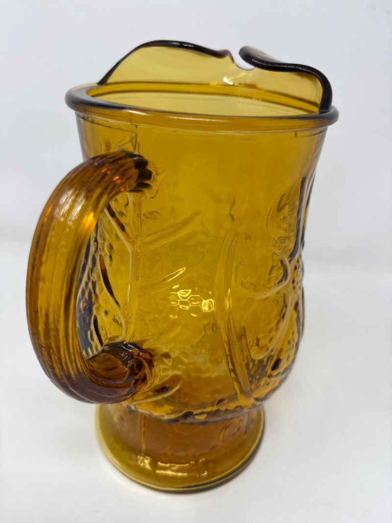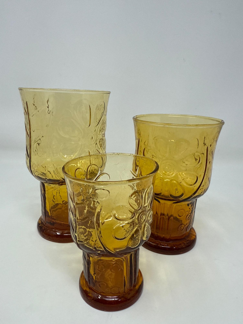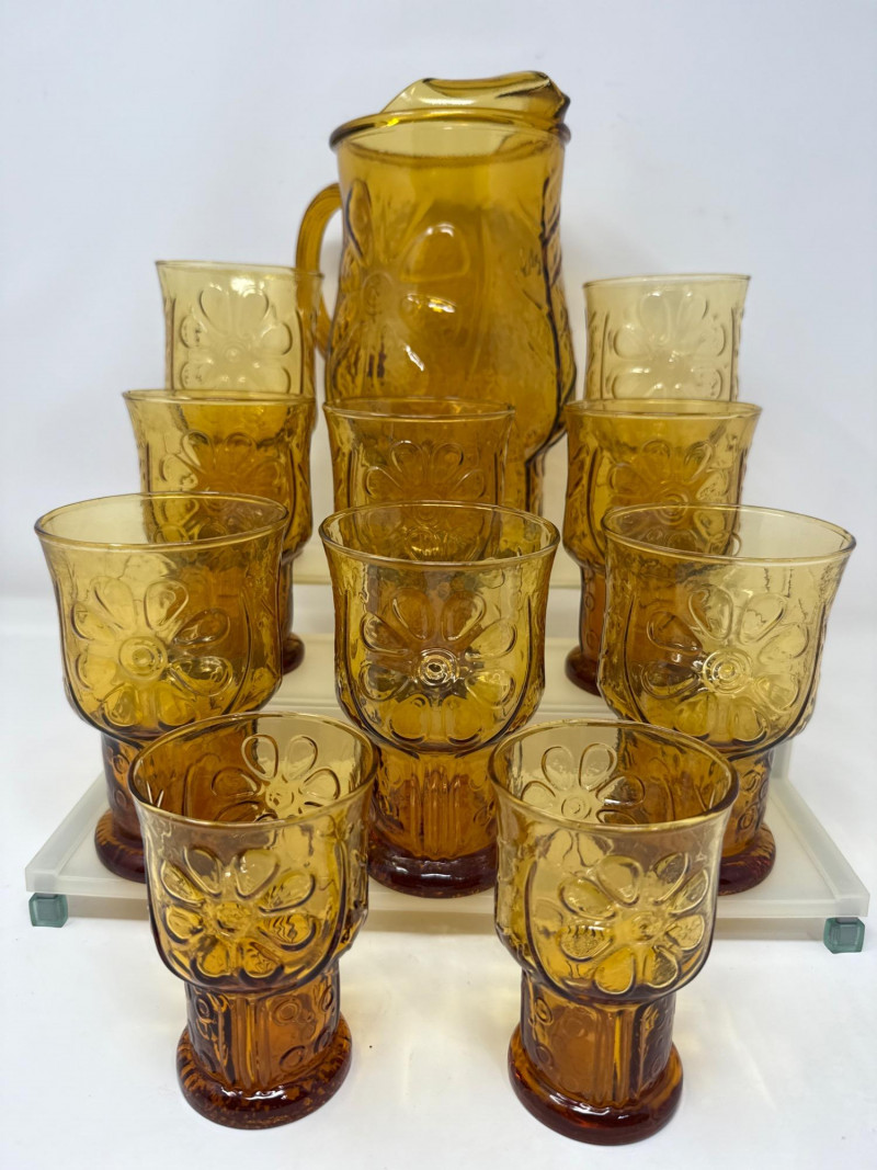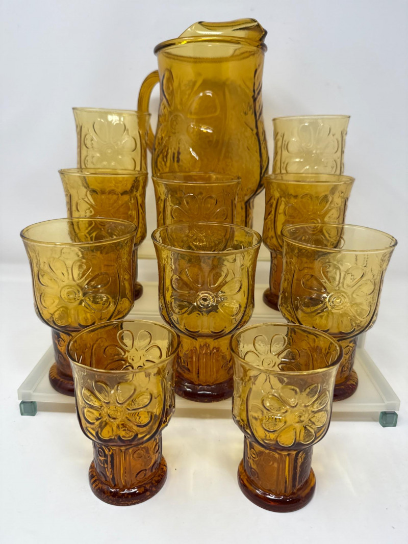 A mid-century beverage set in warm amber pressed glass, featuring a raised daisy and leaf motif consistent with Libbey’s “Country Garden” pattern. This 11-piece collection includes: 1 Pitcher – approx. 64 oz capacity, 10" tall, with ice lip and angular handle 10 Matching Glasses in three graduated sizes: Cooler Glasses – approx. 6" tall Juice Glasses – approx. 4" tall Cordial Glasses – approx. 3.25" tall Design Notes: