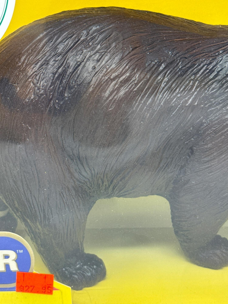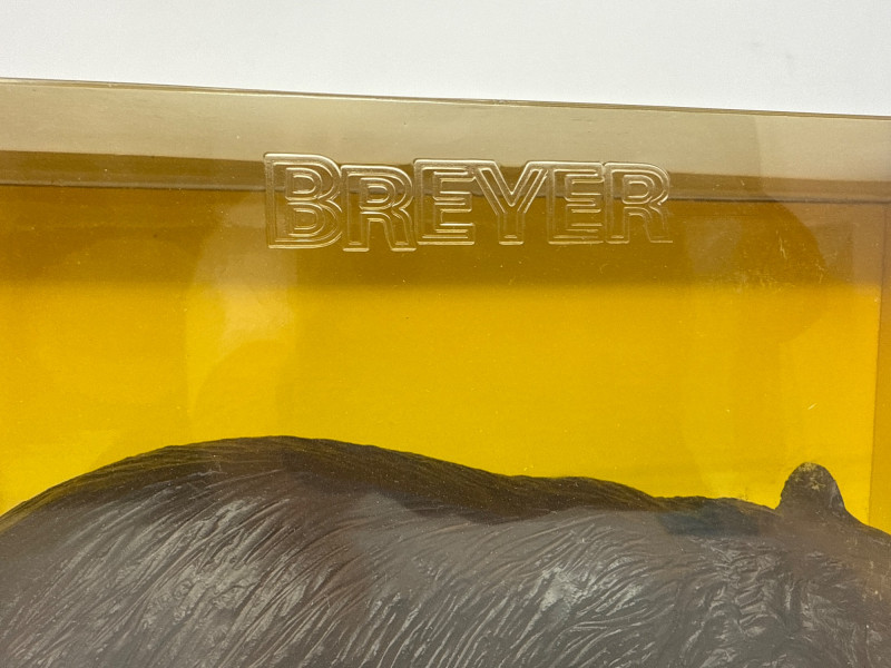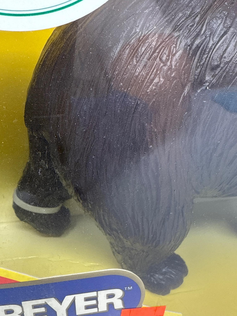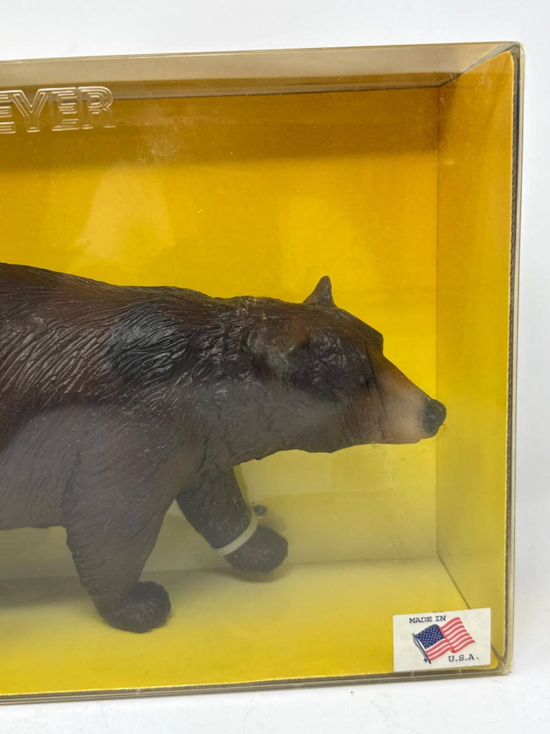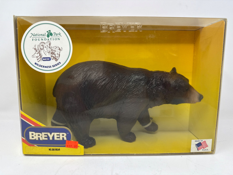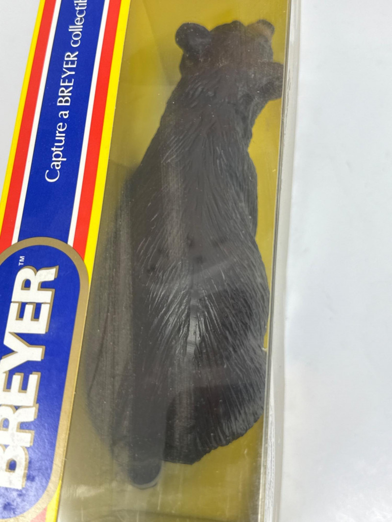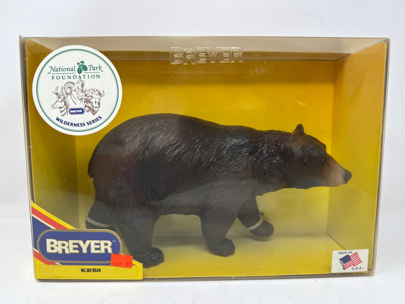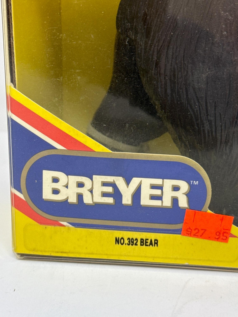 A vintage Breyer “Black Bear” figurine, Model No. 392, presented in its original packaging. This collectible showcases Breyer’s signature attention to anatomical realism and surface detail, depicting a black bear in a mid-stride pose. The figure is housed in a vibrant yellow box featuring patriotic red, white, and blue diagonal striping, with a clear front panel for display. Brand: Breyer Model Number: No. 392 Bear Series: Wilderness-themed (unofficially aligned with National Park wildlife) Material: Molded plastic with painted finish Color: Black Packaging: Original box with clear display window and bold graphic design Labeling: Blue “BREYER™” logo; model number printed in black with price marked $27.95Key Details: