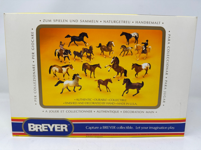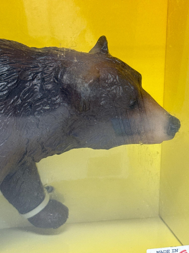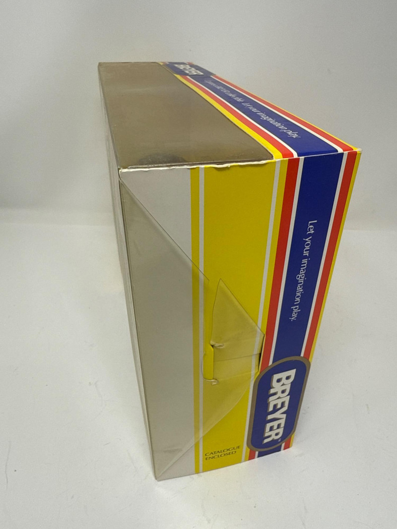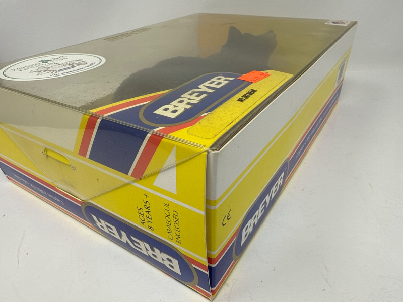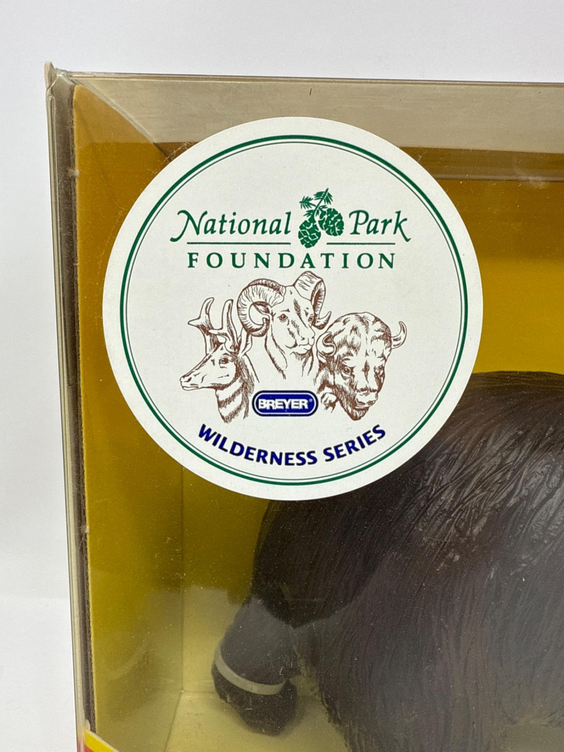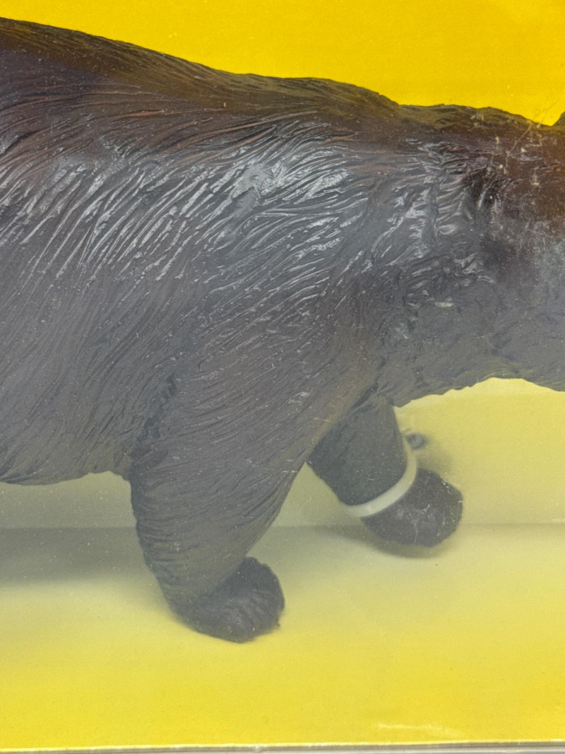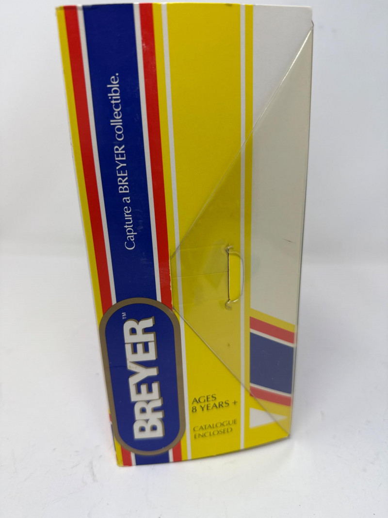 A vintage Breyer “Black Bear” figurine, Model No. 392, presented in its original packaging. This collectible showcases Breyer’s signature attention to anatomical realism and surface detail, depicting a black bear in a mid-stride pose. The figure is housed in a vibrant yellow box featuring patriotic red, white, and blue diagonal striping, with a clear front panel for display. Brand: Breyer Model Number: No. 392 Bear Series: Wilderness-themed (unofficially aligned with National Park wildlife) Material: Molded plastic with painted finish Color: Black Packaging: Original box with clear display window and bold graphic design Labeling: Blue “BREYER™” logo; model number printed in black with price marked $27.95Key Details: