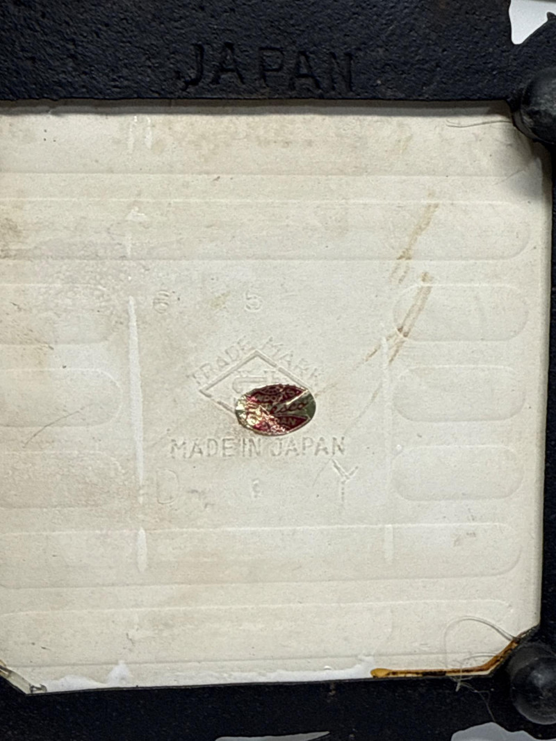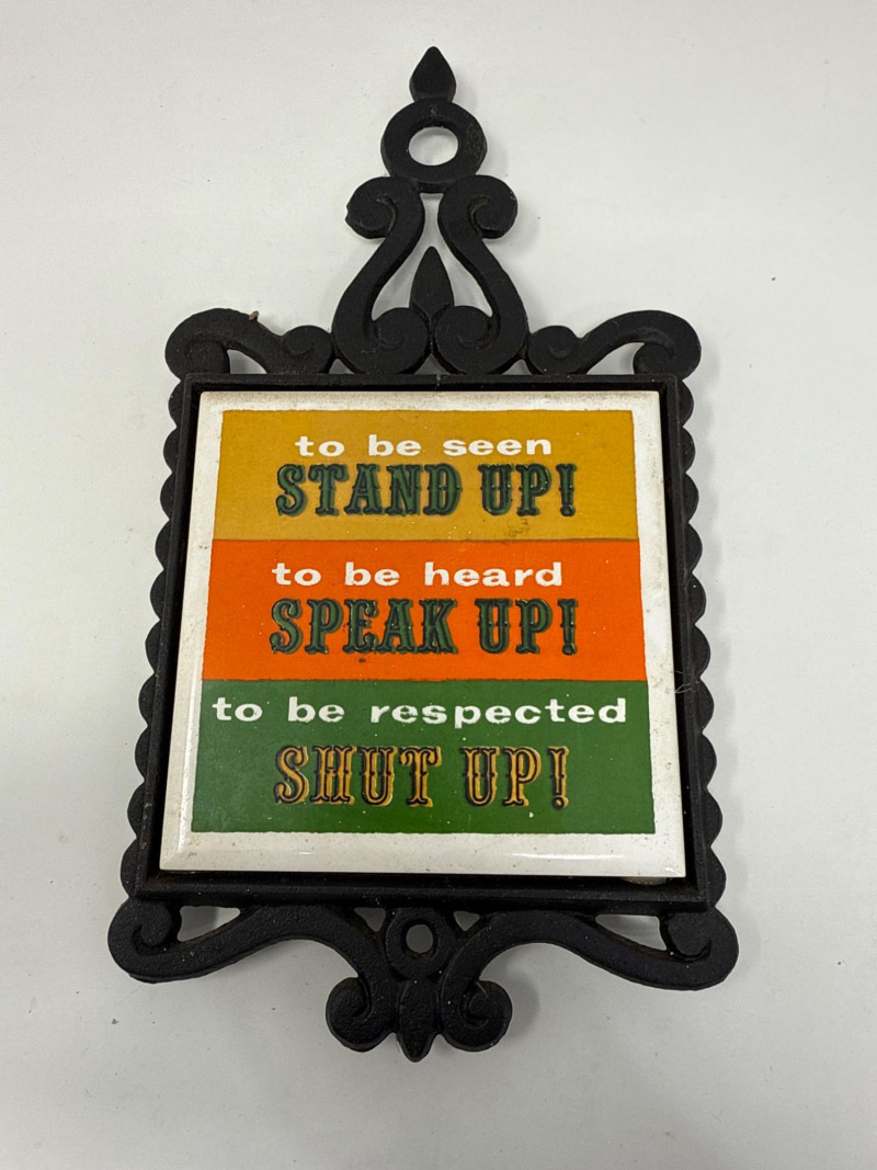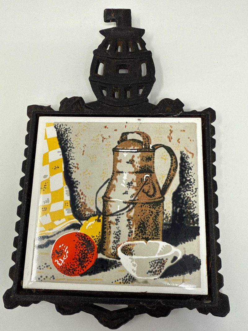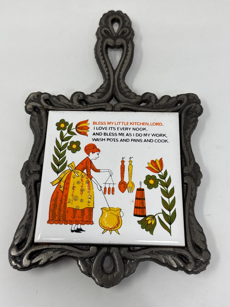 A curated set of five mid-century Japanese export wall trivets, each featuring a decorative tile mounted in ornate black cast iron frames. These functional and collectible pieces showcase a mix of humorous sayings, devotional verses, and rustic kitchen scenes. Ideal for vintage décor enthusiasts, folk art collectors, or stylists seeking retro charm. Set Includes: Rooster with sunburst and Psalm 118:24: “This is the day which the Lord hath made…” Apron-clad cook with kitchen blessing: “Bless my little kitchen, Lord…” Hanging rack scene with humorous message: “Thank you for noticing my new tile trivet…” Bold motivational typography: “To be seen STAND UP! / To be heard SPEAK UP! / To be respected SHUT UP!” Still life with milk can, apple, teacup, and checkered cloth Dimensions (each): Length: 5.75 in Width: 9.5 in Materials: Cast iron frame Decorative tile Markings & Origin: Embossed “MADE IN JAPAN” and “Cherry” manufacturer marks Red metallic stickers and embossed codes on reverse Notable Features: Authentic 1960s–70s Japanese export pieces Highly collectible for fans of retro kitchen décor, folk art, and religious motifs Functional as trivets or decorative wall plaques