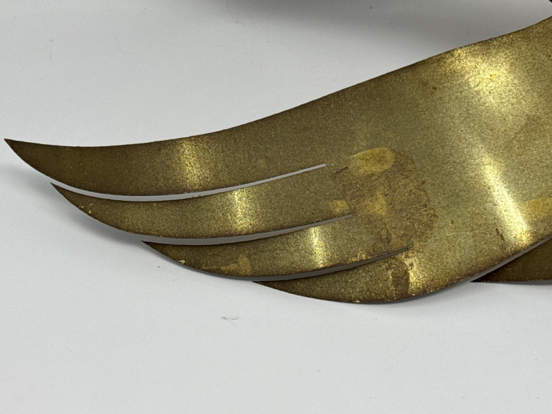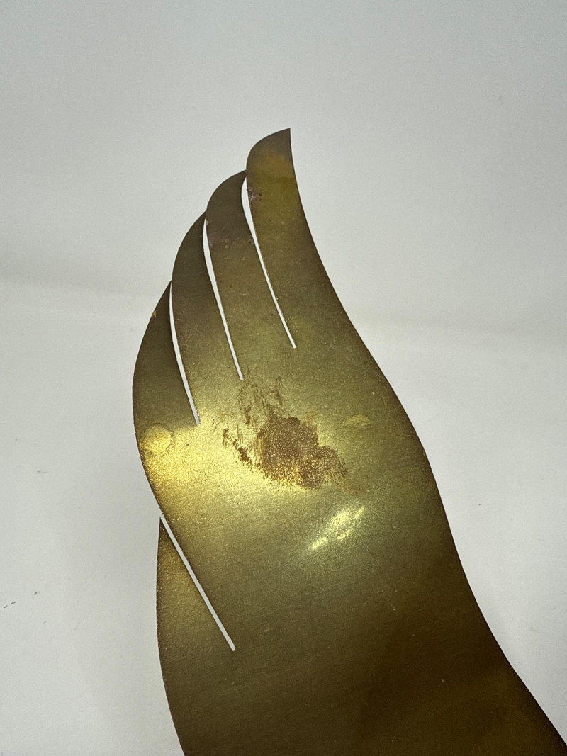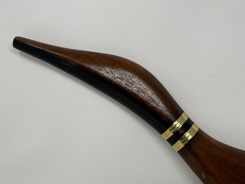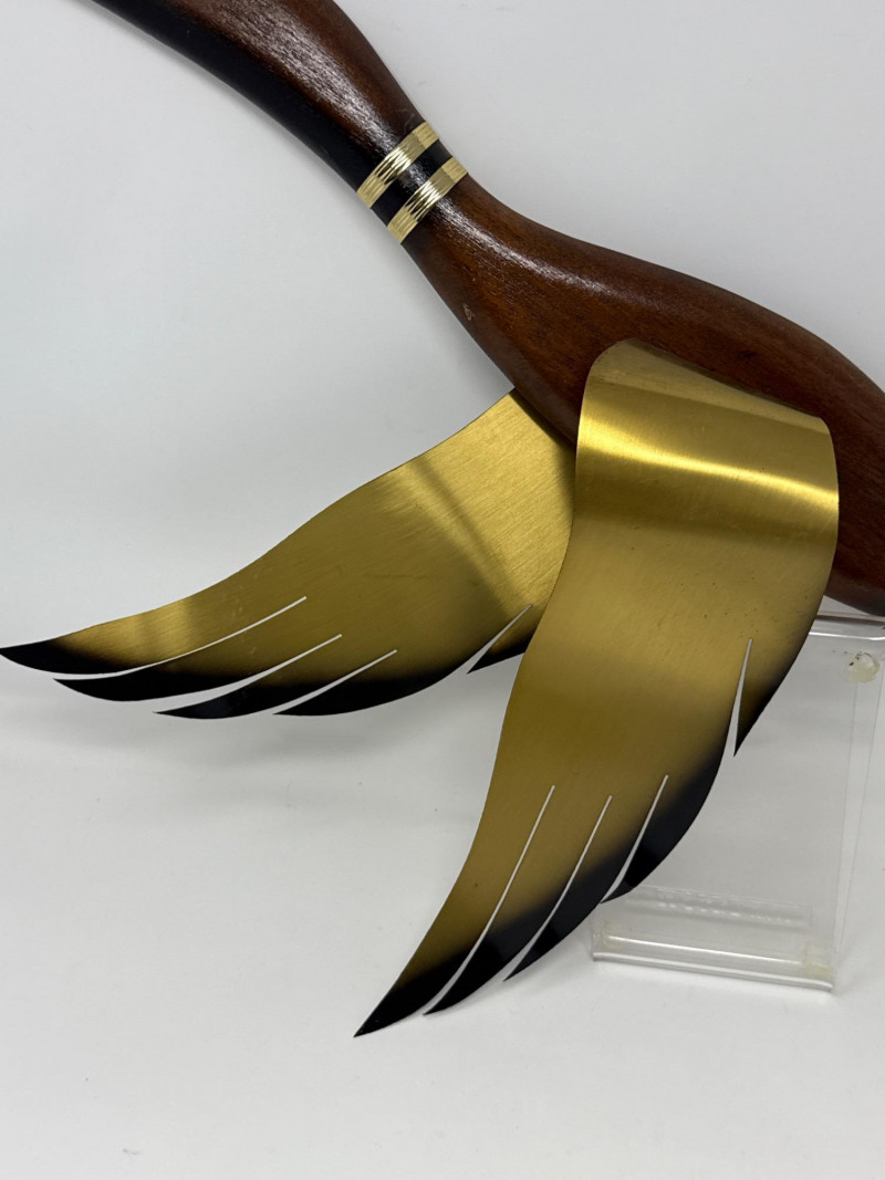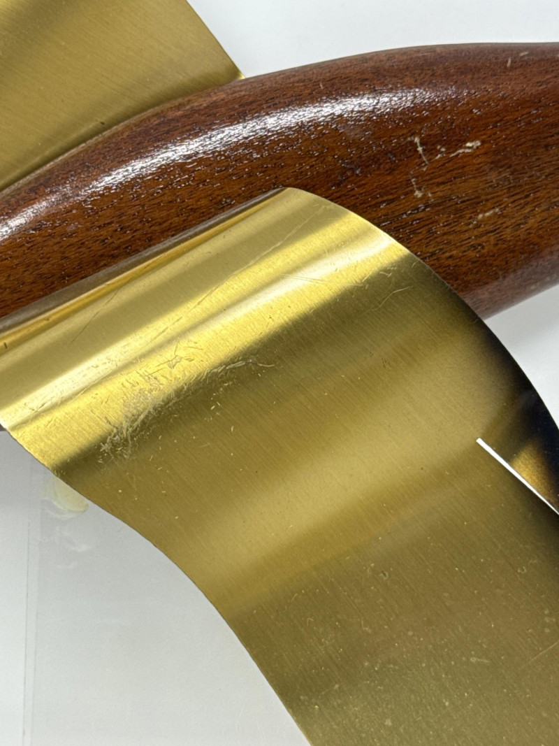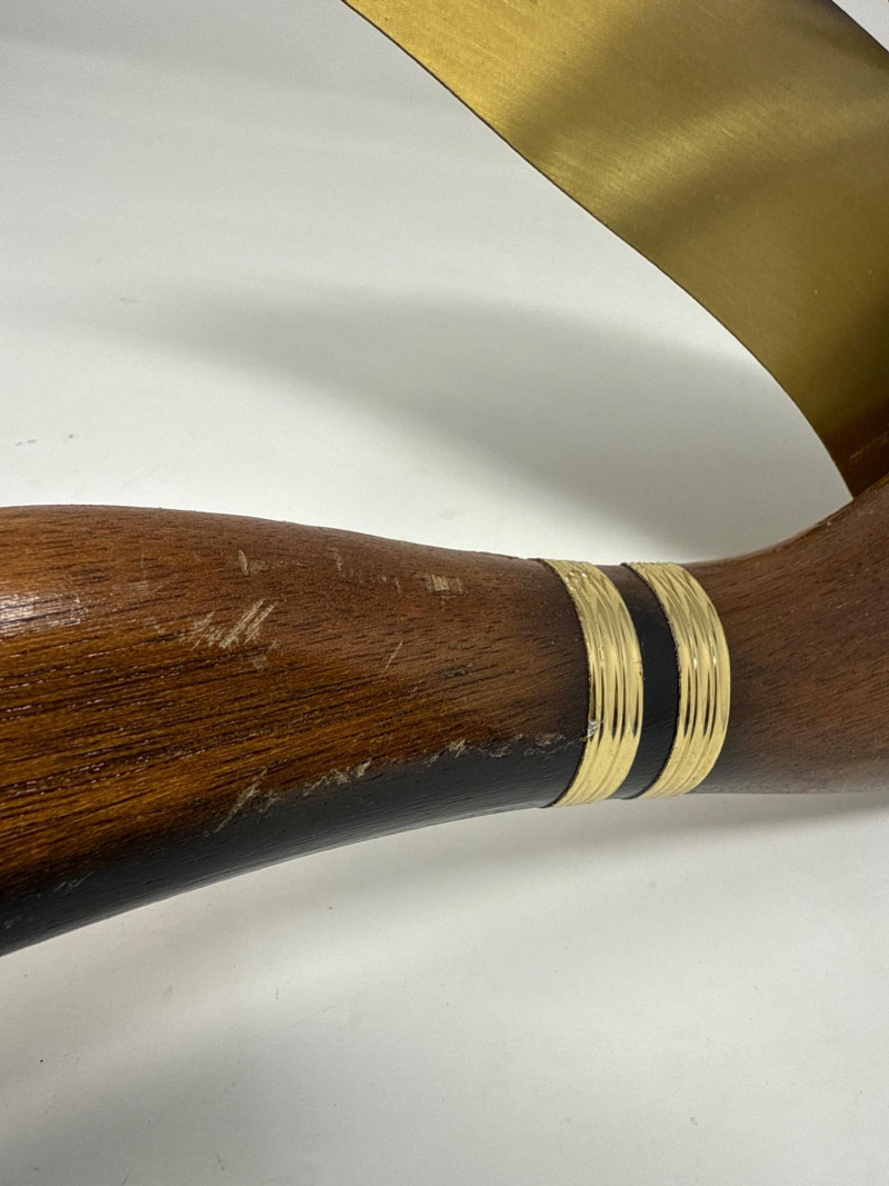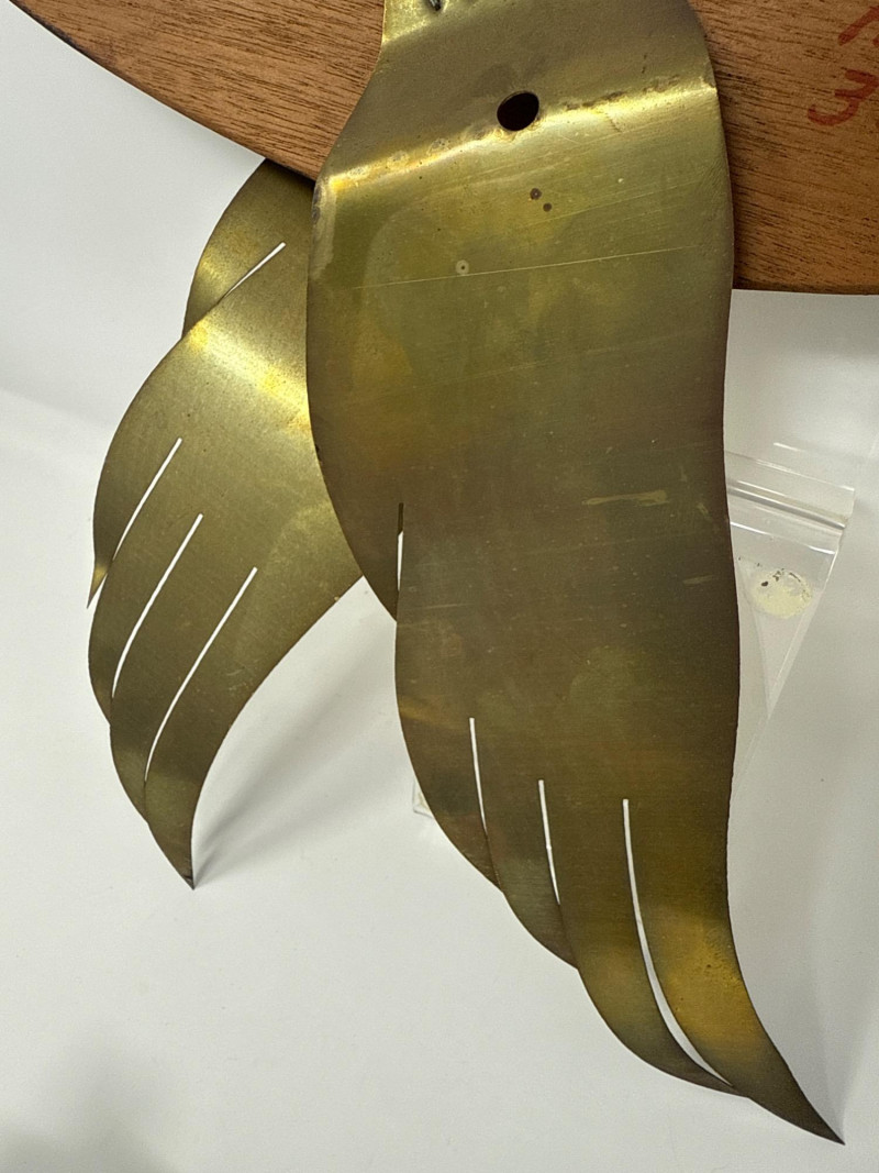 A striking example of mid-century modern decorative art, this sculptural wall piece features three mallards in dynamic flight, rendered in warm-toned wood with gleaming brass accents. The birds are gracefully arranged in a soaring formation, evoking motion and elegance. Each mallard showcases stylized contours and finely tapered wings, with brass inlays that catch the light and add visual depth. Details & Highlights: Solid wood construction with brass embellishments Sculptural relief format designed for wall display Maker unknown; consistent with American studio craft traditions Excellent vintage condition; minor wear consistent with age