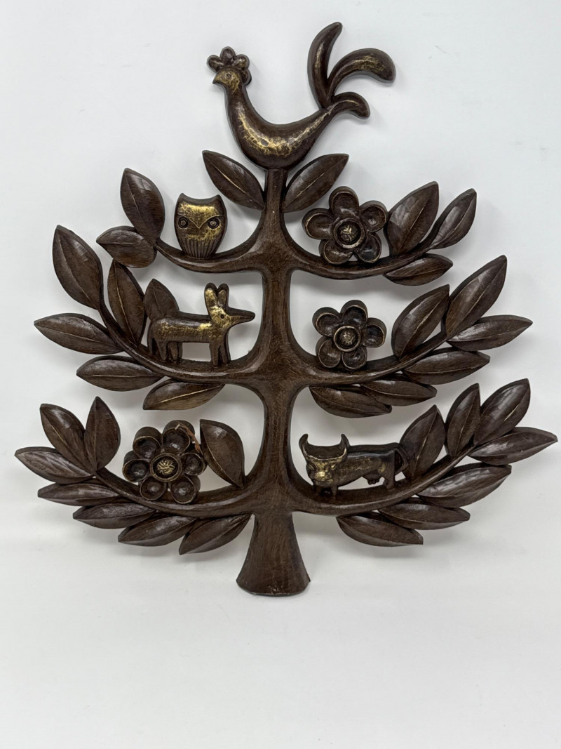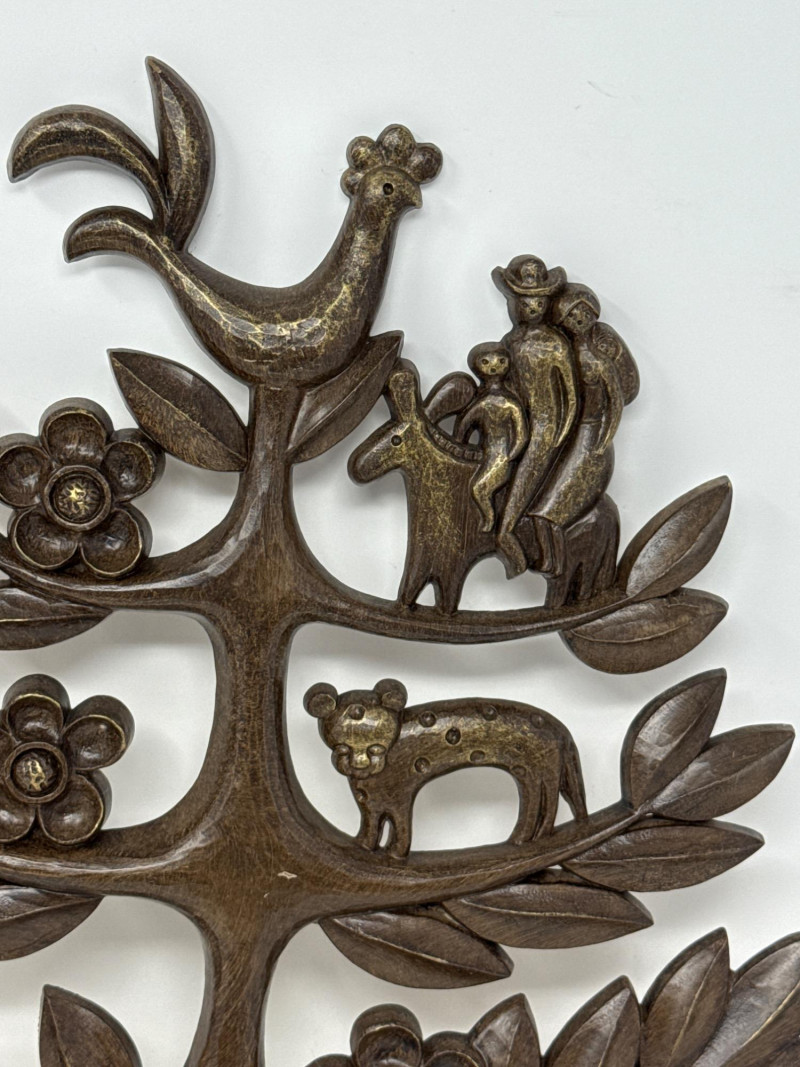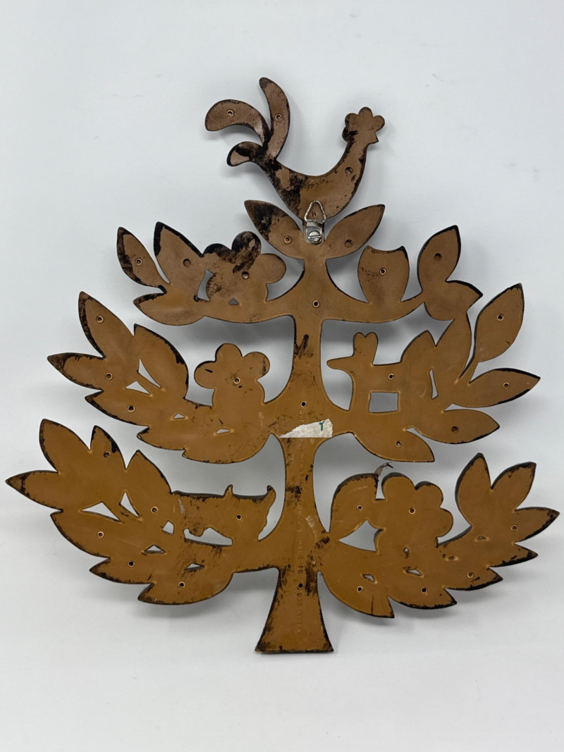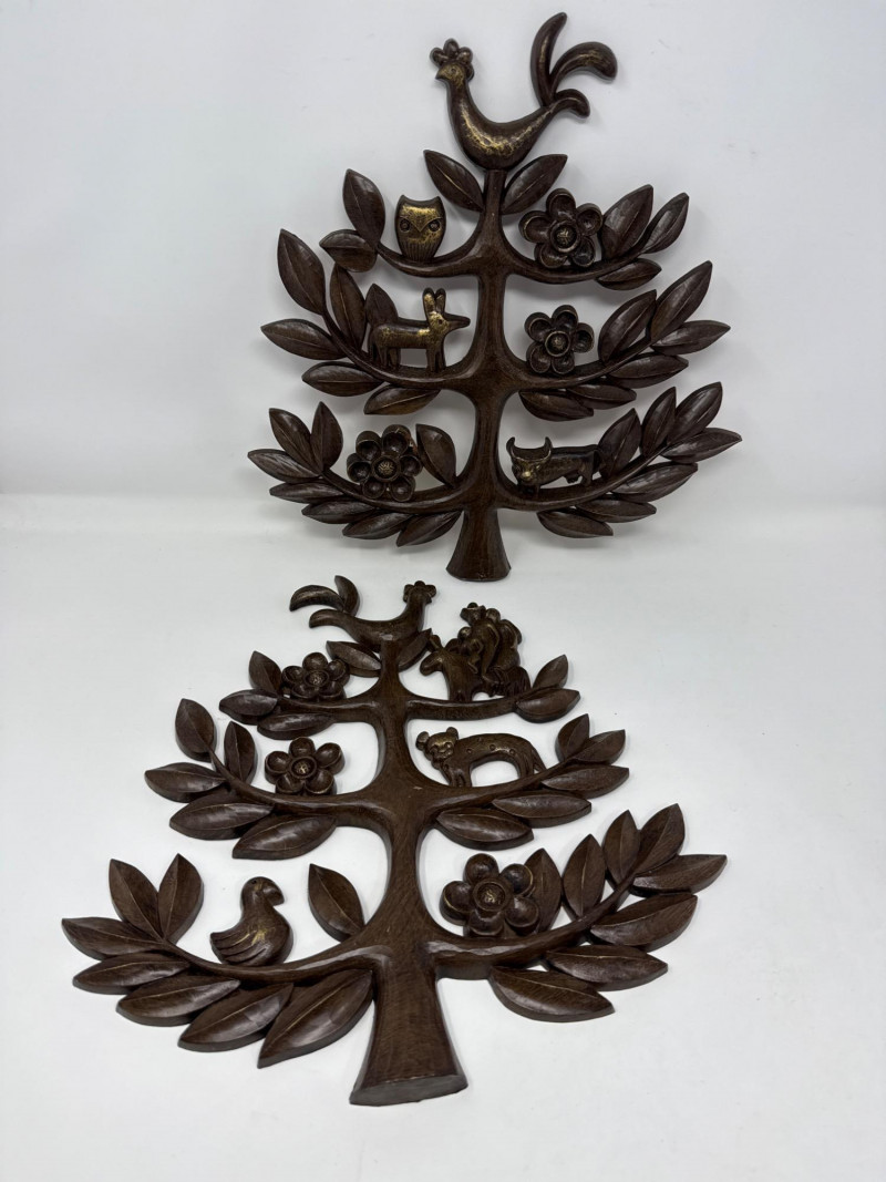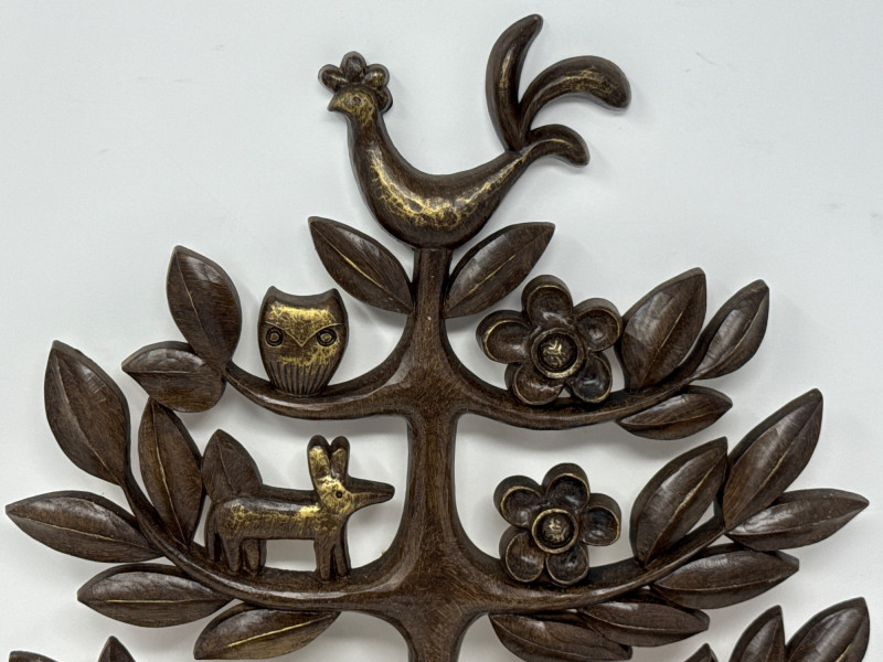 A vintage matched pair of wall plaques by Homco (Home Interiors & Gifts, Inc.), designed in 1963. Each plaque showcases a stylized Tree of Life with branching leaves, floral motifs, and gilt-accented animals including birds, a rooster, an owl, a deer, and other folk-art inspired figures. Crafted in molded resin with a warm faux wood-grain finish and highlighted with gold detailing, these plaques embody the mid-century modern Syroco-style aesthetic. Displayed together, they form a complementary set—ideal for retro, boho, or folk-inspired interiors. Maker: Homco (Home Interiors & Gifts, Inc.) Date of Design: 1963 Model Number: 4770A Material: Molded resin/plastic with faux wood grain and gilt accents Style: Mid-century modern, Syroco-inspired folk art Origin: Made in USA Dimensions (each): Approx. 13.5" L × 14" W Condition: Vintage; light age-appropriate wear A decorative and collectible duo that reflects the charm of 1960s American wall art—perfect for collectors and nostalgic decorators alike.Key Details