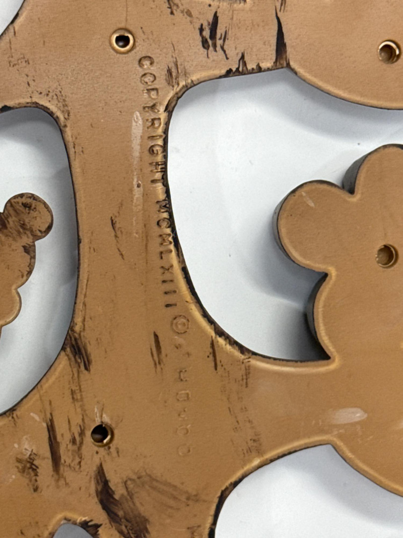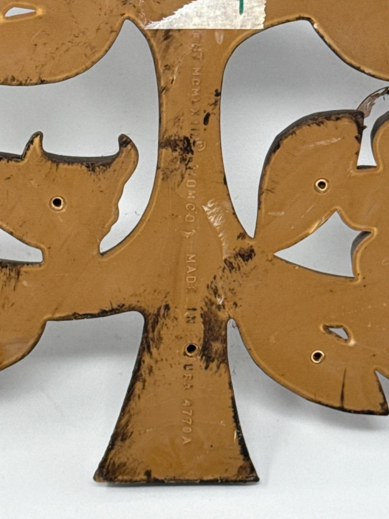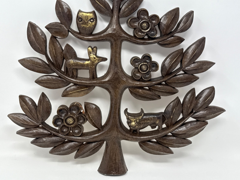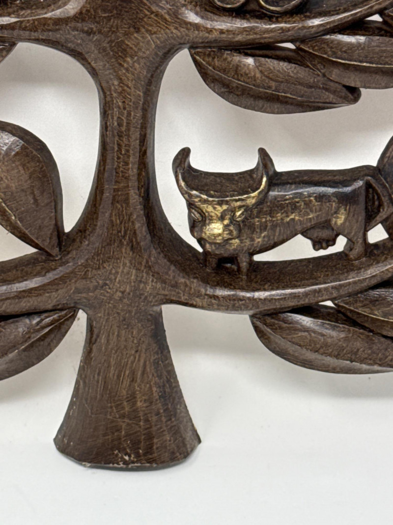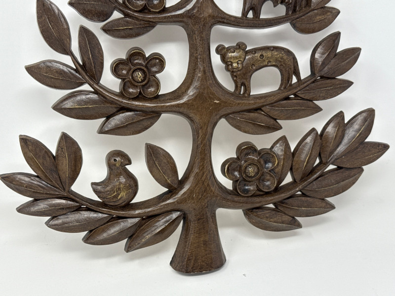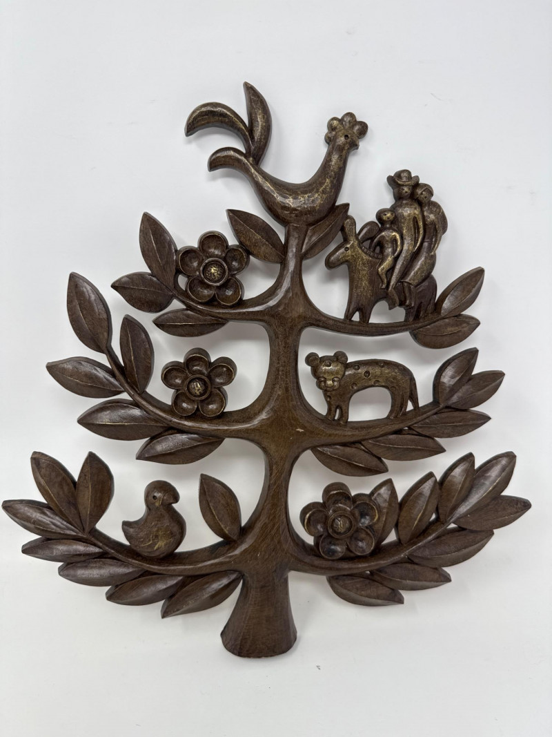 A vintage matched pair of wall plaques by Homco (Home Interiors & Gifts, Inc.), designed in 1963. Each plaque showcases a stylized Tree of Life with branching leaves, floral motifs, and gilt-accented animals including birds, a rooster, an owl, a deer, and other folk-art inspired figures. Crafted in molded resin with a warm faux wood-grain finish and highlighted with gold detailing, these plaques embody the mid-century modern Syroco-style aesthetic. Displayed together, they form a complementary set—ideal for retro, boho, or folk-inspired interiors. Maker: Homco (Home Interiors & Gifts, Inc.) Date of Design: 1963 Model Number: 4770A Material: Molded resin/plastic with faux wood grain and gilt accents Style: Mid-century modern, Syroco-inspired folk art Origin: Made in USA Dimensions (each): Approx. 13.5" L × 14" W Condition: Vintage; light age-appropriate wear A decorative and collectible duo that reflects the charm of 1960s American wall art—perfect for collectors and nostalgic decorators alike.Key Details