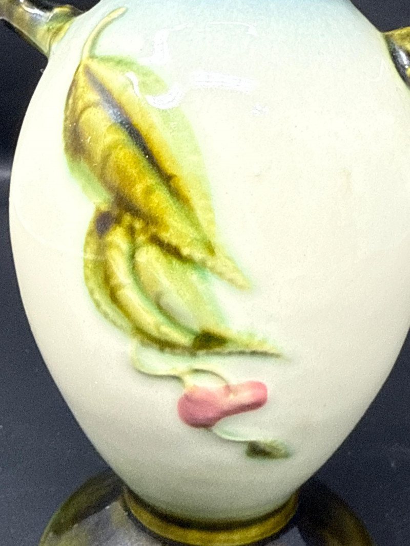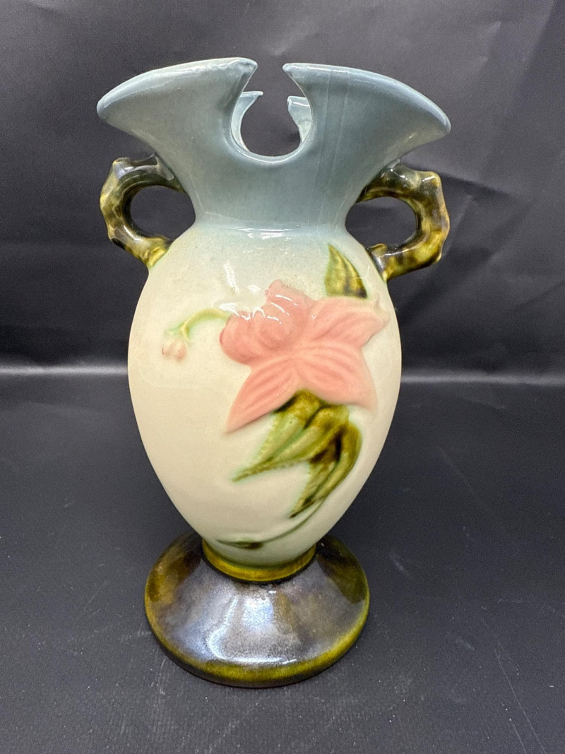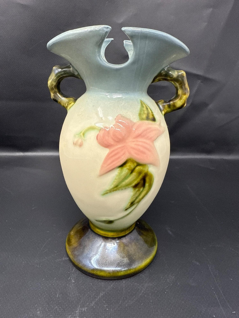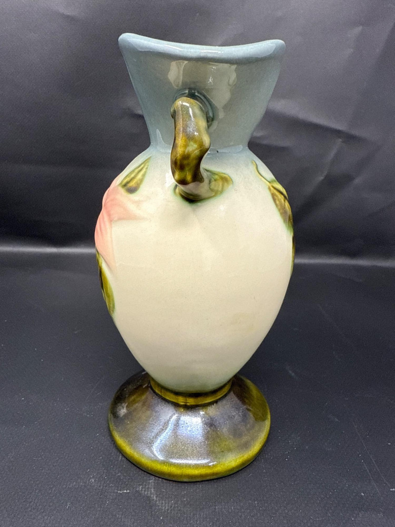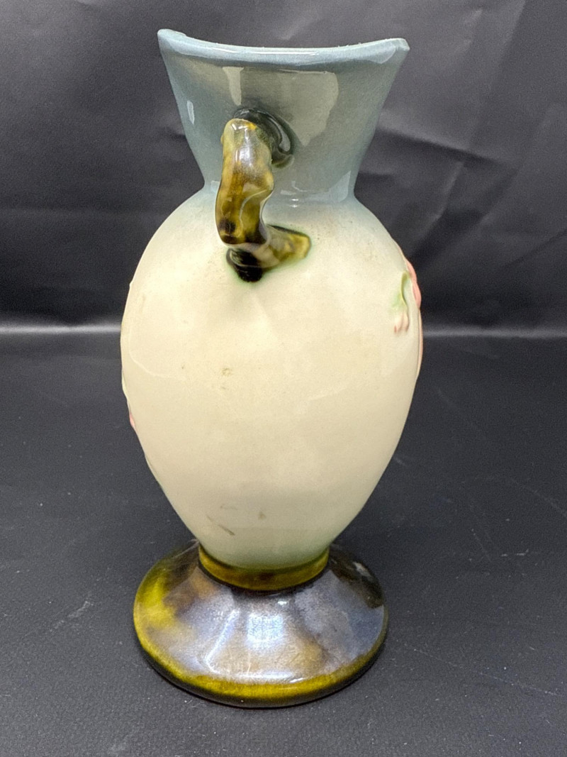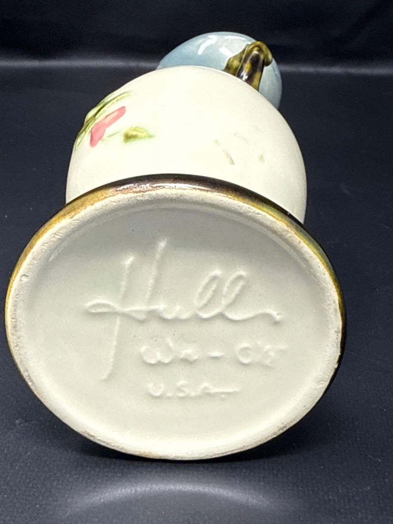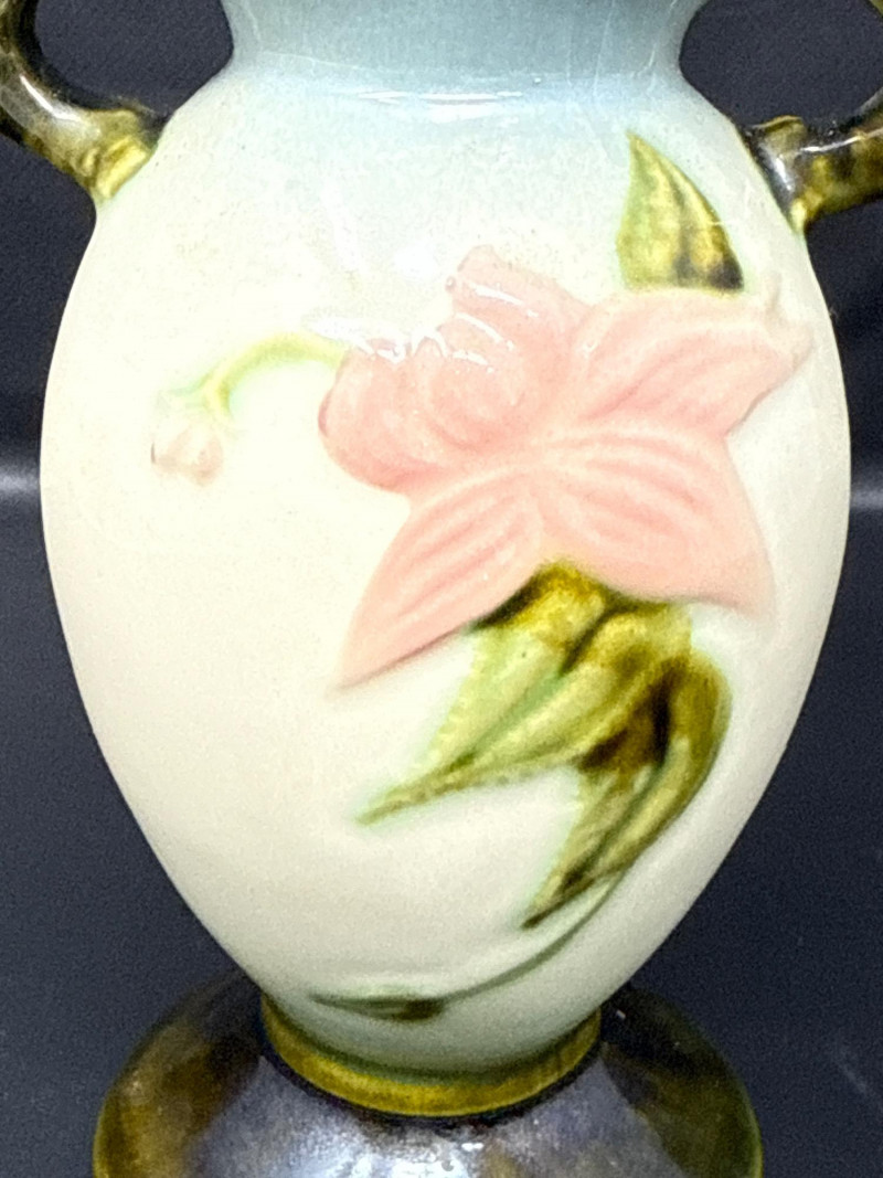 A graceful mid-century ceramic vase from Hull Pottery’s beloved Woodland line, model W4–6½, showcasing the brand’s signature pastel glaze and floral relief design. This piece features a soft pink and chartreuse palette with molded blossoms and foliage, evoking the romantic charm of post-war American art pottery. Maker’s Mark: Impressed “Hull USA W4–6½” on base, confirming authenticity and production era. Material: Glazed ceramic with a satin matte finish. Production Period: Circa late 1940s to early 1950s. Condition: Excellent vintage condition. No chips or cracks; light glaze crazing typical of age. Provenance: Estate collection, Midwest USA. This vase is a standout example of Hull’s Woodland series, prized for its sculptural form and nostalgic colorway. Ideal for collectors of American ceramics or decorators seeking a vintage accent with timeless appeal.