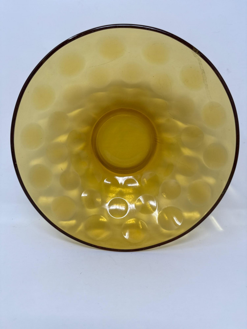 Footed candy dish in iridescent peach luster glass, attributed to Lancaster Glass. The geometric motifs reflect Aztec-inspired Art Deco styling. Measures 8″ tall and 5″ wide. A vibrant carnival glass accent with dramatic sheen and vintage appeal. Hazel Atlas “El Dorado” Coin Spot Optic Amber Bowl
