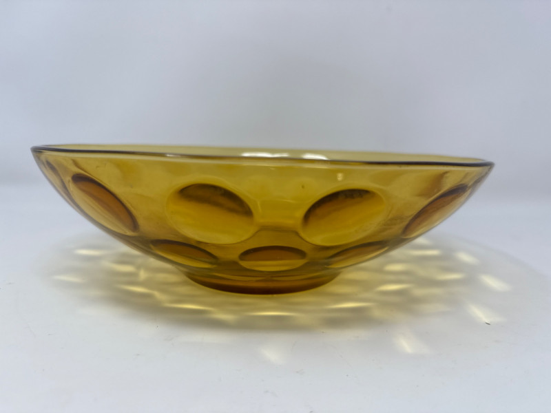 Amber glass bowl featuring the “Coin Spot” (or “Coin Dot”) optic pattern, with raised circular impressions and smooth exterior. Measures 9″ wide and 2.5″ tall. Produced by Hazel Atlas, this shallow bowl glows with retro charm and subtle texture. Condition: Minor surface wear consistent with age.