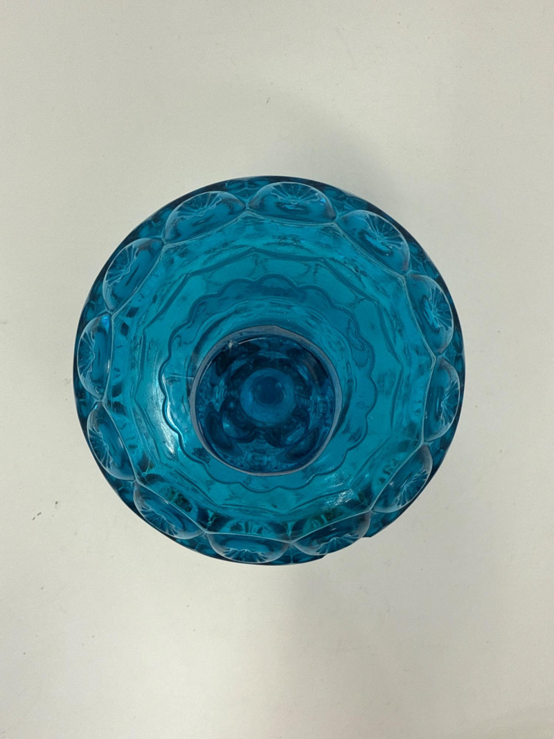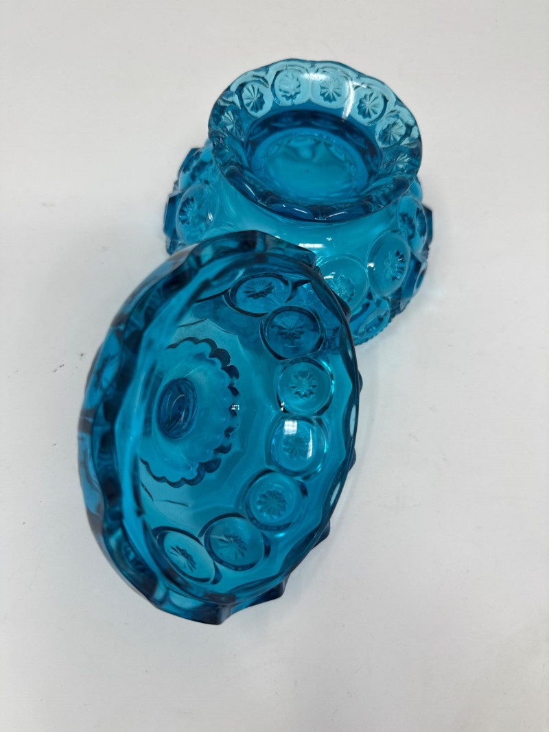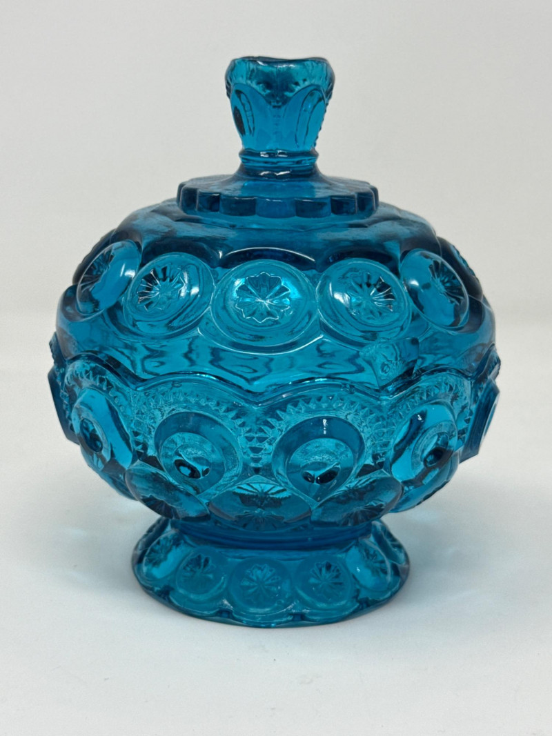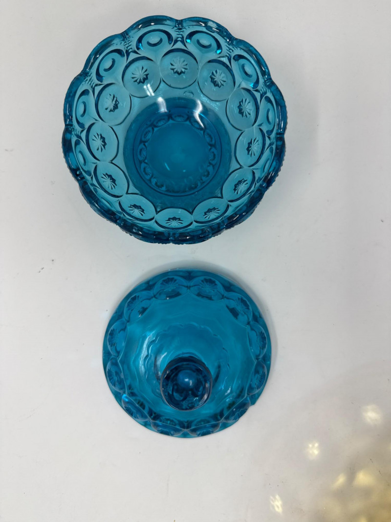 A curated selection of mid-century and Depression-era glassware, each piece showcasing distinctive color, form, and craftsmanship: LE Smith Colonial Blue “Moon and Stars” Lidded Compote