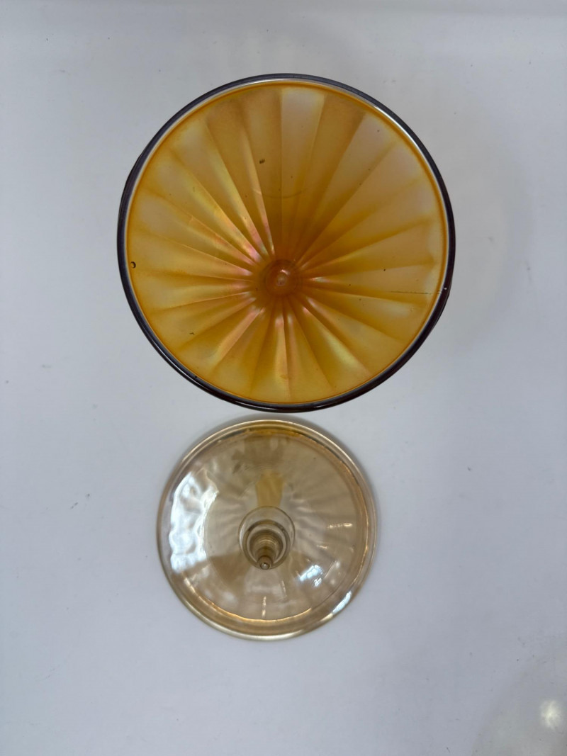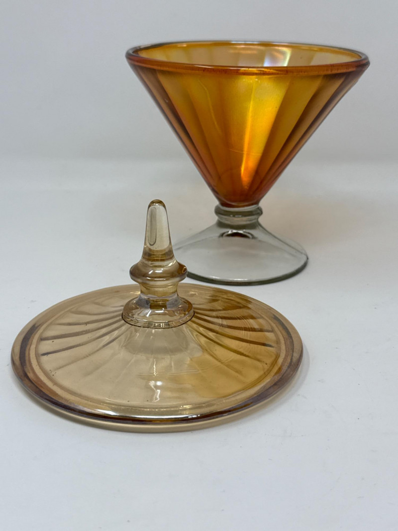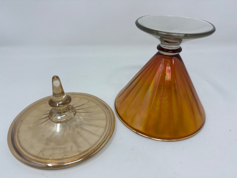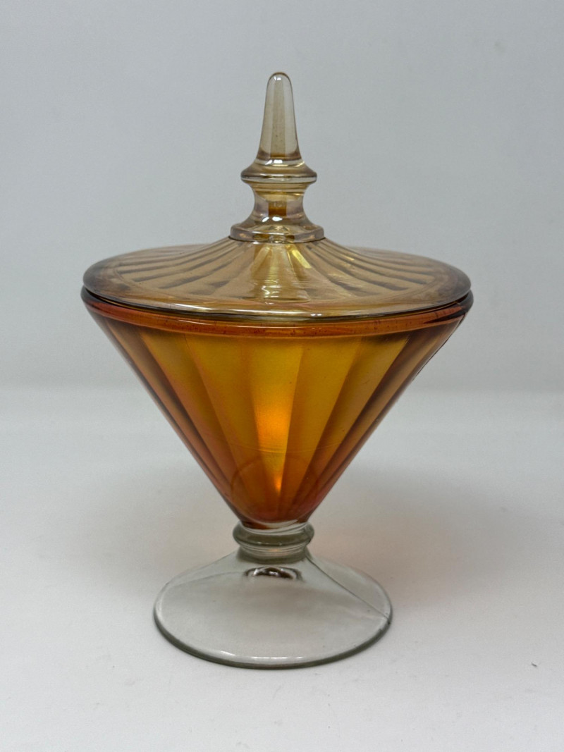 Pressed glass candy dish in rich colonial blue, featuring the iconic “Moon and Stars” pattern. Measures 6″ tall and 4.5″ wide, complete with matching lid and scalloped rim. Produced by L.E. Smith Glass Co., this mid-century piece offers bold color and classic form. Lancaster Aztec Art Deco Iridescent Peach Luster Covered Dish