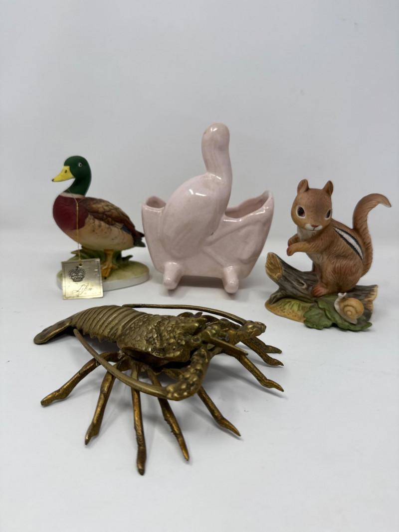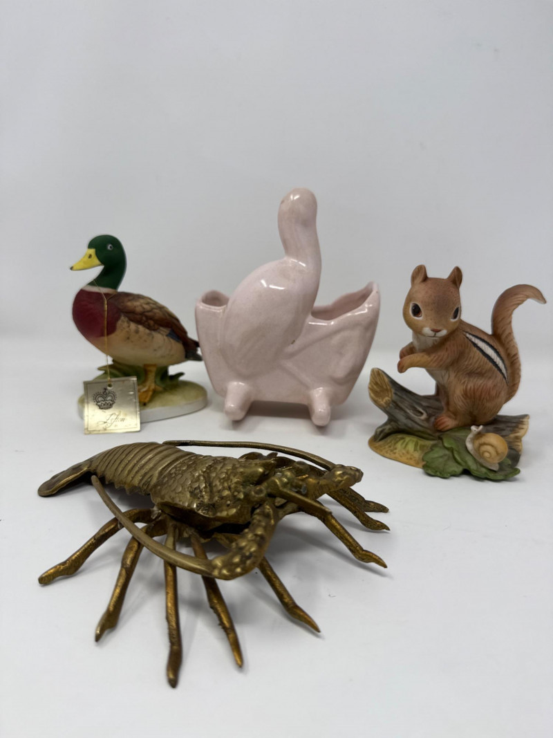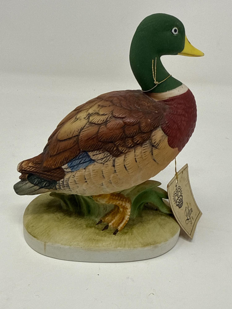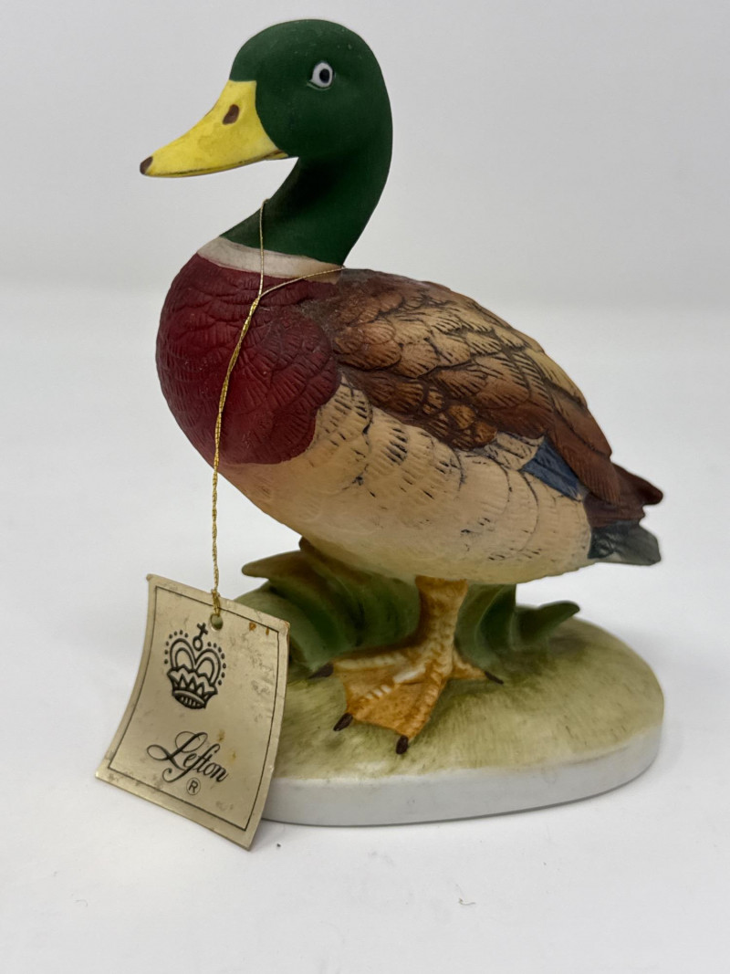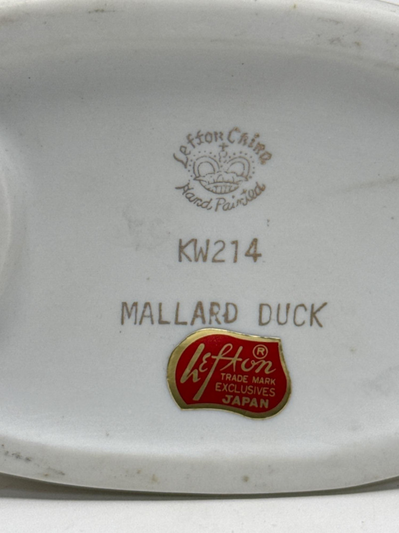 Assorted vintage decorative pieces featuring hand-painted porcelain, mid-century pottery, and solid brass craftsmanship. Each item includes original maker attribution and labeling where applicable. Hand-painted porcelain in naturalistic tones Mark Title: Lefton China – KW214 – Mallard Duck Includes original foil label and hang tag Dimensions: approx. 5.75" H Mid-century ceramic with soft pink glaze Stylized swan form on four short legs Mark Title: Haeger (on original foil label) Dimensions: approx. 6" H Porcelain figurine of chipmunk on log with snail Hand-painted details Mark Title: Homco – 1487 (with logo and foil label) Dimensions: approx. 5" H Solid brass crustacean with segmented body and extended antennae Decorative accent or paperweight Mark Title: Unmarked (no visible maker’s mark) Dimensions: approx. 7.5" LLefton China Mallard Duck Figurine (KW214)
