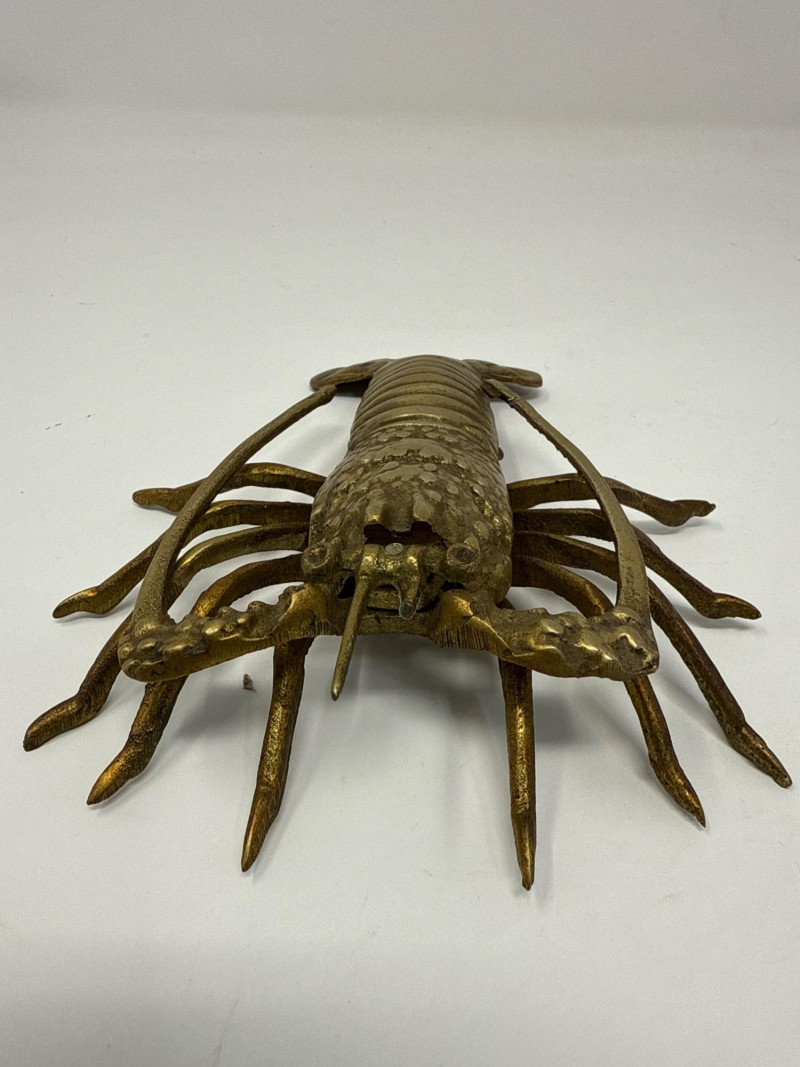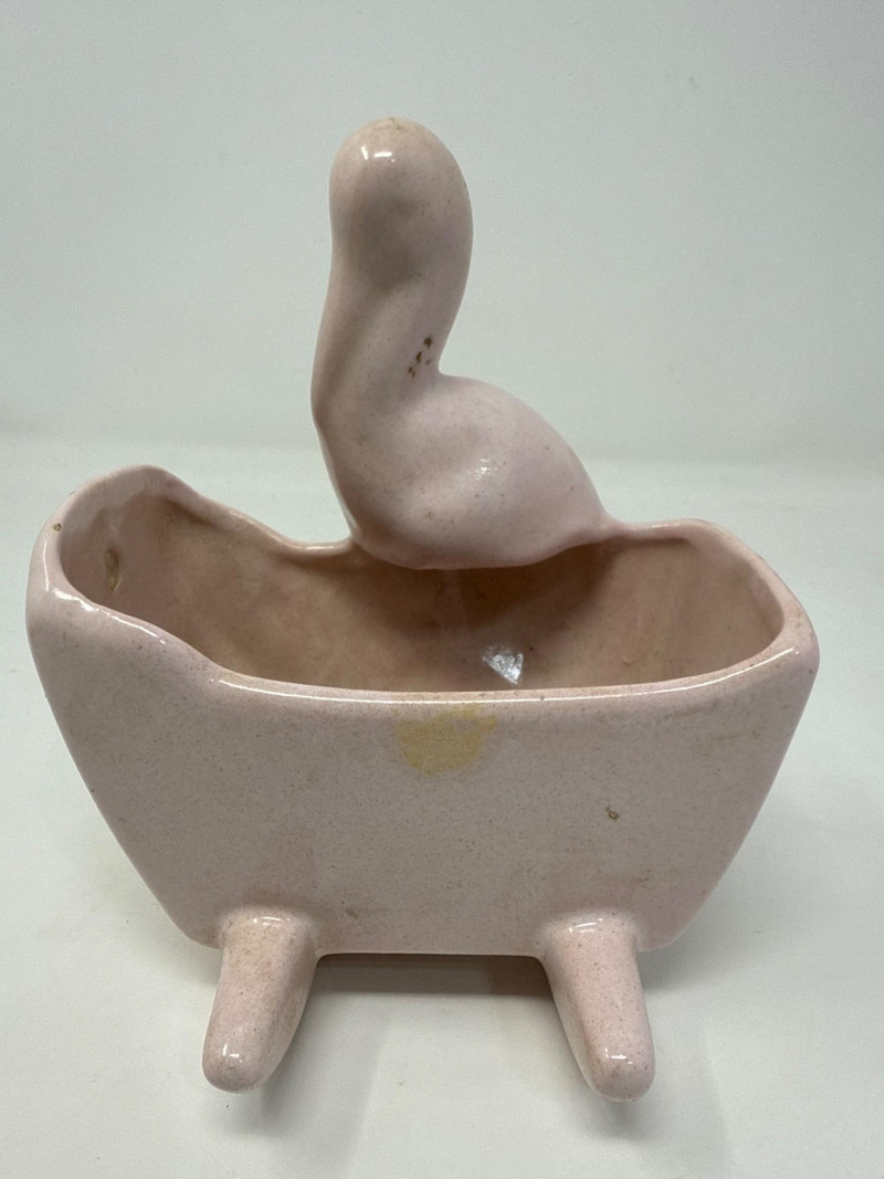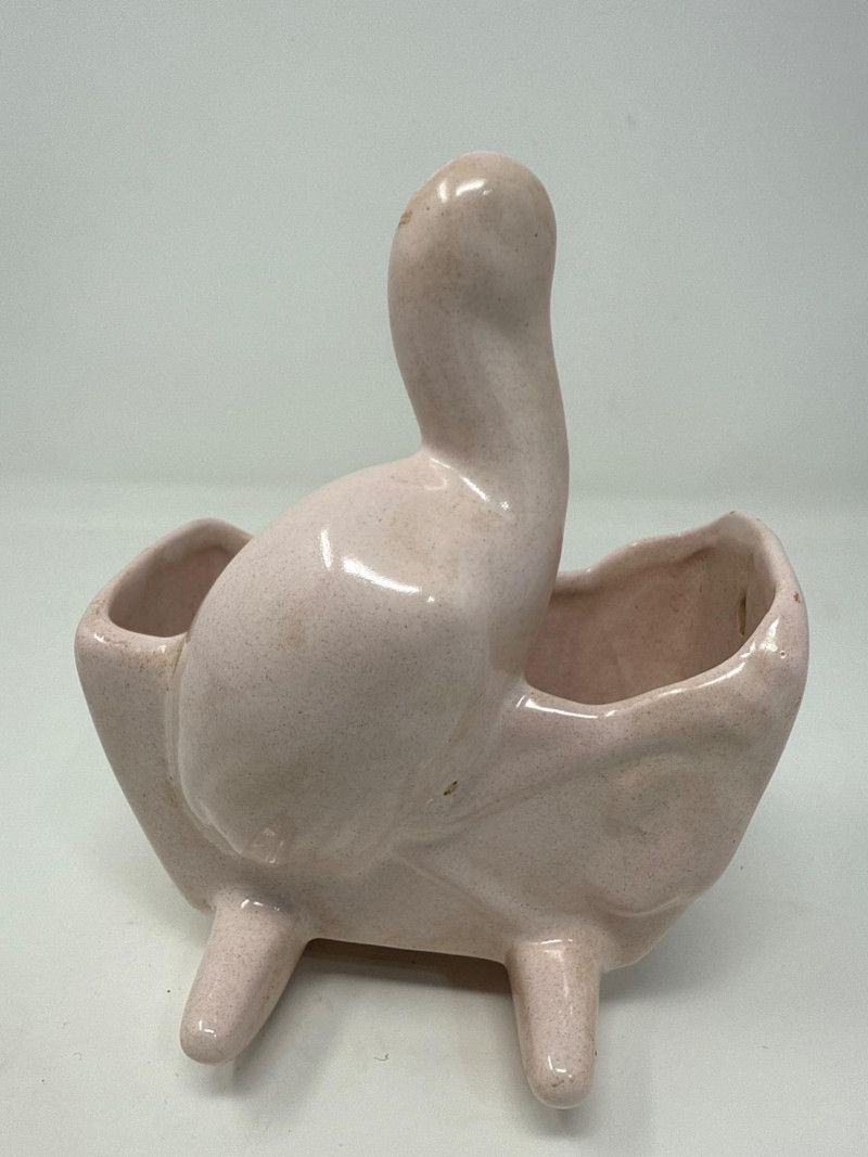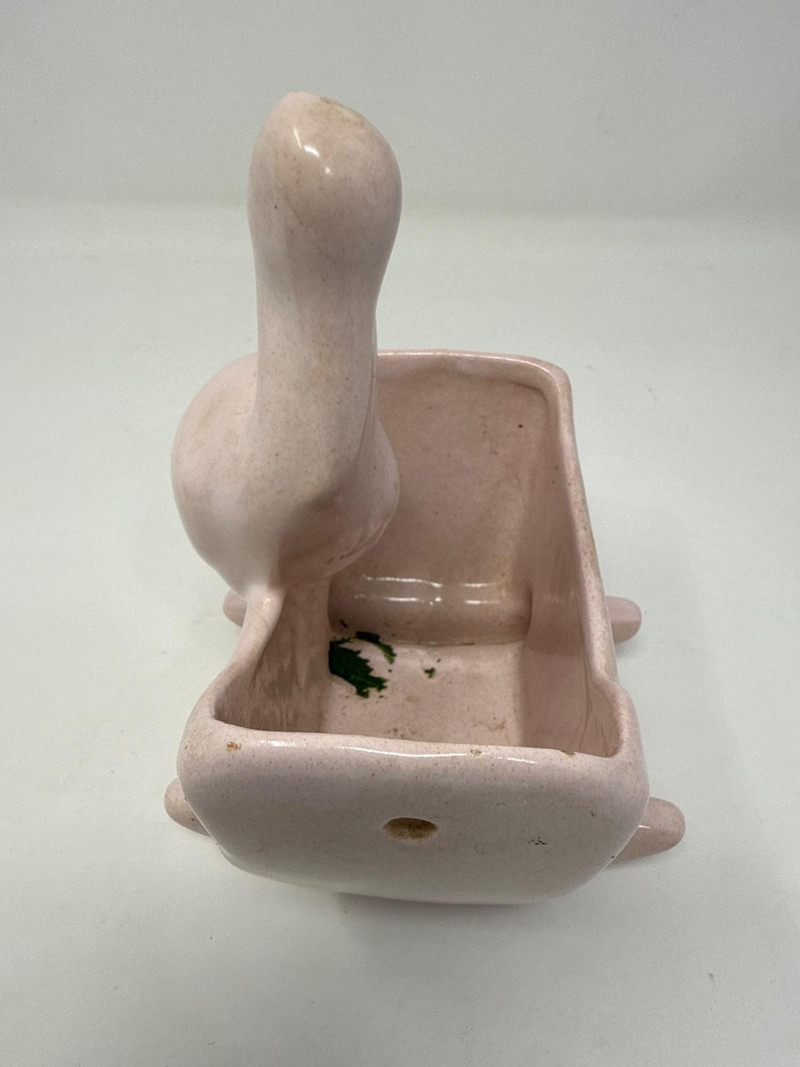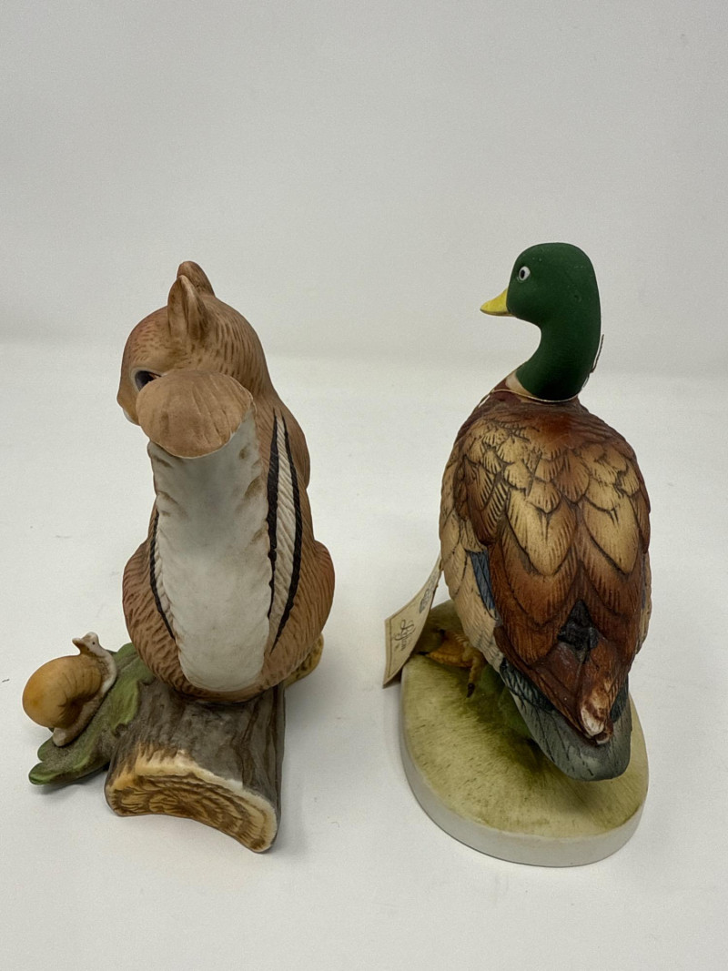 Assorted vintage decorative pieces featuring hand-painted porcelain, mid-century pottery, and solid brass craftsmanship. Each item includes original maker attribution and labeling where applicable. Hand-painted porcelain in naturalistic tones Mark Title: Lefton China – KW214 – Mallard Duck Includes original foil label and hang tag Dimensions: approx. 5.75" H Mid-century ceramic with soft pink glaze Stylized swan form on four short legs Mark Title: Haeger (on original foil label) Dimensions: approx. 6" H Porcelain figurine of chipmunk on log with snail Hand-painted details Mark Title: Homco – 1487 (with logo and foil label) Dimensions: approx. 5" H Solid brass crustacean with segmented body and extended antennae Decorative accent or paperweight Mark Title: Unmarked (no visible maker’s mark) Dimensions: approx. 7.5" LLefton China Mallard Duck Figurine (KW214)