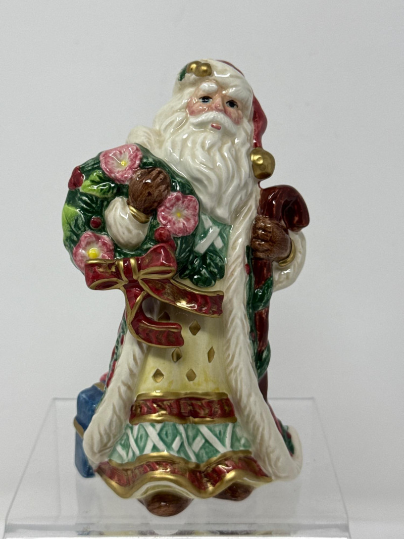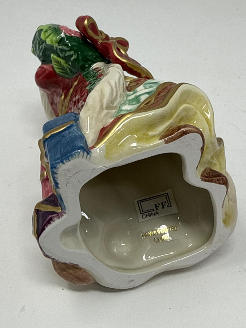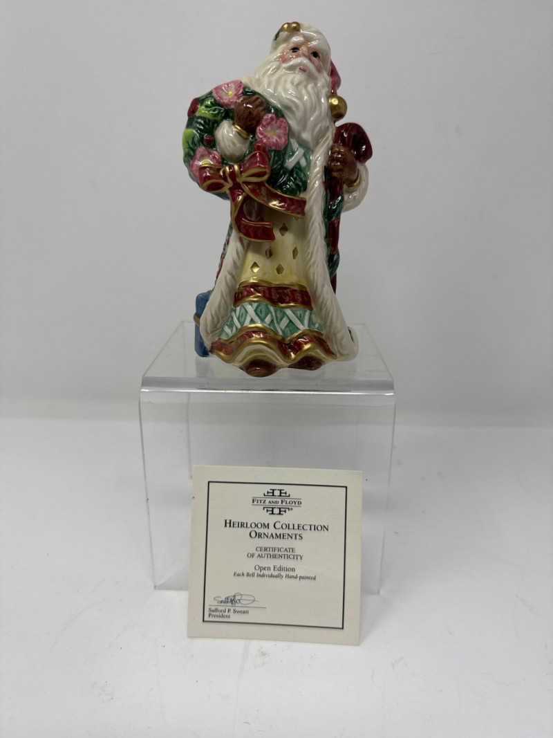 Handcrafted porcelain bell featuring Santa Claus in traditional Christmas attire, adorned with floral garland and gold accents. Marked FF China, Handcrafted in China. A festive heirloom piece from a renowned maker.
