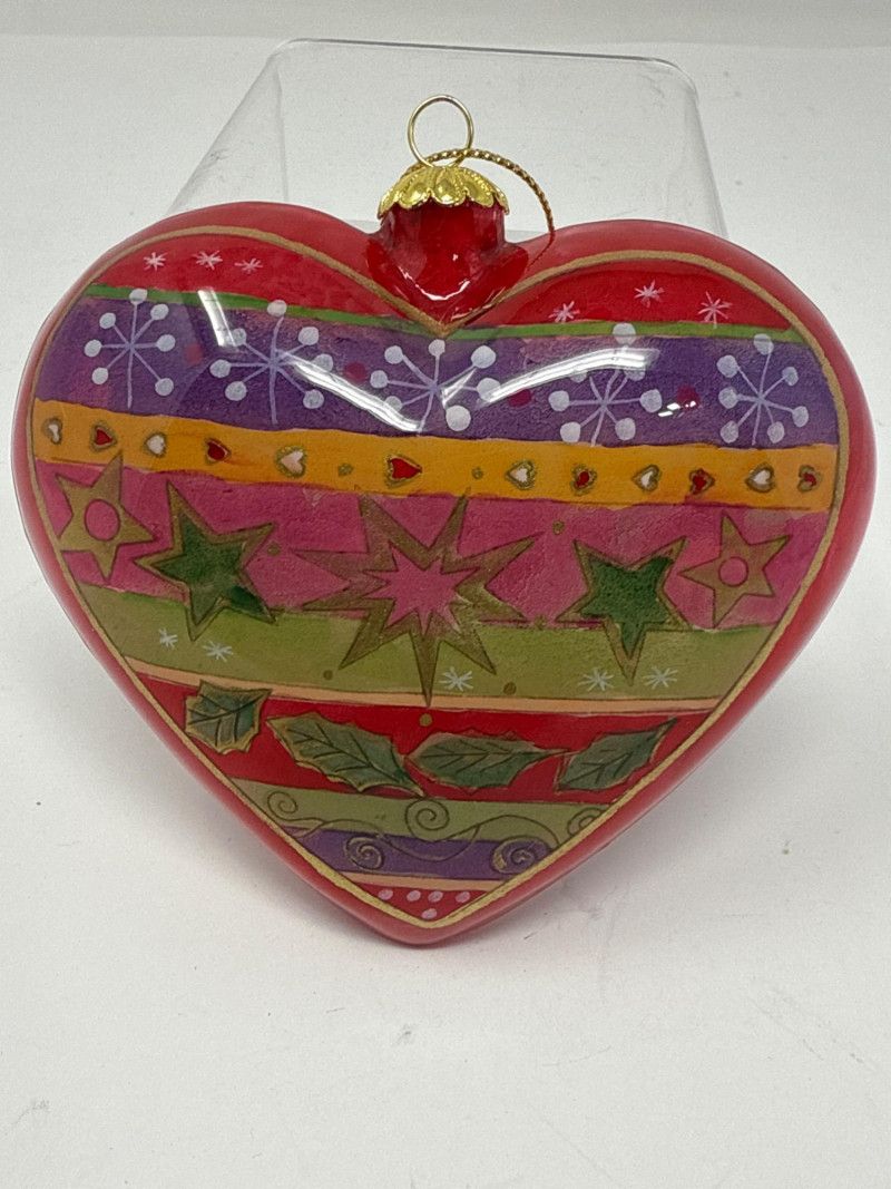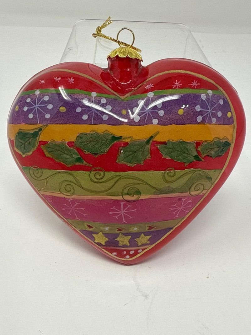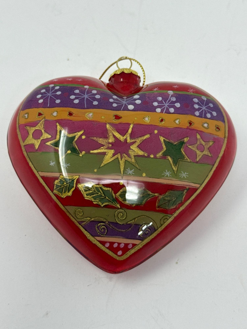 Reverse-painted glass heart featuring holly leaves, stars, and festive motifs in red, green, purple, and gold. Hand-painted from the inside using the signature Li Bien technique.