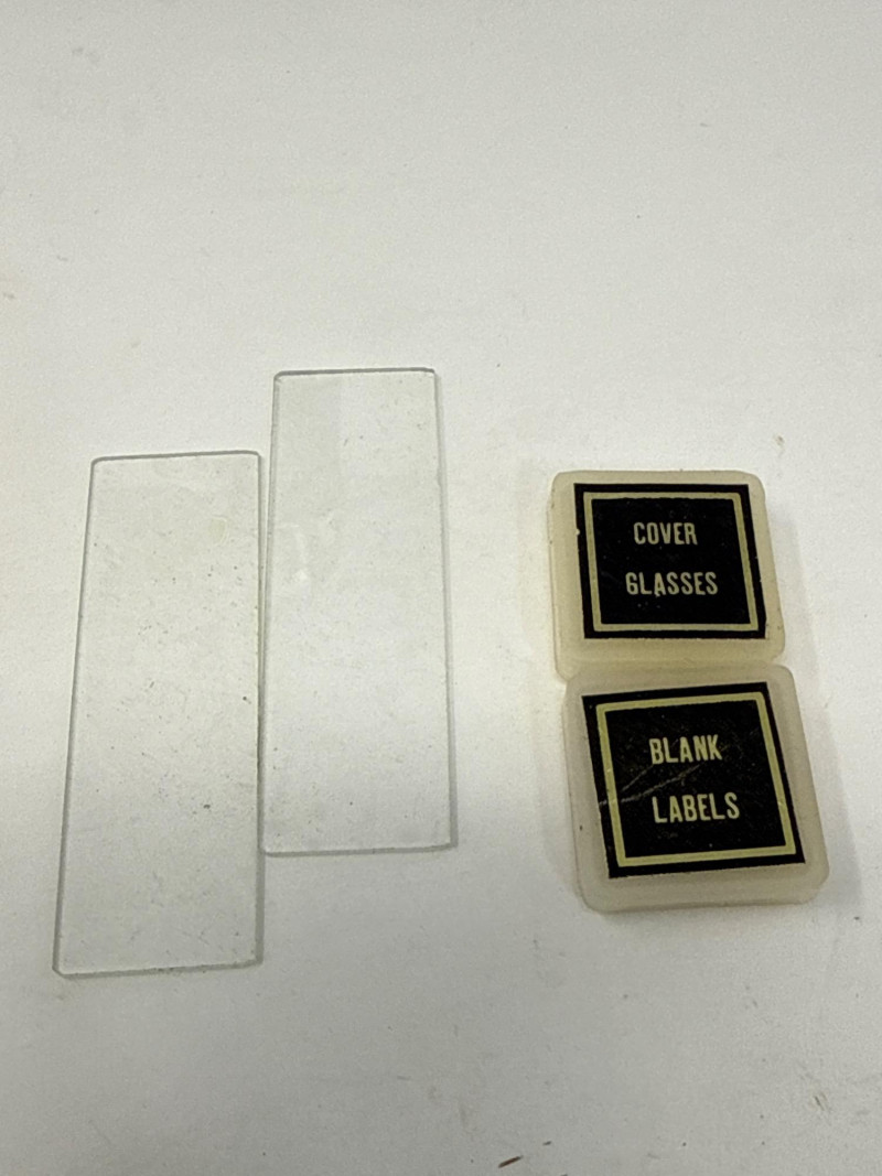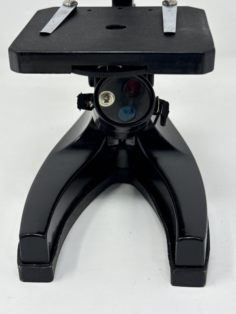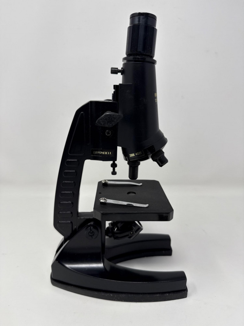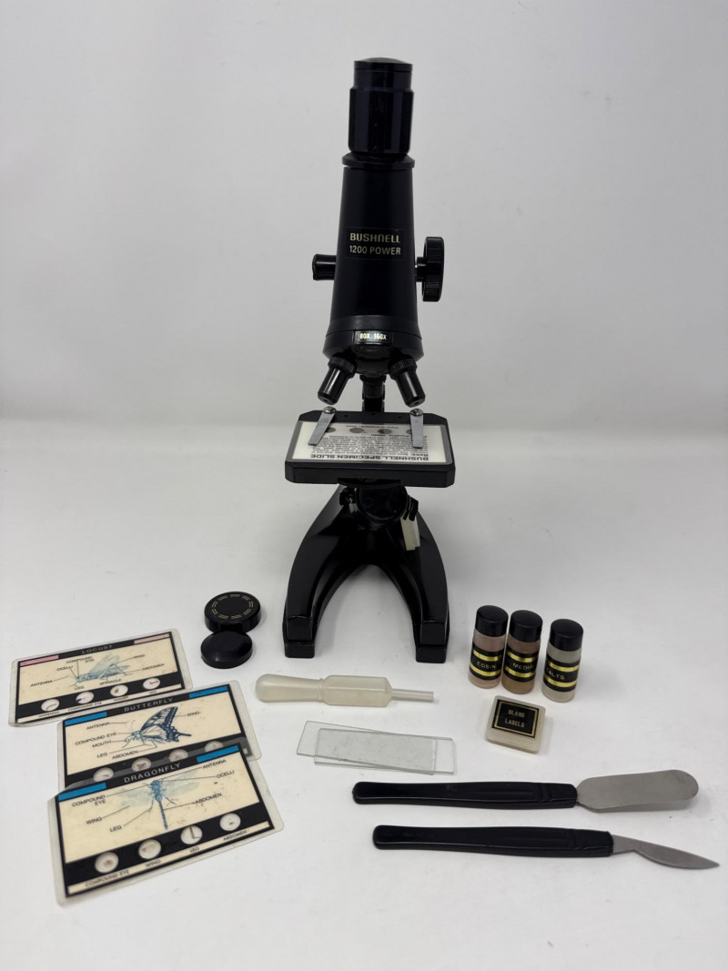 A complete vintage Bushnell 1200 Power microscope set, ideal for collectors of retro educational tools or science-themed décor. This kit includes a black metal microscope with adjustable magnification (200x, 400x, and up to 1200x), paired with original accessories and optical components for specimen preparation and observation. Kit Contents: Bushnell microscope with rotating eyepiece (10x/20x) and slide stage Color filter disc with red and green-blue lenses, mounted on mechanical armature Three sealed reagent vials: Eosin, Media, and Salts Blank labeling kit in original packaging Prepared and blank glass slides Metal tweezers and spatula Magnifying lens and dropper bottle Instructional cards with diagrams and specimen notes Serial label: “Y3991 MADE IN JAPAN” (underscores vintage authenticity) Condition Report: