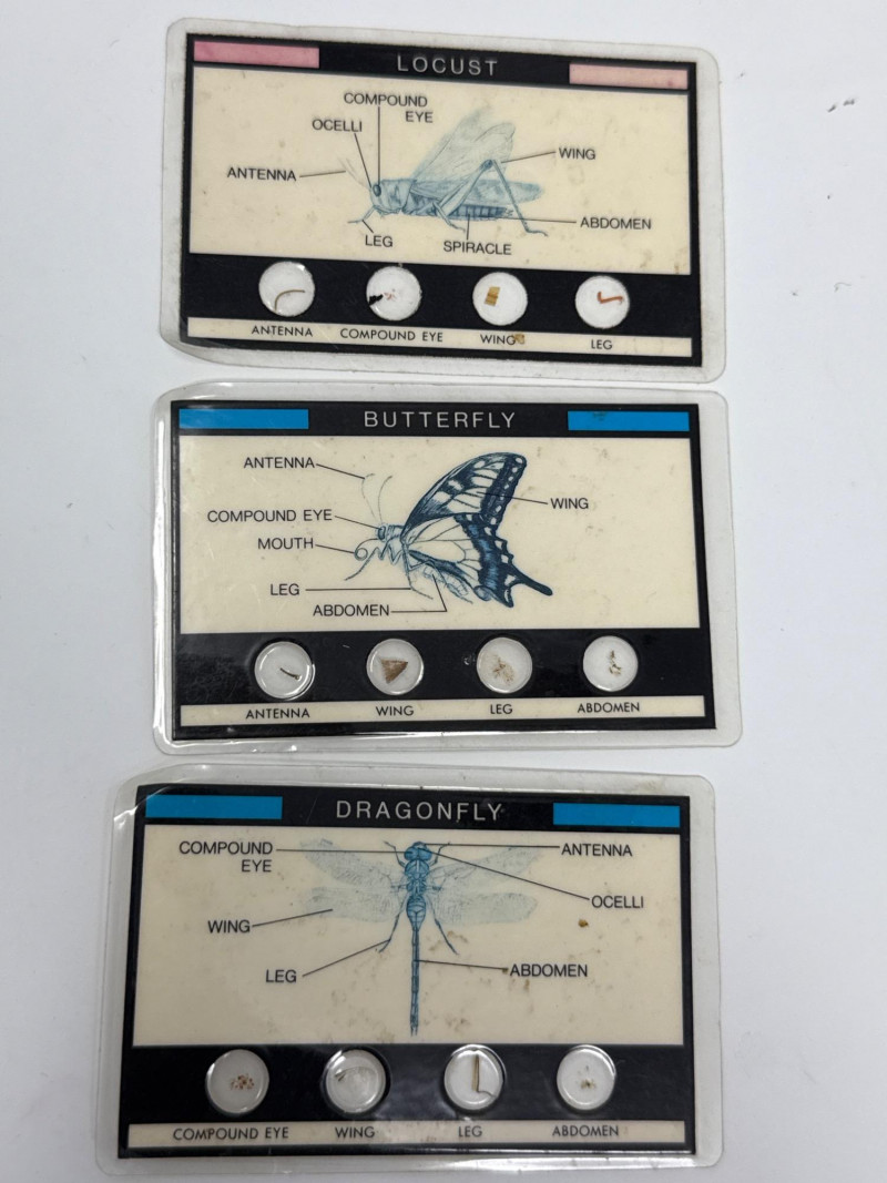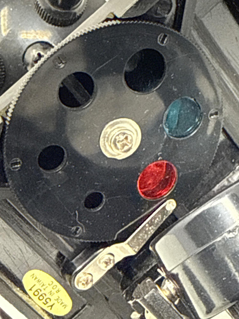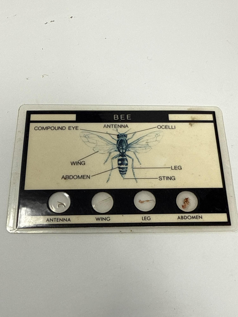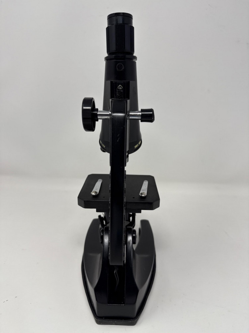 A complete vintage Bushnell 1200 Power microscope set, ideal for collectors of retro educational tools or science-themed décor. This kit includes a black metal microscope with adjustable magnification (200x, 400x, and up to 1200x), paired with original accessories and optical components for specimen preparation and observation. Kit Contents: Bushnell microscope with rotating eyepiece (10x/20x) and slide stage Color filter disc with red and green-blue lenses, mounted on mechanical armature Three sealed reagent vials: Eosin, Media, and Salts Blank labeling kit in original packaging Prepared and blank glass slides Metal tweezers and spatula Magnifying lens and dropper bottle Instructional cards with diagrams and specimen notes Serial label: “Y3991 MADE IN JAPAN” (underscores vintage authenticity) Condition Report: