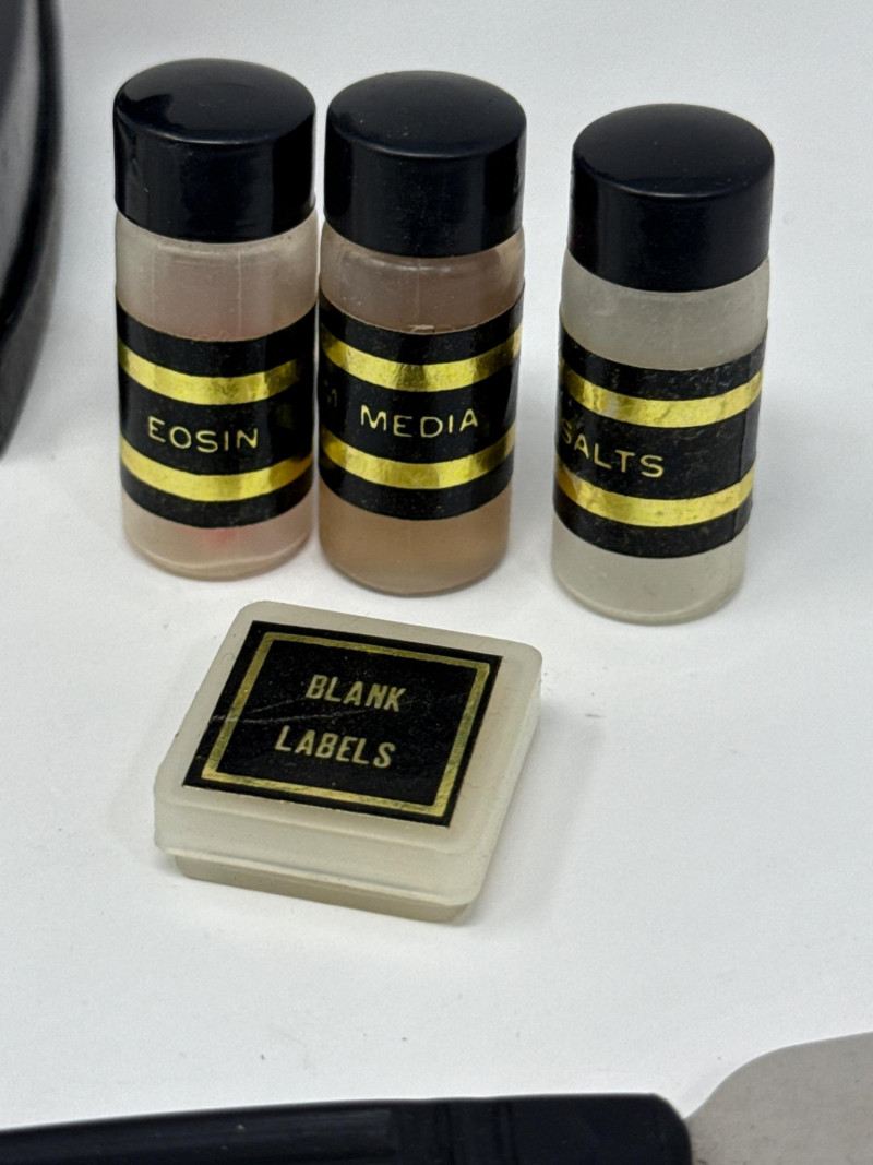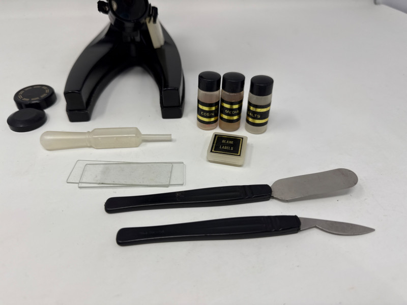 Microscope and accessories show light wear consistent with age. Reagents are sealed; usability not tested. Sold as a collectible display or educational novelty. One knob handle has been broken off, but retained.