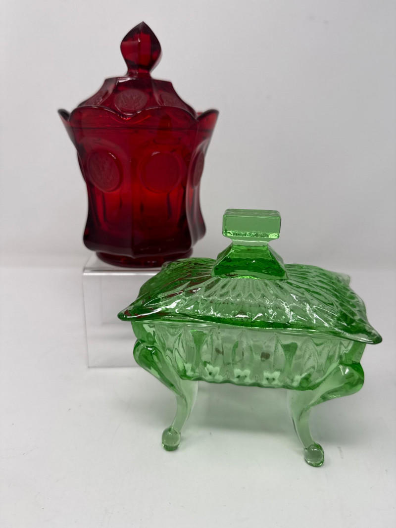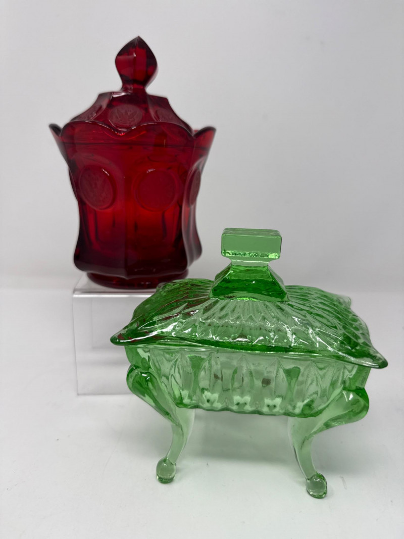 A decorative pairing of two lidded glass dishes, each showcasing vintage-inspired charm. The set includes a mid-century American pressed glass compote in brilliant ruby red, alongside a green pressed glass vanity box with molded leaf-like details and cabriole-style feet. Set Includes: Fostoria Ruby Red Coin Glass Compote (1960s)