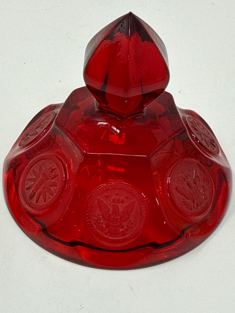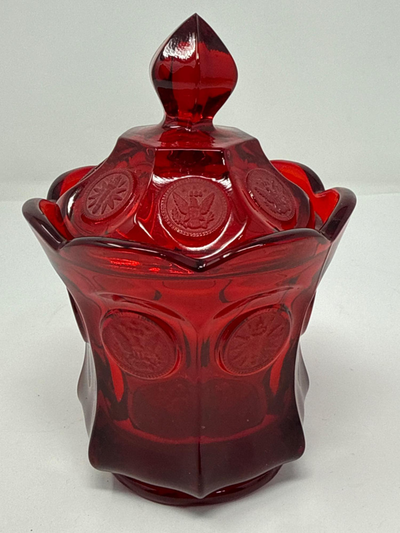 Crafted by Fostoria Glass Company, this lidded candy dish features embossed coin medallions with American eagle and starburst motifs. Designed with a scalloped rim and pointed finial lid, it’s a classic example of mid-20th century American pressed glass.