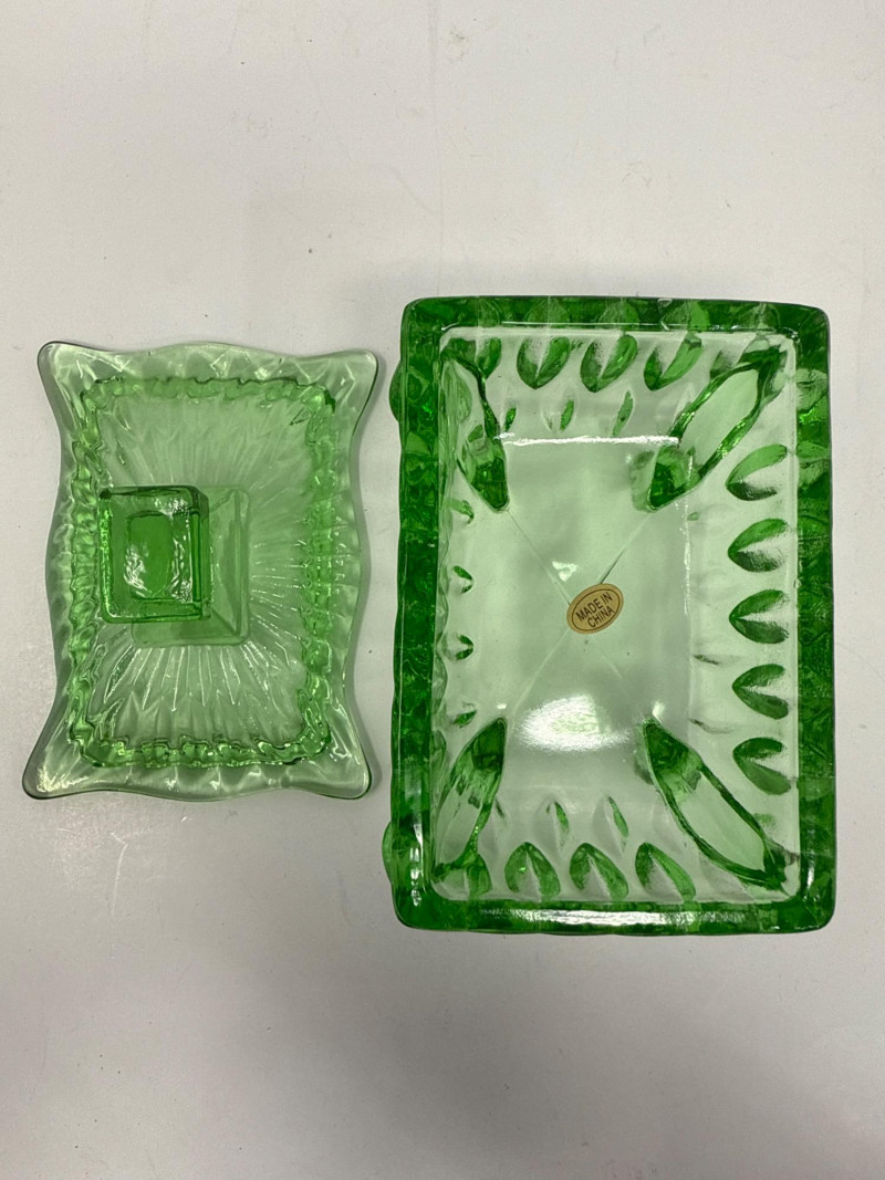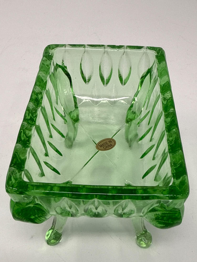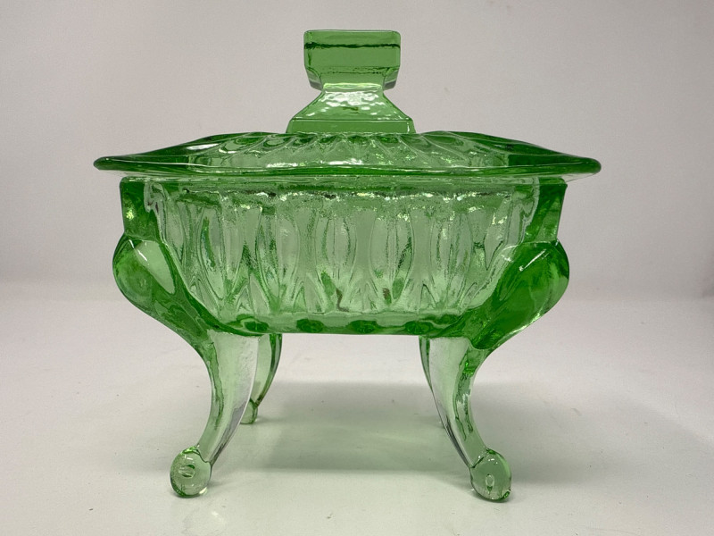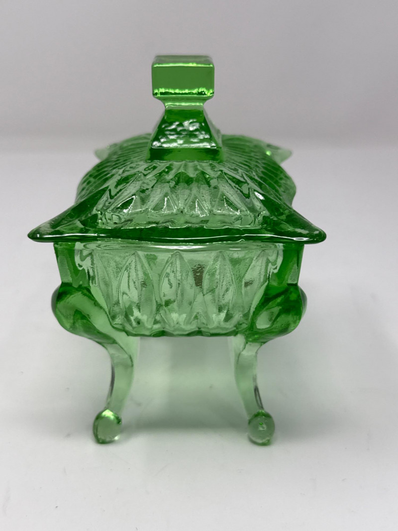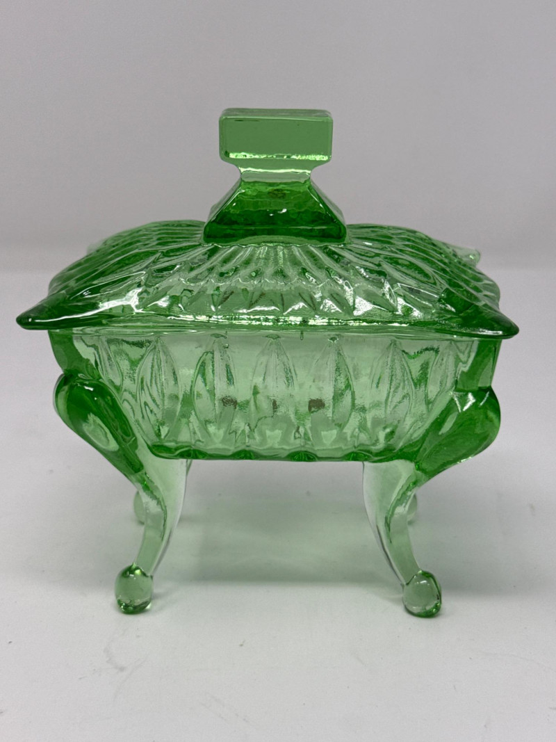 A lidded trinket or candy dish in vibrant green pressed glass, raised on cabriole-style feet with molded leaf-like embellishments. Marked “MADE IN CHINA,” this piece is a later reproduction styled after Depression-era glassware.